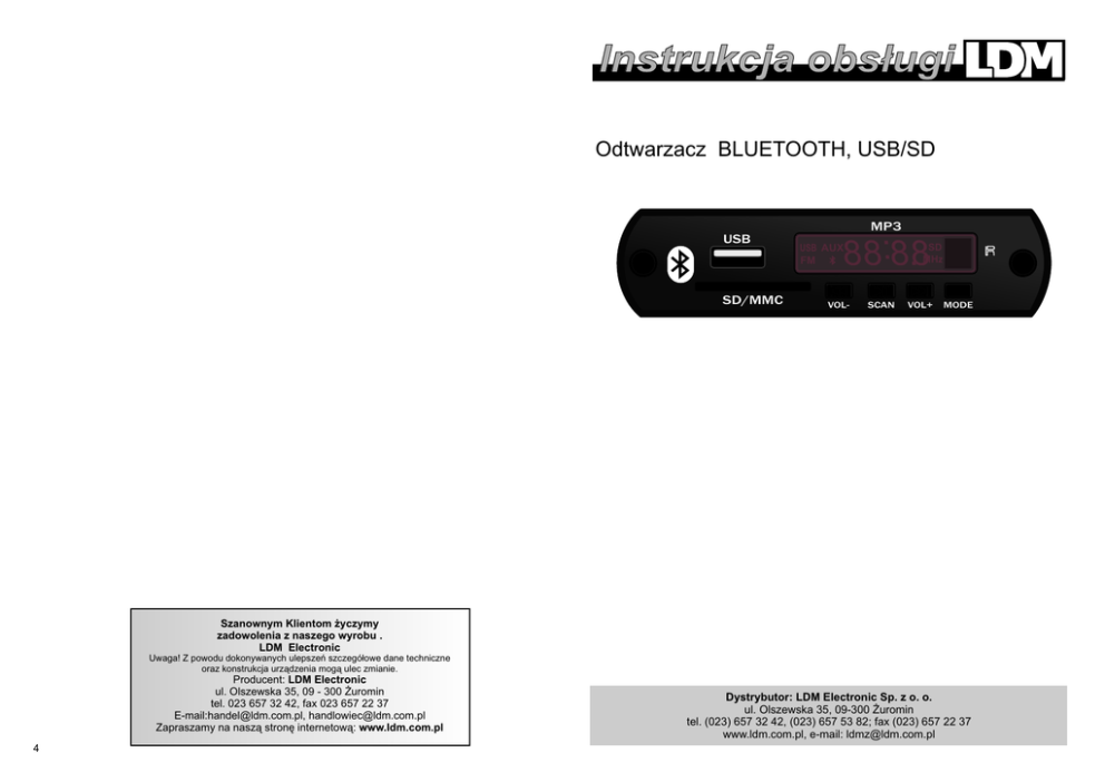 Instrukcja obs³ugi Odtwarzacz BLUETOOTH, USB/SD MP3 USB SD/MMC USB AUX FM 88:8.8 VOL- SD MHz SCAN VOL+ MODE Szanownym Klientom ¿yczymy zadowolenia z naszego wyrobu . LDM Electronic Uwaga! Z powodu dokonywanych ulepszeñ szczegó³owe dane techniczne oraz konstrukcja urz¹dzenia mog¹ ulec zmianie. Producent: LDM Electronic ul. Olszewska 35, 09 - 300 ¯uromin tel. 023 657 32 42, fax 023 657 22 37 E-mail:[email protected], [email protected] Zapraszamy na nasz¹ stronê internetow¹: www.ldm.com.pl 4 Dystrybutor: LDM Electronic Sp. z o. o. ul. Olszewska 35, 09-300 ¯uromin tel. (023) 657 32 42, (023) 657 53 82; fax (023) 657 22 37 www.ldm.com.pl, e-mail: [email protected] 1 OPIS ODTWARZACZA 8 2 1 9 10 MP3 USB USB AUX FM SD/MMC 88:8.8 VOL- SD MHz SCAN VOL+ Mode 11 12 MODE 19 7 1 OPIS ODTWARZACZA EM-045LT 1 Gniazdo USB 2 Wyœwietlacz 3 MODE - S³u¿y do wyboru Ÿród³a z którego bêdzie odtwarzana muzyka (USB,SD/MMC,Bluetooth). Je¿eli w gniazdach USB lub SD/MMC nie bêdzie noœnika, odtwarzacz automatycznie ustawi siê na w tryb Bluetooth 4 Skok do odtwarzania nastêpnego pliku, przytrzymanie powoduje zwiêkszenie g³oœnoœci 5 Start lub zatrzymanie odtwarzania 6 Skok do odtwarzania poprzedniego pliku, przytrzymanie powoduje zmniejeszenie g³oœnoœci 7 Gniazdo kart pamiêci (SD/MMC) 6 5 4 13 14 3 16 Prze³¹cza Ÿród³o z którego ma byæ odtwarzana muzyka (tylko miêdzy USB a SD/MMC) 17 Klawiatura numeryczna. Mo¿liwe jest bezpoœrednie wybranie numeru pliku 18 EQ- Zmienia ustawienia korektora graficznego U¿ytkownik ma do wyboru ustawienie brzmienia typu: POP, ROCK, JAZ, CLASIC, CUT oraz No Eq czyli wy³¹czenie korektora 19 Start lub zatrzymanie odtwarzania 18 EQ U/SD SCAN 0 1 2 3 4 5 6 7 8 9 15 16 17 PILOT ZDALNEGO STEROWANIA 8 W³¹czenie lub wy³¹czenie odtwarzacza 9 MODE - S³u¿y do wyboru Ÿród³a z którego bêdzie odtwarzana muzyka (USB,SD/MMC,Bluetooth). Je¿eli w gniazdach USB lub SD/MMC nie bêdzie noœnika, odtwarzacz automatycznie ustawi siê na w tryb Bluetooth 10 Mute- Wyciszenie odtwarzacza 11 Powrót do odtwarzania poprzedniego pliku 12 Skok do odtwarzania nastêpnego pliku 13 Zmniejszenie g³oœnoœci 14 Zwiêkszenie g³oœnoœci 15 Umo¿liwija wybór trybu odtwarzania: - 1 TR - Odtworzony zostanie tylko wybrany utwór po czym nast¹pi zatrzymanie odtwarzania - ONE - Powtarzany bêdzie tylko wybrany utwór - ALL - Odtworzone zostan¹ wszystkie utwory z noœnika po czym odtwarzanie rozpocznie siê od pocz¹tku 2 3