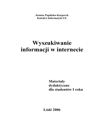 Joanna Papińska-Kacperek Katedra Informatyki UŁ Wyszukiwanie informacji w internecie Materiały dydaktyczne dla studentów I roku Łódź 2006 Wyszukiwanie informacji w internecie Wyszukiwanie informacji w internecie W internecie jest wiele cennych i potrzebnych informacji. Ale stron www jest tak wiele, Ŝe często trudno jest dotrzeć do właściwych i wiarygodnych stron. Trudno jest ustalić ile jest w sieci witryn, portali i stron – łatwiej określić liczbę domen i serwerów. Według badań NEC Research Institute w 1999 roku istniało 800 milionów stron www. W 2002 roku wyszukiwarka Google przechowywała w swoich bazach danych ponad 2 miliardy odnośników1, a w 2005 było ich juŜ 8 miliardów Najlepiej jeŜeli znamy dokładny adres strony z poszukiwanymi wiadomościami, ale niestety tak jest rzadko. Wtedy naleŜy posłuŜyć się dostępnymi narzędziami słuŜącymi do wyszukiwania informacji. Narzędzia wyszukiwania informacji w Internecie Obecnie stosowane są następujące terminy: wyszukiwarki tekstowe, metawyszukiwarki, multiwyszukiwarki, szperacze, szukacze, katalogi stron internetowych oraz silniki. Spróbujmy to uporządkować. Większość uŜytkowników dzieli wszystkie na trzy grupy: katalogi, wyszukiwarki i specjalisyczne bazy danych. Katalogi stron internetowych Jest to jeden z rodzajów organizacji adresów i kategoryzacji stron internetowych. Są to często moderowane ręcznie, grupowane tematycznie, zbiory adresów internetowych. Autorzy stron lub inne osoby zgłaszają swoje strony do katalogów, zazwyczaj z krótkim opisem, po czym, zwykle po przejrzeniu, strona zostaje wpisana na listę pod danym hasłem. Katalog stron jest strukturą drzewiastą: witryny przypisane są, ze względu na swoją zawartość do poszczególnych kategorii, które dzielą się na kategorie podrzędne. W sieci są obecnie katalogi globalne (np. DMOZ, Yahoo), regionalne (np. na dany kraj jak Wirtualna Polska czy Interia), tematyczne (związane z jedną gałęzią przemysłu, np. katalog stron muzycznych cgm2) oraz katalogi firm (np. polska Panorama Firm3). Największym katalogiem jest DMOZ4. Tworzony jest przez ochotników z całego świata (kilkadziesiąt tysięcy osób). Cała treść DMOZ jest dostępna jako open content w pliku XML, i moŜna z niej korzystać w dowolnych celach, pod warunkiem, Ŝe umieści się link powrotny na stronę dmoz (szczegóły licencji na stronie http://dmoz.org/license.html ). 1 A. Łamek Ukryty Internet, Magazyn Internet 7/2002 [6] Gazeta myzyczna cgm.pl http://www.cgm.pl/linkownia 3 Panorama Firm http://www.pf.pl 4 Open Directory Project http://dmoz.org 2 Opracowanie dr inŜ. Joanna Papińska-Kacperek 2 Wyszukiwanie informacji w internecie W 1992 roku z inicjatywy Rafała Maszkowskiego powstał pierwszy katalog stron znajdujących się w polskim internecie, późniejsze "Polskie Zasoby Sieciowe". Dane przedstawione były wówczas w postaci czystego ASCII. Rok później w związku z rozprzestrzenieniem się standardu HTML katalog obsługiwał juŜ linki hipertekstowe. "Polskie Zasoby Sieciowe" zakończyły swoją działalność w roku 1997. A obecnie najbardziej znane to: • polska część Open Directory Project http://www.dmoz.org/World/Polska • Katalog Onet.pl http://katalog.onet.pl • Wirtualna Polska http://katalog.wp.pl • Katalog WOW http://www.wow.pl • Hoga http://www.hoga.pl Wadą katalogów jest mała liczba zawartych w nich stron w porównaniu z innymi narzędziami oraz długi czas aktualizacji. Powodem są ograniczone ludzkie moŜliwości. Strony internetowe powstają, znikają i zmieniają się, a weryfikacja ich zawartości czy obecności wymaga ponownego odwiedzenia ich przez redaktora. Kolejną wadą jest róŜna interpretacja kategori: tę samą stronę dwie osoby mogą umieścić w róŜnych kategoriach. Co moŜe prowadzić do nieporozumień. Na przykład strona poświęcona grze w szachy moŜe zostać umieszczona przez redaktora katalogu w kategorii sport, natomiast szukający tej strony będzie poszukiwał informacji na ten temat w kategorii gry. Wyszukiwarki internetowe Wyszukiwarka internetowa (ang. search engine) to program lub strona internetowa, której zadaniem jest ułatwienie uŜytkownikom internetu znalezienie informacji w sieci. Określenie wyszukiwarka stosujemy do: • stron internetowych serwisów wyszukujących - czyli implementacji oprogramowania wyszukującego działającego z interfejsem WWW ogólnodostępnym dla internautów • oprogramowania przeznaczonego do indeksowania i wyszukiwania informacji w sieciach komputerowych: internecie, intranecie. Wyszukiwarki tworzą automatycznie swoje bazy danych o witrynach. MoŜna podzielić je na te oparte na analizie treści strony (tekstowe) oraz oparte na analizie topologii sieci. Wyszukiwarki tekstowe przeszukują internet analizując zawartość stron. Kiedy uŜytkownik poda zapytanie, wyszukiwarka odpowie mu łączami do stron, które uzna, w zaleŜności od uŜytego algorytmu, za najbardziej odpowiednie. Algorytmy te polegają na informacjach podanych w kodach stron, np. na podanych tytułach, nagłówkach i słowach kluczowych. Są zatem bardzo podatne na naduŜycia, przez co uŜytkownik zamiast uŜytecznych informacji dostaje linki na strony nie mające nic wspólnego z jego zapytaniem. śeby przeciwdziałać temu, wyszukiwarki zaczęły stosować analizę topologii sieci. Wtedy stronę Opracowanie dr inŜ. Joanna Papińska-Kacperek 3 Wyszukiwanie informacji w internecie uwaŜa się za odpowiadającą zapytaniu uŜytkownika, jeśli wiele stron na temat podany w zapytaniu, do niej linkuje. Początkową istotność ustala się na podstawie prostej heurystyki5, po czym zwykle uŜywa się algorytmu losowego skakania po linkach. Pierwszą wyszukiwarką, która zastosowała zaawansowane algorytmy analizy topologii sieci był Google. Wyszukiwarki oparte na analizie topologicznej są często uwaŜane za bardzo odporne na naduŜycia. Ale częstym zjawiskiem są sp