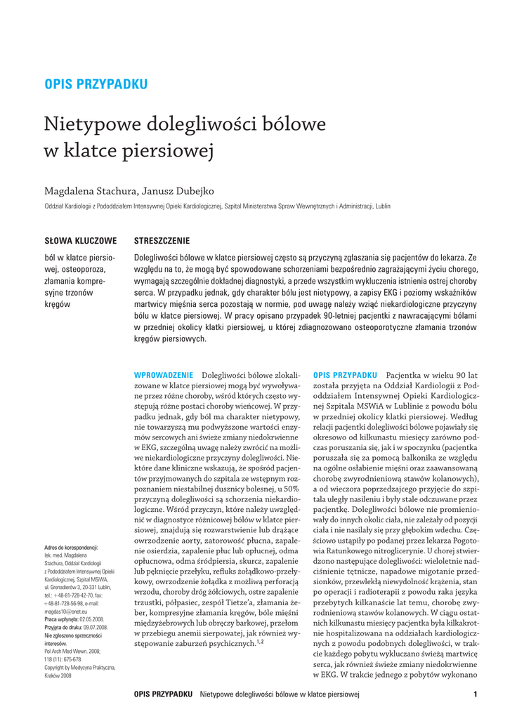 OPIS PRZYPADKU Nietypowe dolegliwości bólowe w klatce piersiowej Magdalena Stachura, Janusz Dubejko Oddział Kardiologii z Pododdziałem Intensywnej Opieki Kardiologicznej, Szpital Ministerstwa Spraw Wewnętrznych i Administracji, Lublin SŁOWA KLUCZOWE STRESZCZENIE ból w klatce piersio wej, osteoporoza, złamania kompre syjne trzonów kręgów Dolegliwości bólowe w klatce piersiowej często są przyczyną zgłaszania się pacjentów do lekarza. Ze względu na to, że mogą być spowodowane schorzeniami bezpośrednio zagrażającymi życiu chorego, wymagają szczególnie dokładnej diagnostyki, a przede wszystkim wykluczenia istnienia ostrej choroby serca. W przypadku jednak, gdy charakter bólu jest nietypowy, a zapisy EKG i poziomy wskaźników martwicy mięśnia serca pozostają w normie, pod uwagę należy wziąć niekardiologiczne przyczyny bólu w klatce piersiowej. W pracy opisano przypadek 90-letniej pacjentki z nawracającymi bólami w przedniej okolicy klatki piersiowej, u której zdiagnozowano osteoporotyczne złamania trzonów kręgów piersiowych. Wprowadzenie Dolegliwości bólowe zlokali- Adres do korespondencji: lek. med. Magdalena Stachura, Oddział Kardiologii z Pododdziałem Intensywnej Opieki Kardiologicznej, Szpital MSiWA, ul. Grenadierów 3, 20-331 Lublin, tel.: +48‑81‑728‑42‑70, fax: +48‑81‑728‑56‑98, e-mail: [email protected] Praca wpłynęła: 02.05.2008. Przyjęta do druku: 09.07.2008. Nie zgłoszono sprzeczności interesów. Pol Arch Med Wewn. 2008; 118 (11): 675-678 Copyright by Medycyna Praktyczna, Kraków 2008 zowane w klatce piersiowej mogą być wywoływane przez różne choroby, wśród których często występują różne postaci choroby wieńcowej. W przypadku jednak, gdy ból ma charakter nietypowy, nie towarzyszą mu podwyższone wartości enzymów sercowych ani świeże zmiany niedokrwienne w EKG, szczególną uwagę należy zwrócić na możliwe niekardiologiczne przyczyny dolegliwości. Niektóre dane kliniczne wskazują, że spośród pacjentów przyjmowanych do szpitala ze wstępnym rozpoznaniem niestabilnej dusznicy bolesnej, u 50% przyczyną dolegliwości są schorzenia niekardiologiczne. Wśród przyczyn, które należy uwzględnić w diagnostyce różnicowej bólów w klatce piersiowej, znajdują się rozwarstwienie lub drążące owrzodzenie aorty, zatorowość płucna, zapalenie osierdzia, zapalenie płuc lub opłucnej, odma opłucnowa, odma śródpiersia, skurcz, zapalenie lub pęknięcie przełyku, refluks żołądkowo-przełykowy, owrzodzenie żołądka z możliwą perforacją wrzodu, choroby dróg żółciowych, ostre zapalenie trzustki, półpasiec, zespół Tietze’a, złamania żeber, kompresyjne złamania kręgów, bóle mięśni międzyżebrowych lub obręczy barkowej, przełom w przebiegu anemii sierpowatej, jak również występowanie zaburzeń psychicznych.1,2 Opis przypadku Pacjentka w wieku 90 lat została przyjęta na Oddział Kardiologii z Pododdziałem Intensywnej Opieki Kardiologicznej Szpitala MSWiA w Lublinie z powodu bólu w przedniej okolicy klatki piersiowej. Według relacji pacjentki dolegliwości bólowe pojawiały się okresowo od kilkunastu miesięcy zarówno podczas poruszania się, jak i w spoczynku (pacjentka poruszała się za pomocą balkonika ze względu na ogólne osłabienie mięśni oraz zaawansowaną chorobę zwyrodnieniową stawów kolanowych), a od wieczora poprzedzajcego przyjęcie do szpitala uległy nasileniu i były stale odczuwane przez pacjentkę. Dolegliwości bólowe nie promieniowały do innych okolic ciała, nie zależały od pozycji ciała i nie nasilały się przy głębokim wdechu. Częściowo ustąpiły po podanej przez lekarza Pogotowia Ratunkowego nitroglicerynie. U chorej stwierdzono następujące dolegliwości: wieloletnie nadciśnienie tętnicze, napadowe migotanie przedsionków, przewlekłą niewydolność krążenia, stan po operacji i radioterapii z powodu raka języka przebytych kilkanaście lat temu, chorobę zwyrodnieniową stawów kolanowych. W ciągu ostatnich kilkunastu miesięcy pacjentka była kilkakrotnie hospitalizowana na oddziałach kardiologicznych z powodu podobnych dolegliwości, w trakcie każdego pobytu wykluczano świeżą martwicę serca, jak również świeże zmiany niedokrwienne w EKG. W trakcie jednego z pobytów wykonano OPIS PRZYPADKU Nietypowe dolegliwości bólowe w klatce piersiowej 1 również w trybie pilnym tomografię komputerową aorty piersiowej, która wykazała jedynie obecność uwapnionych blaszek w ścianach aorty oraz powiększoną w całości sylwetkę serca. Szerokość aorty była w normie, bez cech rozwarstwienia. Przewlekle pacjentka przyjmowała: furosemid, losartan potasu, monoazotan izosorbidu, molsidominę, werapamil i preparat potasu, w trakcie poprzedniej hospitalizacji do leczenia włączono również inhibitor pompy protonowej. Wyniki badania przedmiotowego pacjentki były następujące: stan ogólny dość dobry, stan odżywienia prawidłowy, tarczyca niepowiększona, częstotliwość rytmu serca niemiarowa, 102/min z deficytem tętna na obwodzie, cichy szmer skurczowy w miejscu osłuchiwania zastawki mitralnej, nad płucami osłuchowo u podstawy obustronnie pojedyncze trzeszczenia. Tętno na obwodzie było niemiarowe, o częstości 95/min, prawidłowo napięte i wypełnione. Gruczoły sutkowe obustronnie nie wykazywały zmian palpacyjnych, brzuch był miękki, niebolesny, obecne były nieznaczne obrzęki w okolicy kostek kończyn dolnych i podudzi. Ciśnienie tętnicze na lewej kończynie górnej miało wartość 130/75 mm Hg, na prawej 125/70 mm Hg. Na podstawie wykonanego EKG stwierdzono: szybkie migotanie przedsionków, lewogram, pośrednie położenie serca, cechy niedokrwienia podwsierdziowego w odprowadzeniach I, aVL, V5, V6. W badaniach laboratoryjnych wykluczono świeżą martwicę serca. Pozostałe wyniki badań laboratoryjnych: morfologia krwi obwodowej – parametry w normie, OB po godzinie –