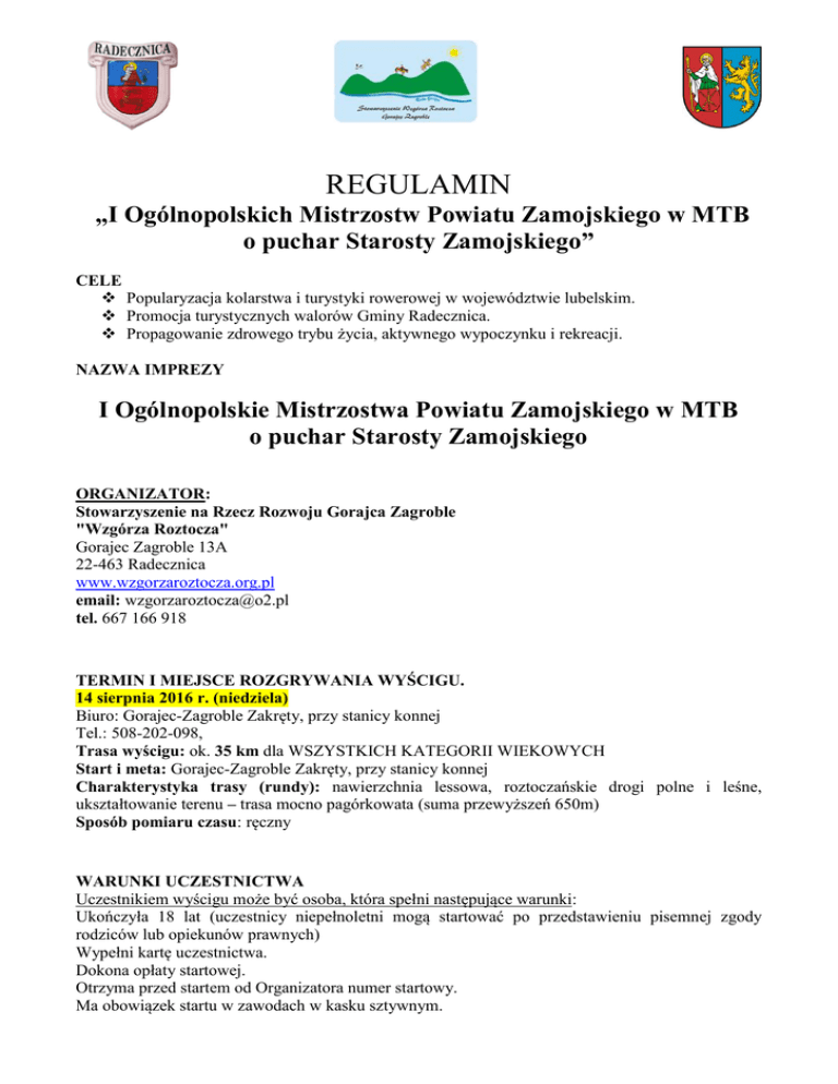 REGULAMIN „I Ogólnopolskich Mistrzostw Powiatu Zamojskiego w MTB o puchar Starosty Zamojskiego” CELE Popularyzacja kolarstwa i turystyki rowerowej w województwie lubelskim. Promocja turystycznych walorów Gminy Radecznica. Propagowanie zdrowego trybu życia, aktywnego wypoczynku i rekreacji. NAZWA IMPREZY I Ogólnopolskie Mistrzostwa Powiatu Zamojskiego w MTB o puchar Starosty Zamojskiego ORGANIZATOR: Stowarzyszenie na Rzecz Rozwoju Gorajca Zagroble "Wzgórza Roztocza" Gorajec Zagroble 13A 22-463 Radecznica www.wzgorzaroztocza.org.pl email: [email protected] tel. 667 166 918 TERMIN I MIEJSCE ROZGRYWANIA WYŚCIGU. 14 sierpnia 2016 r. (niedziela) Biuro: Gorajec-Zagroble Zakręty, przy stanicy konnej Tel.: 508-202-098, Trasa wyścigu: ok. 35 km dla WSZYSTKICH KATEGORII WIEKOWYCH Start i meta: Gorajec-Zagroble Zakręty, przy stanicy konnej Charakterystyka trasy (rundy): nawierzchnia lessowa, roztoczańskie drogi polne i leśne, ukształtowanie terenu – trasa mocno pagórkowata (suma przewyższeń 650m) Sposób pomiaru czasu: ręczny WARUNKI UCZESTNICTWA Uczestnikiem wyścigu może być osoba, która spełni następujące warunki: Ukończyła 18 lat (uczestnicy niepełnoletni mogą startować po przedstawieniu pisemnej zgody rodziców lub opiekunów prawnych) Wypełni kartę uczestnictwa. Dokona opłaty startowej. Otrzyma przed startem od Organizatora numer startowy. Ma obowiązek startu w zawodach w kasku sztywnym. Zgłoszenia uczestników przyjmowane będą telefonicznie pod nr tel. 84-68-26-856, mailowo [email protected] oraz w dniu zawodów u sędziego zawodów bezpośrednio przed startem. ZGŁOSZENIA I PROGRAM ZAWODÓW a. Prawo startu w wyścigu mają osoby które ukończyły 18 lat. Osoby w wieku 16-18 lat mogą startować za pisemną zgodą rodzica lub opiekuna prawnego lub osoby sprawującej opiekę w czasie trwania wyścigu (podpis na formularzu zgłoszeniowym) - posiadającej pisemne oświadczenie rodzica/ opiekuna prawnego, wyrażające zgodę, na udział nieletniego dziecka w wyścigach (według wzoru oświadczenia (opublikowanego na stronie internetowej www.wzgorzaroztocza.org.pl (stanowiącego załącznik do niniejszego Regulaminu). Osoby poniżej 16-go roku życia nie mogą brać udziału w zawodach. b. Każdy uczestnik startuje na własną odpowiedzialność (w przypadku zawodników niepełnoletnich na wyłączną odpowiedzialność rodzica lub prawnego opiekuna). c. Dopuszcza się do uczestnictwa w zawodach wyłącznie osoby posiadające dobry stan zdrowia, nie posiadające przeciwwskazań medycznych do uczestnictwa w zawodach. Ten fakt uczestnik potwierdzi własnoręcznym podpisem na formularzu zgłoszeniowym przygotowanym przez Organizatora W przypadku osób niepełnoletnich potwierdzenie dobrego stanu zdrowia, braku przeciwwskazań medycznych oraz wyrażenie zgody na udział w zawodach potwierdza na formularzu zgłoszeniowym lub stosownym oświadczeniu własnoręcznym podpisem rodzic lub opiekun prawny nieletniego zawodnika. d. Każdy zawodnik ma obowiązek startu w kasku sztywnym. Zaleca się posiadanie ubezpieczenia OC i NNW. e. Każdy z zawodników otrzyma tzw. pakiet startowy: numer startowy, gadżety, upominki, foldery i inne materiały reklamowe i promocyjne Organizatora i sponsorów, baton energetyczny, posiłek regeneracyjny. f. Numer startowy należy zwrócić w Biurze Zawodów po zakończeniu zawodów. g. Zawodnicy zobowiązani są do przestrzegania przepisów niniejszego regulaminu oraz zapoznania się z trasą wyścigu a w szczególności przestrzeganie przepisów prawo o ruchu drogowym. h. Zgłoszenie jest jednocześnie oświadczeniem o zapoznaniu się uczestnika zawodów z treścią regulaminu i akceptacją jego warunków. i. Zagubienie numeru startowego powinno zostać zgłoszone Sędziemu Głównemu na mecie. j. Zawodnik zobowiązuje się do pokrycia wszelkich kosztów poniesionych przez organizatora z winy uczestnika zawodów, w szczególności wynikłych ze zignorowania polecenia organizatora, bądź kosztów ewakuacji wywołanej niezawinioną przez organizatora niedyspozycją zawodnika. „I Ogólnopolskie Mistrzostwa Powiatu Zamojskiego w MTB o puchar Starosty Zamojskiego” jest imprezą sportowo-rekreacyjną rozgrywanych na rowerach MTB. W terminie do 12 sierpnia 2016 r. – zgłoszenia telefonicznie pod nr tel. 84-68-26-856 lub mailowo na adres: [email protected] W dniu zawodów (14.08.2016 r.) potwierdzenie w/w zgłoszeń oraz zgłoszenia pozostałych zawodników: godzina 9:00 – 10:30 godzina 10:40 – 10:55 zapisy w Biurze Zawodów Ustawienie uczestników na starcie godzina 10:55 – 11:00 godzina 11:00 godzina 12:30 godzina 14:00 godzina 14:05 Odprawa techniczna Start: Gorajec-Zagroble-Zakręty – wszystkie grupy wiekowe Meta Gorajec-Zagroble-Zakręty Zamknięcie trasy Dekoracja (Gorajec-Zagroble-Zakręty) KATEGORIE WIEKOWE Mężczyźni: 1. Kategoria J – od 16 do 18 lat (rok ur. 1998-2000), 2. Kategoria ELITE - od 19 do 29 lat (rok ur. 1987-97), 3. Kategoria M I- od 30 do 39 lat (rok ur. 1977-86), 4. Kategoria M II - od 40 do 49 lat (rok ur. 1967-76). 5. Kategoria M III - od 50 do 59 lat (rok ur. 1957-66) 6. Kategoria M IV – 60 lat i starsi (rok ur. 1956 i starsi) Kobiety: 7. Jedna kategoria wiekowa kobiet (K) niezależnie od roku urodzenia. * W przypadku małej liczby zgłoszeń w danej kategorii – organizator zastrzega sobie prawo łączenia grup wiekowych (dot. dekoracji). ZASADY ROZGRYWANIA WYŚCIGU Start wspólny. Trasa oznakowana (tabliczki, szarfy). Ręczny pomiar czasu. Szczegółowe informacje będą udzielane na odprawie technicznej przed startem. Zawodnik, który nie dojedzie do mety do godziny 14:00 nie zostanie sklasyfikowany (DNF). Informacje dotyczące wyników i klasyfikacji zawodników będą podawane w biurze zawodów a następnie na stronie internetowej Stowarzyszenia: www.wzgorzaroztocza.org.pl ZASADY PORUSZANIA SIĘ PO TRASIE Trasa wyścigu nie ma części wspólnych z drogami utwardzonymi i asfaltowymi. Uczes