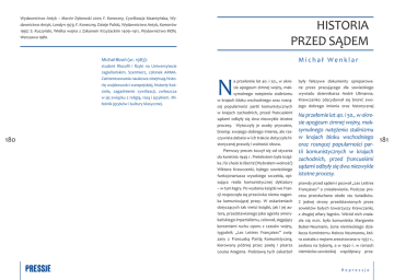 Wydawnictwo Antyk – Marcin Dybowski 2001; F. Koneczny, Cywilizacja bizantyńska, Wydawnictwo Antyk, Londyn 1973; F. Koneczny, Dzieje Polski, Wydawnictwo Antyk, Komorów 1997; S. Kuczyński, Wielka wojna z Zakonem Krzyżackim 1409–1411, Wydawnictwo MON, Warszawa 1980. HISTORIA PRZED SĄDEM Michał Wenklar Michał Bizoń (ur. 1983): student filozofii i fizyki na Uniwersytecie Jagiellońskim. Szermierz, członek ARMA. Zainteresowania naukowe obejmują historię wojskowości europejskiej, historię Kościoła, zagadnienie cywilizacji, zwłaszcza w jej związku z religią, rasą i językiem. Miłośnik języków i kultury klasycznej. 180 N a przełomie lat 40. i 50., w okresie apogeum zimnej wojny, maksymalnego natężenia stalinizmu w krajach bloku wschodniego oraz rosnącej popularności partii komunistycznych w krajach zachodnich, przed francuskimi sądami odbyły się dwa niezwykle istotne procesy. Wytoczyły je osoby prywatne, broniąc swojego dobrego imienia, ale rzeczywista debata w ich trakcie dotyczyła historycznej prawdy i wolności słowa. Pierwszy proces toczył się od stycznia do kwietnia 1949 r. Pretekstem była książka J’ai choisi la liberté (Wybrałem wolność) Wiktora Krawczenki, byłego sowieckiego funkcjonariusza wysokiego szczebla, opisująca realia komunistycznej dyktatury – w tym łagry. Po wydaniu książki we Francji rozpoczęła się przeciwko niemu nagonka komunizującej prasy. W oskarżeniach dotyczących tak treści książki, jak i jej autora, przedstawianego jako agenta amerykańskiego imperializmu, celował, sięgający korzeniami ruchu oporu z czasów wojny, tygodnik „Les Lettres Françaises” związany z Francuską Partią Komunistyczną, kierowany później przez poetę i pisarza Louisa Aragona. Podstawą tych oskarżeń były fałszywe dokumenty spreparowane przez pracującego dla sowieckiego wywiadu dziennikarza André Ullmanna. Krawczenko zdecydował się bronić swojego dobrego imienia oraz historycznej Na przełomie lat 40. i 50., w okresie apogeum zimnej wojny, maksymalnego natężenia stalinizmu w krajach bloku wschodniego oraz rosnącej popularności partii komunistycznych w krajach zachodnich, przed francuskimi sądami odbyły się dwa niezwykle istotne procesy. prawdy przed sądem i pozwał „Les Lettres Françaises” o zniesławienie. Podczas procesu przesłuchano około stu świadków. Z jednej strony przedstawionych przez sowietów byłych towarzyszy Krawczenki, z drugiej ofiary łagrów. Wśród nich znalazła się m.in. była komunistka Margarete Buber-Neumann, żona niemieckiego działacza Kominternu Heinza Neumanna, która została z mężem aresztowana w 1937 r., zesłana na Syberię, a w 1940 r. w ramach niemiecko-sowieckiej współpracy prze- Repressje 181 182 kazana do Rzeszy, gdzie trafiła do obozu koncentracyjnego w Ravensbrück. Po wojnie opublikowała zaś książkę Als Gefangene bei Stalin und Hitler (Więźniowie Hitlera i Stalina). Było to jedno z wymownych świadectw osoby, która doświadczyła okrucieństwa obu totalitarnych systemów. Między innymi dzięki jej zeznaniom Krawczenko i udokumentowanie istnienia w przodującym kraju socjalizmu – w którym wielu intelektualistów upatrywało niedoścignionego wzoru – systemu koncentracyjnego o niemal identycznych cechach jak hitlerowski. Po raz pierwszy we Francji użyto wówczas w publicznej debacie określenia Gułag. W październiku 1950 r. rzeczywiście w kwietniu 1949 r. proces wygrał, otrzymując symboliczne odszkodowanie. Dugi proces trwał od listopada 1950 do stycznia 1951 r. Jedną stroną znów był tygodnik „Les Lettres Françaises”, drugą zaś Dawid Rousset, związany niegdyś z trockizmem intelektualista. Po doświadczeniach obozu w Buchenwaldzie, do którego Rousset trafił za działalność w trockistowskim ruchu oporu, napisał on książkę L’Univers concentrationnaire (Świat koncentracyjny). Zdobył nią uznanie paryskiej elity, stając się znanym pisarzem. Z Jean-Paulem Sartrem stworzył zaś niewielkie polityczne ugrupowanie – Zgromadzenie DemokratycznoRewolucyjne. Przetrwało ono tylko rok, bo Sartre zbliżył się do komunistów, a Rousset myślał o „trzeciej sile” między komunizmem a gaullizmem. Badając zagadnienie systemu obozów koncentracyjnych, Rousset zetknął się z problemem łagrów sowieckich i wbrew wielu innym nie zgodził się na jego przemilczanie, na pozostawianie w społecznej świadomości hitlerowskiej Rzeszy jako jedynego sprawcy zbrodni tego typu. 12 listopada 1949 r. Rousset wezwał więźniów byłych nazistowskich obozów, by stworzyli zespół badawczy zajmujący się również kwestią sowieckich łagrów. Jego celem było sprawdzenie udało się powołać Międzynarodową Komisję do spraw Systemu Koncentracyjnego, która pod przewodnictwem Rousseta działać będzie aż do 1959 r. Ale jeszcze przed jej powstaniem, w lutym 1950 r., Rousset opublikował w literackim dodatku dziennika „Le Figaro” apel o nadsyłanie wspomnień przez byłych łagierników. Opatrzony był tytułem Dochodzenie w sprawie obozów sowieckich. Kto jest gorszy, Szatan czy Belzbub? Po tych działaniach Rousset stał się dla lewicowej elity politycznej oraz intelektualnej we Francji zdrajcą i renegatem. Obelgi i oszczerstwa padały na niego ze strony komunistycznej prasy, ale i z mównicy francuskiego parlamentu, Zgromadzenia Narodowego. Pamiętajmy, że okres ten stanowił apogeum siły Francuskiej Partii Komunistycznej, która w pierwszych powojennych wyborach osiągnęła drugie miejsce, zdobywając ponad jedną czwartą głosów, a nakład komunistycznego dziennika „L’Humanité” wynosił wówczas ok. 250 tysięcy egzemplarzy. Rousset nie zgodził się na płynące z mediów pomówienia i postanowił wytoczyć proces o zniesławienie pismu „Les Lettres Françaises”, nazywającemu go trockistowskim fałszerzem. W 1951 r. proces ten wygrał. Świadkiem na obu procesach był Józef Czapski, autor Na ni