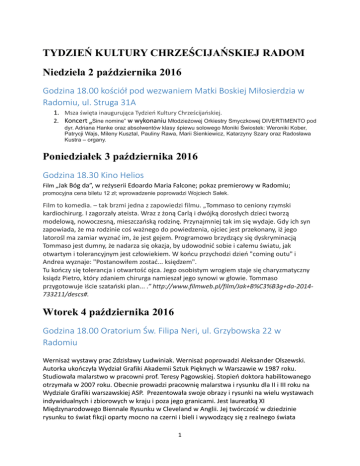 TYDZIEŃ KULTURY CHRZEŚCIJAŃSKIEJ RADOM Niedziela 2 października 2016 Godzina 18.00 kościół pod wezwaniem Matki Boskiej Miłosierdzia w Radomiu, ul. Struga 31A 1. Msza święta inaugurująca Tydzień Kultury Chrześcijańskiej. 2. Koncert „Sine nomine” w wykonaniu Młodzieżowej Orkiestry Smyczkowej DIVERTIMENTO pod dyr. Adriana Hanke oraz absolwentów klasy śpiewu solowego Moniki Świostek: Weroniki Kober, Patrycji Wajs, Mileny Kusztal, Pauliny Rawa, Marii Sienkiewicz, Katarzyny Szary oraz Radosława Kustra – organy. Poniedziałek 3 października 2016 Godzina 18.30 Kino Helios Film „Jak Bóg da”, w reżyserii Edoardo Maria Falcone; pokaz premierowy w Radomiu; promocyjna cena biletu 12 zł; wprowadzenie poprowadzi Wojciech Sałek. Film to komedia. – tak brzmi jedna z zapowiedzi filmu. „Tommaso to ceniony rzymski kardiochirurg. I zagorzały ateista. Wraz z żoną Carlą i dwójką dorosłych dzieci tworzą modelową, nowoczesną, mieszczańską rodzinę. Przynajmniej tak im się wydaje. Gdy ich syn zapowiada, że ma rodzinie coś ważnego do powiedzenia, ojciec jest przekonany, iż jego latorośl ma zamiar wyznać im, że jest gejem. Programowo brzydzący się dyskryminacją Tommaso jest dumny, że nadarza się okazja, by udowodnić sobie i całemu światu, jak otwartym i tolerancyjnym jest człowiekiem. W końcu przychodzi dzień "coming outu" i Andrea wyznaje: "Postanowiłem zostać... księdzem". Tu kończy się tolerancja i otwartość ojca. Jego osobistym wrogiem staje się charyzmatyczny ksiądz Pietro, który zdaniem chirurga namieszał jego synowi w głowie. Tommaso przygotowuje iście szatański plan... .” http://www.filmweb.pl/film/Jak+B%C3%B3g+da-2014733211/descs#. Wtorek 4 października 2016 Godzina 18.00 Oratorium Św. Filipa Neri, ul. Grzybowska 22 w Radomiu Wernisaż wystawy prac Zdzisławy Ludwiniak. Wernisaż poprowadzi Aleksander Olszewski. Autorka ukończyła Wydział Grafiki Akademii Sztuk Pięknych w Warszawie w 1987 roku. Studiowała malarstwo w pracowni prof. Teresy Pągowskiej. Stopień doktora habilitowanego otrzymała w 2007 roku. Obecnie prowadzi pracownię malarstwa i rysunku dla II i III roku na Wydziale Grafiki warszawskiej ASP. Prezentowała swoje obrazy i rysunki na wielu wystawach indywidualnych i zbiorowych w kraju i poza jego granicami. Jest laureatką XI Międzynarodowego Biennale Rysunku w Cleveland w Anglii. Jej twórczość w dziedzinie rysunku to świat fikcji oparty mocno na czerni i bieli i wywodzący się z realnego świata 1 czarno-białego. Związana jest pracą kreującą działalność stowarzyszeń pozarządowych w lokalnym środowisku miasta i gminy Wołomin, z którego się wywodzi. O swojej twórczości mówi ze skromnością: Przedmiotem malowania może być sama malarska farba, jej gęstość i faktura. Dlatego też moje ostatnie płótna to płaszczyzny koloru. Nie są to jednak kołtuńskie odżegnywania od realizmu, jak zanotował Jan Cybis. Malowanie jest czymś takim, jak wykonywanie przedmiotu-bez treści. Obraz to treść, a jego kolor jest jego częścią. Praca nad obrazem to obserwowanie, czy obiekt nabiera oczekiwanej jakości. Artystka w swoich rysunkach i obrazach wyraża:...stopniowo pozbywam się formy. Treść i tak zostanie sformułowana. Każdy mój obraz w czasie procesu tworzenia, niesie ze sobą jakąś historię. Tworzą ją: błędy, decyzje, zmiany. Czasami wydaje się, że to samo płótno kreuje jego ostateczny wymiar. Wybiera dla siebie najlepszą drogę. Czwartek 6 października 2016 Godzina 12.00 Ośrodek Kultury i Sztuki "Resursa Obywatelska Przegląd teatrów amatorskich: 1. Teatr "Scene" z Katolickiego Liceum Ogólnokształcącego - "Nowe szaty króla" na kanwie baśni Hansa Christiana Andersena. Opiekun grupy i reżyser - Wojciech Ługowski. 2. Scena II LO - spektakl "Adam i Ewa" - na podst. tekstu Marka Twaina. Rzecz o rodzących się (trudnych) relacjach damsko - męskich w czasie stworzenia pierwszych ludzi w Raju. Opiekunka grupy teatralnej i reżyserka: Ewa Pawłowska. Reżyserką spektaklu i opiekunką grupy jest Sława Lorenc - Hanusz. 3. Teatr Poezji i Muzyki "U Radziwiłła" z Szydłowieckiego Centrum Kultury "Zamek". Spektakl "Dzień gniewu" na podst. tekstu Romana Brandstaettera. Przedstawienie wygrało tegoroczne XXI Zamkowe Spotkania Teatralne o laur "Złotego Gargulca". Reżyserką spektaklu i opiekunką grupy jest Sława Lorenc - Hanusz. Godzina 18.00 Ośrodek Kultury i Sztuki "Resursa Obywatelska Promocja książki pt: Żywot świętego Kazimierza królewica polskiego i książęca litewskiego w Wilnie roku 1606 przez Mateusza Chryzostoma Wołodkiewicza przełożony, oprac. Jan Okoń przy współpracy Katarzyny Gary i Jolanty Rzegockiej, Muzeum Historii Polski, Warszawa 2016. Najstarszy spisany w języku polskim żywot św. Kazimierza Jagiellończyka, pióra Mateusza Chryzostoma Wołodkiewicza, powstał w 1606 roku, po czym zaginął bez śladu na kilkaset lat. Dzięki odnalezieniu w ostatnim czasie unikatowego egzemplarza tego tekstu czytelnicy mają dziś szansę poznać zagubiony dotąd utwór w starannym i przystępnym opracowaniu Jana Okonia przy współpracy Katarzyny Gary i Jolanty Rzegockiej. Publikujemy go razem z pozostałymi żywotami świętego: pierwszą biografią królewicza autorstwa legata papieskiego Zachariasza Ferreriego (1521), łacińskim dziełem Grzegorza Święcickiego (1604), służącym za podstawę przekładu Wołodkiewicza, a także powstałą niemal równolegle wersją Piotra Skargi (1610). Książka, bogato ilustrowana, wyróżnia się piękną szatą graficzną. Promocja odbędzie się z udziałem profesora Jana Okonia, dr hab. Dariusza Kupisza oraz pracowników Muzeum Historii Polski. 2 Piątek 7 października 2016 Godzina 18.00 Ośrodek Kultury i Sztuki "Resursa Obywatelska Wernisaż wystawy malarstwa i rysunku Henryka Sarny pt.: "Świątynie i kapliczki" z serii autorskiej "Moje podróże". Dzieła znanego radomskiego artysty przed
