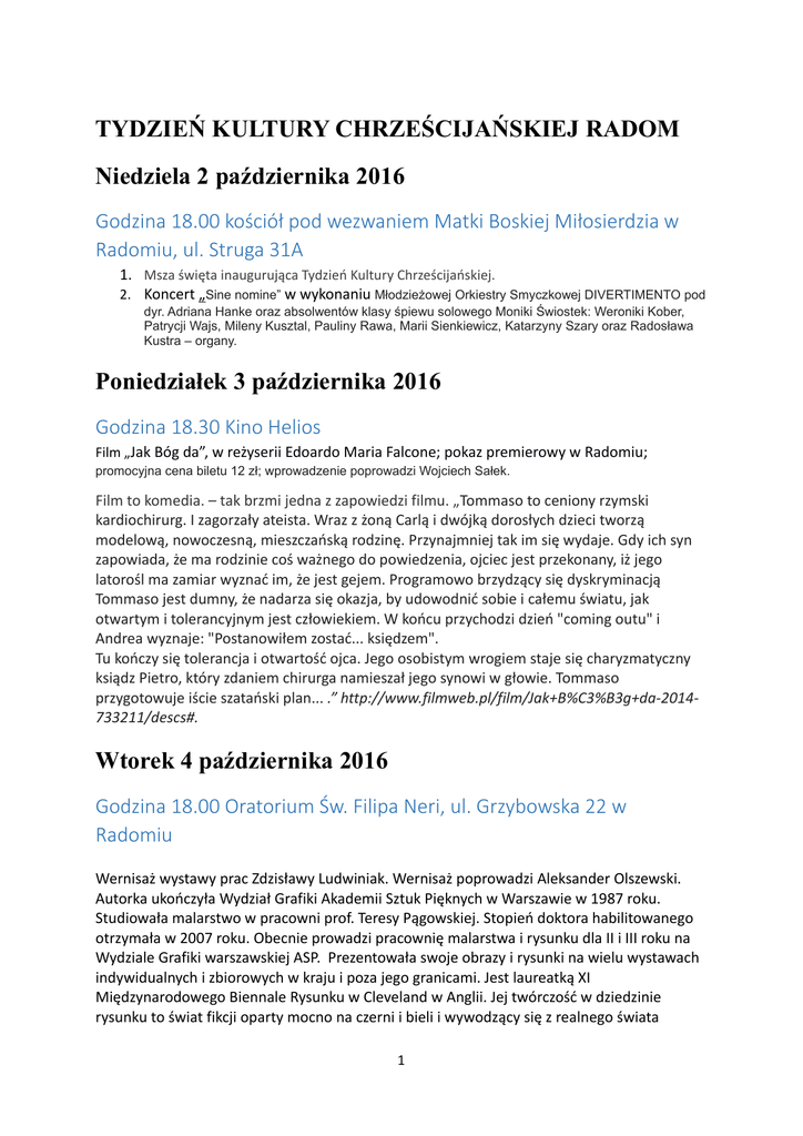 TYDZIEŃ KULTURY CHRZEŚCIJAŃSKIEJ RADOM Niedziela 2