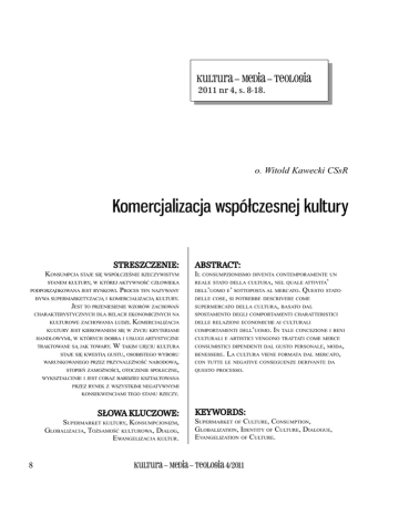 Kultura – Media – Teologia 2011 nr 4, s. 8-18. o. Witold Kawecki CSsR Komercjalizacja współczesnej kultury STRESZCZENIE: KONSUMPCJA STAJE SIĘ WSPÓŁCZEŚNIE RZECZYWISTYM STANEM KULTURY, W KTÓREJ AKTYWNOŚĆ CZŁOWIEKA PODPORZĄDKOWANA JEST RYNKOWI. PROCES TEN NAZYWANY BYWA SUPERMARKETYZACJĄ I KOMERCJALIZACJĄ KULTURY. JEST TO PRZENIESIENIE WZORÓW ZACHOWAŃ CHARAKTERYSTYCZNYCH DLA RELACJI EKONOMICZNYCH NA KULTUROWE ZACHOWANIA LUDZI. KOMERCJALIZACJA KULTURY JEST KIEROWANIEM SIĘ W ŻYCIU KRYTERIAMI ABSTRACT: IL CONSUMPZIONISMO DIVENTA CONTEMPORAMENTE UN REALE STATO DELLA CULTURA, NEL QUALE ATTIVITA’ DELL’UOMO E’ SOTTOPOSTA AL MERCATO. QUESTO STATO DELLE COSE, SI POTREBBE DESCRIVERE COME SUPERMERCATO DELLA CULTURA, BASATO DAL SPOSTAMENTO DEGLI COMPORTAMENTI CHARATTERISTICI DELLE RELAZIONI ECONOMICHE AI CULTURALI COMPORTAMENTI DELL’UOMO. IN TALE CONCEZIONE I BENI HANDLOWYMI, W KTÓRYCH DOBRA I USŁUGI ARTYSTYCZNE CULTURALI E ARTISTICI VENGONO TRATTATI COME MERCE TRAKTOWANE SĄ JAK TOWARY. W TAKIM UJĘCIU KULTURA CONSUMISTICI DIPENDENTI DAL GUSTO PERSONALE, MODA, STAJE SIĘ KWESTIĄ GUSTU, OSOBISTEGO WYBORU WARUNKOWANEGO PRZEZ PRZYNALEŻNOŚĆ NARODOWĄ, STOPIEŃ ZAMOŻNOŚCI, OTOCZENIE SPOŁECZNE, BENESSERE. LA CULTURA VIENE FORMATA DAL MERCATO, CON TUTTE LE NEGATIVE CONSEGUENZE DERIVANTE DA QUESTO PROCESSO. WYKSZTAŁCENIE I JEST CORAZ BARDZIEJ KSZTAŁTOWANA PRZEZ RYNEK Z WSZYSTKIMI NEGATYWNYMI KONSEKWENCJAMI TEGO STANU RZECZY. SŁOWA KLUCZOWE: SUPERMARKET KULTURY, KONSUMPCJONIZM, GLOBALIZACJA, TOŻSAMOŚĆ KULTUROWA, DIALOG, EWANGELIZACJA KULTUR. 8 KEYWORDS: SUPERMARKET OF CULTURE, CONSUMPTION, GLOBALIZATION, IDENTITY OF CULTURE, DIALOGUE, EVANGELIZATION OF CULTURE. Kultura – Media – Teologia 4/2011 W. Kawecki, Komercjalizacja współczesnej kultury W spółcześni badacze kultury coraz częściej dochodzą do wniosku, że aktualnie społeczeństwa rozwijają tak zwaną komunikację poziomą, zaniedbując jej pionowy wymiar. Przykładem takiej grupy społecznej są młodzi ludzie, którzy potrafią się stosunkowo łatwo porozumieć ze swoimi rówieśnikami, ale trudniej jest im porozumieć się z pokoleniem ojców i dziadków. Jak określa to zjawisko socjolog kultury i komunikacji społecznej, Kazimierz Krzysztofek, młodzież przestaje rozumieć kod własnej kultury, który jest podstawowym warunkiem nawiązania kontaktu komunikacyjnego i wytworzenia więzi wspólnoty 1. Kod kulturowy niszczony jest przez włączenie do obiegu komercyjnego wszystkiego, co nosi nazwę „przemysłu i usług kulturalnych” (produkcja audiowizualna, przemysł turystyczny, przemysł dziedzictwa, historia, nauka, seks, kuchnia, podróże, styl, moda, sztuka prezentacji, uroda, sport itd.). Dokonuje się to za sprawą mediów, które wpadają w zastawioną przez siebie pułapkę, tworząc imperatyw kategoryczny i dyktat promocji – przekształcający się niekiedy w kult marketingu – sprzedając każdą produkcję kulturalną, bez doboru ambitniejszego repertuaru, lansując reklamy. Wszystko to jest przejawem niszczenia kodu kulturowego, bez którego owe działania same przestają być zrozumiałe. Dynamiczny rozwój kultury push2 ma – jak się wydaje – swoje odniesienie do międzypokoleniowej transmisji kultury i zmienia politykę kulturalną z tradycyjnej na kulturę multimedialną. Masowo daje się zaobserwować wkraczanie światopoglądu konsumpcyjnego, eksponującego jako wartości ostateczne (pozbawione charakteru transcendentnego), wartości uchwytne praktycznie 3. Konsekwencją tego stanu jest marketyzacja i komercjalizacja kultury. Społeczeństwo współczesne bywa często nazywane społeczeństwem konsumpcyjnym, konsumeryzm jest bowiem jego dominującą cechą, jest remedium na lęk (konsumpcja pozwala zapomnieć o problemach, z którymi należy się zmierzyć); jest stylem życia wokół określonej i narzuconej medialnie mody (pożądanie towarów jest wytworem społecznym); jest formą spędzania wolnego czasu (zakupy stają się nie tylko formą rozrywki, tak zwaną det-rozrywką, ale i miniwakacjami) 4; jest dążeniem do przyjemności (hedonizm); jest sposobem re alizacji zobowiązań obywatelskich (kto nie konsumuje, nie jest dobrym obywatelem); jest rodzajem nowej religii; jest wreszcie ideologią silnie powiązaną ze 1 2 3 4 Por. K. Krzysztofek, Ekspansja kultury mediów a międzypokoleniowy przekaz kultury, w: Kultura polska w nowej sytuacji historycznej, Warszawa 1999, s. 39. Por. T. Goban-Klas (1995) nazwy kultury tłoczenia (push) używa w miejsce kultury wyboru (pull) na oznaczenie tego, co się współcześnie dzieje w kulturze, czyli na przechodzenie od twórczości do czystej wytwórczości, od kreacji wartości do produkcji wartości. Zob. K. Krzysztofek, Ekspansja kultury mediów a międzypokoleniowy przekaz kultury, w: Kultura polska w nowej sytuacji historycznej, Warszawa 1999, s. 45. Por. A. Zeidler-Janiszewska, Formy praktyki artystycznej wobec przemian współczesnej kultury, w: Kultura polska w nowej sytuacji historycznej, J. Damrosz (red.), Warszawa 1998, s. 118. Do centrów handlowych rozciągających się na wielohektarowych przestrzeniach, przyjeżdża się jak do miasta czy kraju, mając w miniaturce wszystkie możliwe atrakcje. Konsumpcja jest umagiczniona, dlatego sprzedaży muszą towarzyszyć różnego rodzaju atrakcje, aby oczarować klienta. Kultura – Media – Teologia 4/2011 9 „ SUPERMARKET KULTURY Można powiedzieć, że konsumpcja staje się rzeczywistym stanem kultury, w której całe obszary ludzkiej aktywności podporządkowane są rynkowi. Mamy tu zatem do czynienia z supermarketyzacją i komercjalizacją kultury, a więc przeniesieniem wzorów zachowań charakterystycznych dla relacji ekonomicznych (kupno-sprzedaż, podaż-popyt, klient-usługa) na pozaekonomiczne, w tym kulturowe zachowania ludzi stylem życia (ludzie nabywają nowe rzeczy nie dlatego, że naprawdę ich potrzebują, lecz po to, by być w zgodzie ze spo