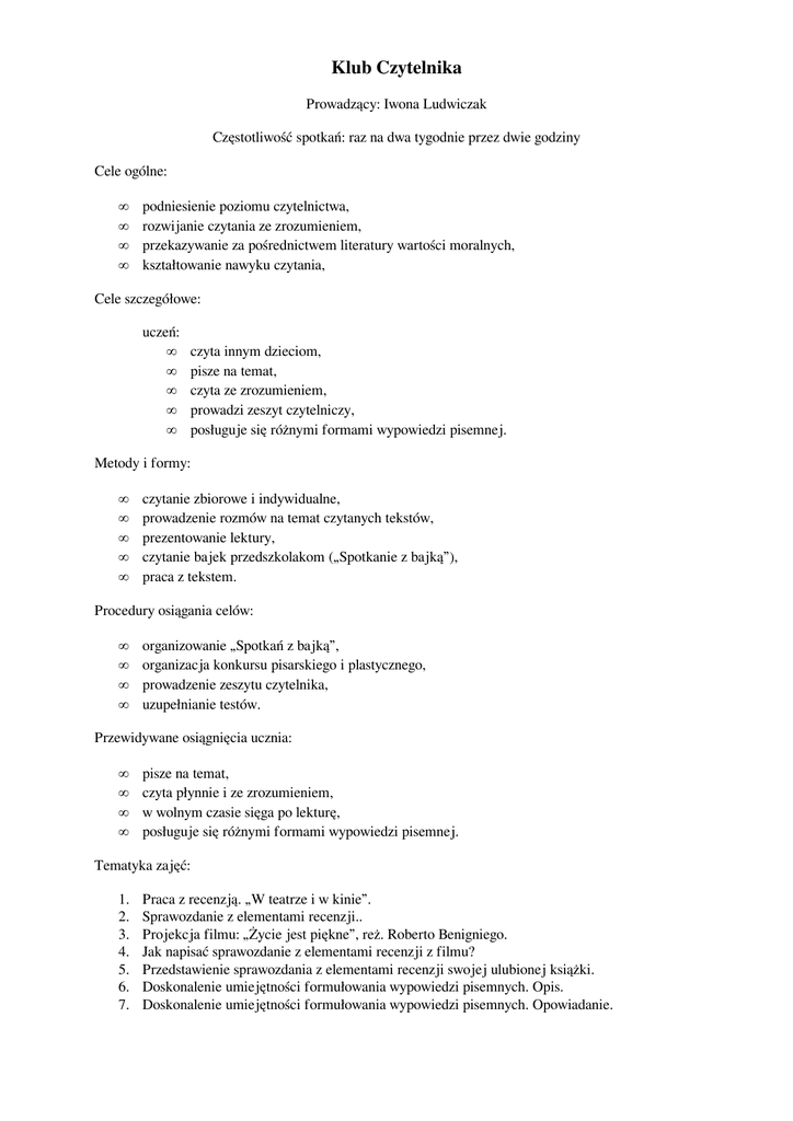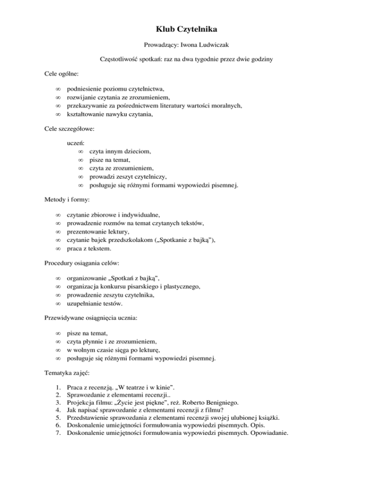 Klub Czytelnika Prowadzący: Iwona Ludwiczak Częstotliwość spotkań: raz na dwa tygodnie przez dwie godziny Cele ogólne: • • • • podniesienie poziomu czytelnictwa, rozwijanie czytania ze zrozumieniem, przekazywanie za pośrednictwem literatury wartości moralnych, kształtowanie nawyku czytania, Cele szczegółowe: uczeń: • • • • • czyta innym dzieciom, pisze na temat, czyta ze zrozumieniem, prowadzi zeszyt czytelniczy, posługuje się różnymi formami wypowiedzi pisemnej. Metody i formy: • • • • • czytanie zbiorowe i indywidualne, prowadzenie rozmów na temat czytanych tekstów, prezentowanie lektury, czytanie bajek przedszkolakom („Spotkanie z bajką”), praca z tekstem. Procedury osiągania celów: • • • • organizowanie „Spotkań z bajką”, organizacja konkursu pisarskiego i plastycznego, prowadzenie zeszytu czytelnika, uzupełnianie testów. Przewidywane osiągnięcia ucznia: • • • • pisze na temat, czyta płynnie i ze zrozumieniem, w wolnym czasie sięga po lekturę, posługuje się różnymi formami wypowiedzi pisemnej. Tematyka zajęć: 1. 2. 3. 4. 5. 6. 7. Praca z recenzją. „W teatrze i w kinie”. Sprawozdanie z elementami recenzji.. Projekcja filmu: „Życie jest piękne”, reż. Roberto Benigniego. Jak napisać sprawozdanie z elementami recenzji z filmu? Przedstawienie sprawozdania z elementami recenzji swojej ulubionej książki. Doskonalenie umiejętności formułowania wypowiedzi pisemnych. Opis. Doskonalenie umiejętności formułowania wypowiedzi pisemnych. Opowiadanie. 8. Doskonalenie umiejętności formułowania wypowiedzi pisemnych. List. Kartka pocztowa. 9. Doskonalenie umiejętności formułowania wypowiedzi pisemnych. Ogłoszenie, zaproszenie, instrukcja. 10. Doskonalenie umiejętności formułowania wypowiedzi. Diagram kołowy i słupkowy, tabela. 11. Przygotowanie do konkursu pisarskiego. 12. Przygotowanie do konkursu bibliotecznego (plastycznego). 13. Czytanie ze zrozumieniem: „Złota kaczka”. 14. Czytanie ze zrozumieniem: „Faraon”. 15. Czytanie ze zrozumieniem: „Balladyna”. 16. Czytanie ze zrozumieniem: „Sat-Okh”. 17. Czytanie ze zrozumieniem: „Wiosna, lato, jesień, zima”. 18. Czytanie ze zrozumieniem: „Cuda natury, cuda kultury”. 19. Czytanie ze zrozumieniem: „Wędrówki po Polsce”. 20. Czytanie ze zrozumieniem: „Sygnalizacja świetlna”. Źródła tekstów: „Wiem, co czytam” W. Went, „Sprawdziany kompetencji. Doskonalenie umiejętności rozumienia tekstu” B. Kusz, „Testy przygotowujące do sprawdzianu podsumowującego naukę w szkole podstawowej” A. Majewska Skrzyniarz i in.