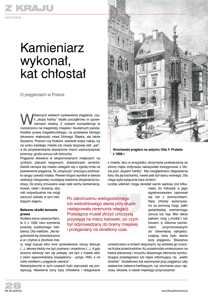 Z kraju HISTORIA Kamieniarz wykonał, kat chłostał W dawnych wiekach wystawienie pręgierza, czyli „słupa hańby” leżało początkowo w uprawnieniach władcy. Z czasem kompetencje te rozszerzono na magistraty miejskie i feudalnych panów. Kodeks prawa magdeburskiego, na podstawie którego lokowano większość miast Dolnego Śląska, ale także Szczecin, Poznań czy Kraków, zawierał wręcz nakaz, by na rynku każdego miasta lub osady targowej stał „pal”, a do przytwierdzania skazańców miano wykorzystywać Wrocławski pręgierz na sztychu Otto F. Probsta powrozy, grube sznury lub łańcuchy. z 1898 r. Pręgierze stawiano w eksponowanych miejscach: na rynkach, placach targowych, dziedzińcach zamków. z miasta, lecz w przypadku otrzymania przebaczenia ze Każde ceniące się miasto ubiegało się o zgodę króla na strony męża ordynacja nakazywała zrezygnować z obipostawienie pręgierza. Ta „instytucja” znacząco podnosicia pod „słupem hańby”. Nie uwzględniano złagodzenia ła rangę i prestiż miasta. Pewien kłopot wynikał w trakcie kary dla jej kochanka, nawet jeśli był stanu wolnego. Dla realizacji nietypowej i budzącej wiadome skojarzenia buniego była wyłącznie kara śmierci. dowy. Do pracy zmuszano więc całe cechy kamieniarzy, Liczbę uderzeń rózgą określał wyrok sądowy (od kilkukowali, cieśli i ślusarzy, aby nastu do kilkuset) a jego nikt indywidualnie nie mógł egzekwowaniem zajmował zarzucić udziału w tym hańsię kat z pomocnikami. Po zakończeniu wielogodzinnego biącym zajęciu. Karę chłosty wykonywalub wielodniowego stania przy słupie no za pomocą rózgi, pałki następowała ceremonia relegacji. Bolesne skutki łamania gwiaździstej, rzemiennego prawa sznura lub kija. Bito także Przestępca musiał złożyć uroczystą Kodeks karny cesarza Karopękiem rózg („miotłą”) lub przysięgę na miecz katowski, po czym la V z 1532 roku wymienia biczem, tj. kilkoma rzemiebył odprowadzany do bramy miejskiej powody publicznego hańniami przymocowanymi i przeganiany na określony czas. bienia. Oto niektóre: „Na kodo drewnianej rękojeści. gokolwiek by doświadczono Lżejszą karą było stanie a on chytrze a złośliwie miaprzy pręgierzu. Skazańca ry, wagi kupuje albo inne sprzedawane rzeczy fałszuje umieszczano w dniach targowych, by widziała go znacz(...), takowy każdy ma być pojmany i wsadzony (...). A gdy na liczba przechodniów. Ku przestrodze umieszczano na słuszne dowody nań się pokażą, ma być z miasta albo klatce piersiowej i brzuchu skazanego elementy symbolizujące przestępstwo lub napis informujący, np. „wielki z ziemi wypowiedziany (wypędzony – przyp. HW), a na złodziej”. Dodatkowo kat wykonywał przy pręgierzu cały ciele miotłami u pręgierza ukarany”. zestaw kar cielesno-hańbiących, np. obcinanie uszu, rąk, Niebezpiecznie w tych czasach było zajmować się pronosa, włosów, a nawet męskiego przyrodzenia! stytucją. Niewierne żony były chłostane i relegowane ” 28 NK 46 (3/2010) www.RynekKamienia.pl fot. wRocLaw.HYdRaL.com.PL O pręgierzach w Polsce Z kraju HISTORIA Poznań Pierwszy poznański pręgierz wykonał cieśla. Dopiero w roku 1535 rajcy miejscy sprytnie zdobyli fundusze na postawienie słupa hańby z kamienia (szarego średnioziarnistego piaskowca przypominającego piaskowce z Brzeźna). Zbytkownie ubierające się dziewczyny służebne, mamki, kelnerki i kucharki karano grzywnami i konfiskatą strojów. Pod miejski słup mogły trafić białogłowy za zbyt głęboki dekolt. „Każdą kobietę, która swoje bujne piersi za bardzo pokazuje, powinien natychmiast odprowadzić do więzienia, po czym tak bezczelną nieszczęśnicę ma ukarać chłostą” – uchwalili rajcowie miejscy. Jeszcze w tym samym roku 1535 w Poznaniu stanął kamienny pręgierz. Składał się z dwuipółmetrowego trzonu o przekroju ośmiobocznym. Wmontowano trzy żelazne obręcze do przeciągania sznurów oraz dwa łańcuchy zakończone kunami na szyje skazańców. Górną część wieńczył posążek mężczyzny odzianego w renesansową zbroję i kolczugę. Na dolnym fragmencie profilowanej głowicy kolumny wykuto dwa cytaty pochodzące z szóstej księgi Eneidy Wergiliusza. Oba warte są przytoczenia: Vendidi his auro patriam („Ten sprzedał ojczyznę na złoto”) i Discite iustitiam monti et non tenere divos („Upomniani, uczcie się sprawiedliwości i nie lekceważcie bo- www.RynekKamienia.pl Poznań. Wykonana w 1925 r. kopia średniowiecznego pręgierza znajdującego się obecnie w podziemiach Ratusza fot. wikimedia commons Kraków W pobliżu ratusza na wprost pałacu Spiskiego przez kilkaset lat stał pręgierz. Początkowo był drewniany, a od XVI wieku kamienny, z piaskowca istebniańskiego. W trzonie zakotwiono obręcz na szyję i okowy do skrępowania rąk. Dziesiątki złoczyńców bliżej poznało kata i jego aktywność w pracy. Dla kobiet lekkich obyczajów kary chłosty nie były wystarczającym straszakiem. Ból był duży, lecz pokusa niezłego zarobku... jeszcze większa. W roku 1820 krakowski pręgierz usunięto, przeznaczając go na cokół pod figurę Matki Boskiej w Bronowicach u zbiegu dzisiejszych ulic Zielony Most i Katowickiej. Były pręgierz stoi obecnie na dawnym cmentarzu zmarłych na cholerę w Mydlnikach. W 1847 roku figurę z kolumną przeniesiono tam w podzięce za ocalenie od zarazy przodków jego ówczesnego właściciela. Powrót kolumny pręgierza na Rynek Główny zaproponował jeden z konsultantów renowacji Starówki prof. J. Bogdanowski z Politechniki Krakowskiej. Negocjacje trwają już kilka lat. fot. wikimedia commons Po zakończeniu wielogodzinnego lub wielodniowego stania przy słupie następowała ceremonia relegacji. Przestępca musiał złożyć uroczystą przysięgę na miecz katowski, po czym był odprowadzany do bramy miejskiej i przeganiany na określony czas (rok, kilka lat lub na zawsze). Ten rodzaj kary z powodzeniem stosowały