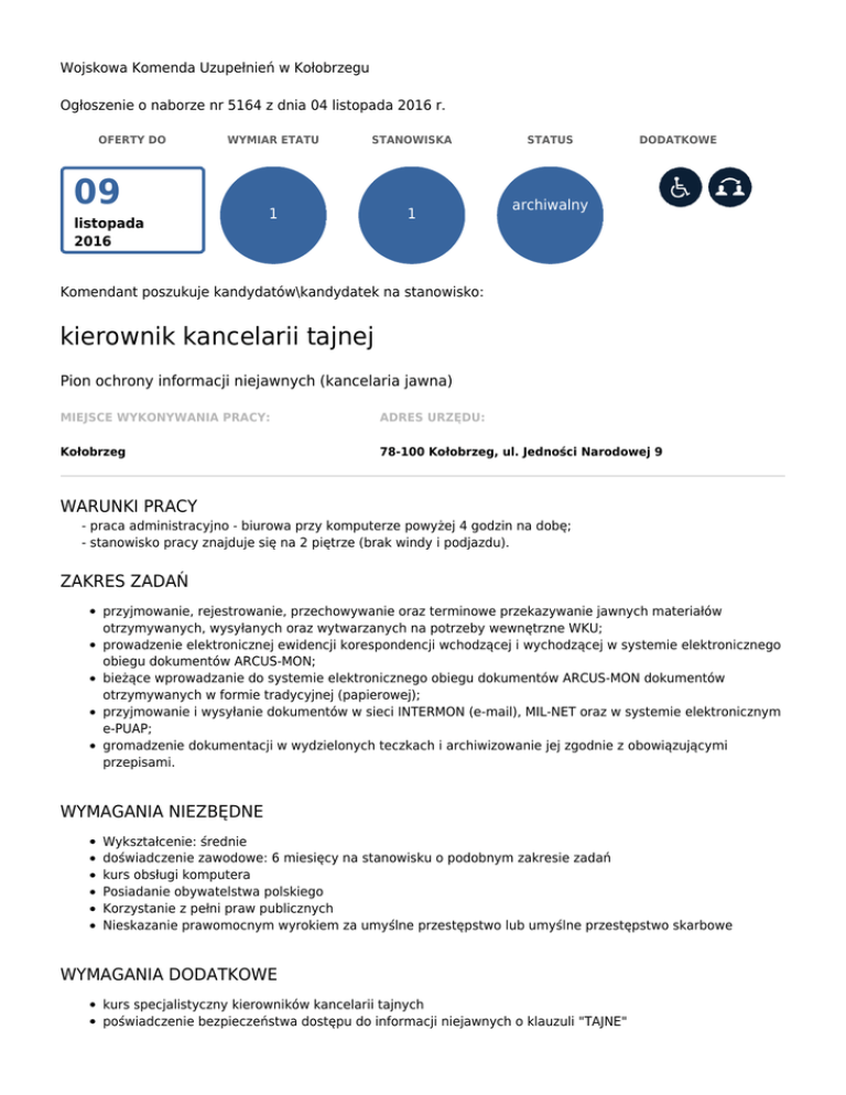 Wojskowa Komenda Uzupełnień w Kołobrzegu Ogłoszenie o naborze nr 5164 z dnia 04 listopada 2016 r. OFERTY DO WYMIAR ETATU STANOWISKA 1 1 09 listopada 2016 STATUS DODATKOWE archiwalny Komendant poszukuje kandydatów\kandydatek na stanowisko: kierownik kancelarii tajnej Pion ochrony informacji niejawnych (kancelaria jawna) MIEJSCE WYKONYWANIA PRACY: ADRES URZĘDU: Kołobrzeg 78-100 Kołobrzeg, ul. Jedności Narodowej 9 WARUNKI PRACY - praca administracyjno - biurowa przy komputerze powyżej 4 godzin na dobę; - stanowisko pracy znajduje się na 2 piętrze (brak windy i podjazdu). ZAKRES ZADAŃ przyjmowanie, rejestrowanie, przechowywanie oraz terminowe przekazywanie jawnych materiałów otrzymywanych, wysyłanych oraz wytwarzanych na potrzeby wewnętrzne WKU; prowadzenie elektronicznej ewidencji korespondencji wchodzącej i wychodzącej w systemie elektronicznego obiegu dokumentów ARCUS-MON; bieżące wprowadzanie do systemie elektronicznego obiegu dokumentów ARCUS-MON dokumentów otrzymywanych w formie tradycyjnej (papierowej); przyjmowanie i wysyłanie dokumentów w sieci INTERMON (e-mail), MIL-NET oraz w systemie elektronicznym e-PUAP; gromadzenie dokumentacji w wydzielonych teczkach i archiwizowanie jej zgodnie z obowiązującymi przepisami. WYMAGANIA NIEZBĘDNE Wykształcenie: średnie doświadczenie zawodowe: 6 miesięcy na stanowisku o podobnym zakresie zadań kurs obsługi komputera Posiadanie obywatelstwa polskiego Korzystanie z pełni praw publicznych Nieskazanie prawomocnym wyrokiem za umyślne przestępstwo lub umyślne przestępstwo skarbowe WYMAGANIA DODATKOWE kurs specjalistyczny kierowników kancelarii tajnych poświadczenie bezpieczeństwa dostępu do informacji niejawnych o klauzuli "TAJNE" DOKUMENTY I OŚWIADCZENIA NIEZBĘDNE Życiorys/CV i list motywacyjny Kopie dokumentów potwierdzających spełnienie wymagania niezbędnego w zakresie wykształcenia Kopie dokumentów potwierdzających spełnienie wymagania niezbędnego w zakresie doświadczenia zawodowego / stażu pracy Kopia dokumentu potwierdzającego ukończenie kursu komputerowego Oświadczenie o posiadaniu obywatelstwa polskiego albo kopia dokumentu potwierdzającego posiadanie polskiego obywatelstwa Oświadczenie o wyrażeniu zgody na przetwarzanie danych osobowych do celów naboru Oświadczenie o korzystaniu z pełni praw publicznych Oświadczenie o nieskazaniu prawomocnym wyrokiem za umyślne przestępstwo lub umyślne przestępstwo skarbowe DOKUMENTY I OŚWIADCZENIA DODATKOWE kopia dokumentu potwierdzającego niepełnosprawność - w przypadku kandydatek/kandydatów, zamierzających skorzystać z pierwszeństwa w zatrudnieniu w przypadku, gdy znajdą się w gronie najlepszych kandydatek/kandydatów kopia zaświadczenia o ukończeniu kursu specjalistycznego kierowników kancelarii tajnych kopia poświadczenia bezpieczeństwa dostępu do informacji niejawnych o klauzuli "TAJNE" TERMINY I MIEJSCE SKŁADANIA DOKUMENTÓW Dokumenty należy złożyć do: 09 listopada 2016 r. Decyduje data: stempla pocztowego / osobistego dostarczenia oferty do urzędu Miejsce składania dokumentów: 78-100 Kołobrzeg, ul. Jedności Narodowej 9 INNE INFORMACJE: W miesiącu poprzedzającym datę upublicznienia ogłoszenia wskaźnik zatrudnienia osób niepełnosprawnych w urzędzie, w rozumieniu przepisów o rehabilitacji zawodowej i społecznej oraz zatrudnianiu osób niepełnosprawnych, nie wynosi co najmniej 6%. Oferta dotyczy stanowiska: kierownik kancelarii jawnej, które klasyfikuje się jak stanowisko kierownika kancelarii tajnej wynikające z rozporządzenia Prezesa Rady Ministrów z dnia 29 stycznia 2016 r. w sprawie określenia stanowisk urzędniczych, wymaganych kwalifikacji zawodowych, stopni służbowych urzędników służby cywilnej, mnożników do ustalania wynagrodzenia oraz szczegółowych zasad ustalania i wypłacania innych świadczeń przysługujących członkom korpusu służby cywilnej (Dz.U. z 2016 r. poz. 125). Oferty otrzymane po terminie nie będą rozpatrywane (decyduje data stempla pocztowego). Kandydaci zakwalifikowani do kolejnego etapu postępowania rekrutacyjnego zostaną poinformowani o jego terminie telefonicznie. Oferty odrzucone zostaną komisyjnie zniszczone. Ogłoszenie dot. zatrudnienia na zastępstwo (za czasowo nieobecnego pracownika). Szczegółowe informacje można uzyskać tel. 261-223-120. Legenda Pierwszeństwo dla osób z niepełnosprawnościami Ogłoszenie z tym symbolem oznacza, że pierwszeństwo w zatrudnieniu mają osoby z niepełnosprawnościami, które spełniają wszystkie następujące warunki: • złożyły w terminie ofertę wraz z dokumentem potwierdzającym niepełnosprawność, • spełniają warunki wymienione w ogłoszeniu, • po rekrutacji znalazły się w gronie najlepszych kandydatów. Zastępstwo Ogłoszenie z tym symbolem oznacza, że urząd poszukuje kandydatów do pracy na czas przewidywanej nieobecności swojego pracownika. Jeśli w ogłoszeniu nie wskazano okresu zastępstwa, możesz o to spytać w urzędzie. Osoba zatrudniona na zastępstwo jest członkiem korpusu służby cywilnej. Nabór otwarty dla cudzoziemców Ogłoszenie z tym symbolem oznacza, że o stanowisko mogą starać się, poza polskimi obywatelami, również cudzoziemcy. Kandydaci muszą spełniać następujące warunki: • są obywatelami państwa Unii Europejskiej lub innego państwa, którego obywatelom na podstawie umów międzynarodowych lub przepisów prawa wspólnotowego przysługuje prawo podjęcia zatrudnienia na terytorium Polski, • ich znajomość języka polskiego jest potwierdzona jednym z dokumentów wskazanych w rozporządzeniu w sprawie rodzajów dokumentów potwierdzających znajomość języka polskiego przez osoby nieposiadające obywatelstwa polskiego, ubiegające się o zatrudnienie w służbie cywilnej.