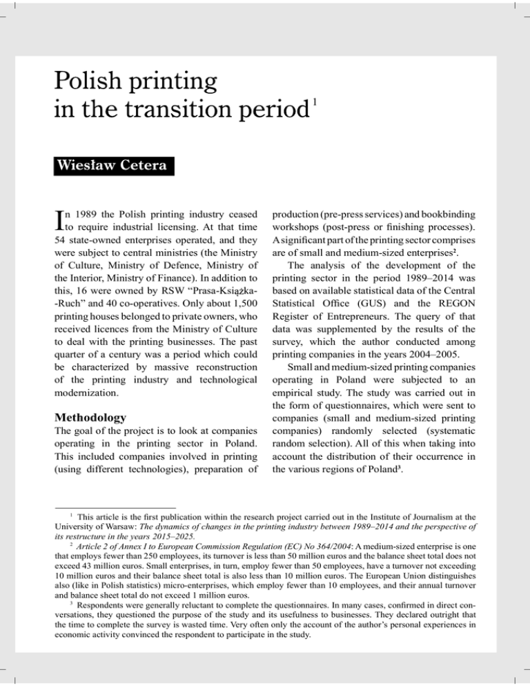 1 I n 1989 the Polish printing industry ceased to require industrial licensing. At that time 54 state-owned enterprises operated, and they were subject to central ministries (the Ministry of Culture, Ministry of Defence, Ministry of the Interior, Ministry of Finance). In addition to this, 16 were owned by RSW Prasa-Ksi ka-Ruch and 40 co-operatives. Only about 1,500 printing houses belonged to private owners, who received licences from the Ministry of Culture to deal with the printing businesses. The past quarter of a century was a period which could be characterized by massive reconstruction of the printing industry and technological modernization. Methodology The goal of the project is to look at companies operating in the printing sector in Poland. This included companies involved in printing (using different technologies), preparation of production (pre-press services) and bookbinding workshops (post-press or nishing processes). A signi cant part of the printing sector comprises are of small and medium-sized enterprises2. The analysis of the development of the printing sector in the period 1989 2014 was based on available statistical data of the Central Statistical Of ce (GUS) and the REGON Register of Entrepreneurs. The query of that data was supplemented by the results of the survey, which the author conducted among printing companies in the years 2004 2005. Small and medium-sized printing companies operating in Poland were subjected to an empirical study. The study was carried out in the form of questionnaires, which were sent to companies (small and medium-sized printing companies) randomly selected (systematic random selection). All of this when taking into account the distribution of their occurrence in the various regions of Poland3. 1 This article is the rst publication within the research project carried out in the Institute of Journalism at the University of Warsaw: he dynamics of changes in the printing industry etween 1989 2014 and the perspective of its restructure in the years 201 202 . 2 Article 2 of Annex I to European Commission Regulation (EC) No 364/2004: A medium-sized enterprise is one that employs fewer than 250 employees, its turnover is less than 50 million euros and the balance sheet total does not exceed 43 million euros. Small enterprises, in turn, employ fewer than 50 employees, have a turnover not exceeding 10 million euros and their balance sheet total is also less than 10 million euros. The European Union distinguishes also (like in Polish statistics) micro-enterprises, which employ fewer than 10 employees, and their annual turnover and balance sheet total do not exceed 1 million euros. 3 Respondents were generally reluctant to complete the questionnaires. In many cases, con rmed in direct conversations, they questioned the purpose of the study and its usefulness to businesses. They declared outright that the time to complete the survey is wasted time. ery often only the account of the author s personal experiences in economic activity convinced the respondent to participate in the study. 76 The pilot survey was conducted in November 2004. A questionnaire was sent to 994 of the 19,175 printing companies in Poland, whose addresses were from Panorama Firm (Panorama of Companies). Only 153 correctly completed questionnaires were obtained. Respondents answered questions related to the use of the Internet, spreadsheet software and management support software. Interviews with managers of the surveyed companies that were simultaneously carried out at this stage established scope of subsequent research. The main survey was carried out in 2005. In this part of the research 420 printing companies took an active part in the survey. The collected data and survey were complemented by four measurements of the economic situation in the printing sector, carried out for the rst time in February 2012. The second study was conducted in September 2012. Another part of the research was conducted in April 2013 and repeated the following year in April 2014. The rst piece of research involved 177 printing companies and the second 330 companies accordingly. In the third phase 356 companies were surveyed, while the fourth phased involved 320 enterprises4. The survey questions focused on the current situation of the companies, as well as on the three-month period preceding the date of the study and the three-month perspective after that date. Questions were answered by company owners or managers. As much as possible, the same entities were selected to participate in the study. Previous studies Wies aw Cetera In Polish literature, there are few publications on the economic related issues in the printing sector (W. Cetera, 2007, 2008, 2009). It is the rich American literature that is noteworthy. The results of many years of research of the printing sector are presented in publications of the Printing Industry Center in Rochester (USA). In studies of B. Pellow, M.J. Pletka and H.A. Banis (2003), F.J. Romano and M. Sooma (2003, 2004), S.R. Kadam, M.A. Evans, S. Rothenberg (2005) and P. Sorce (2002) one can nd issues related to economic and organizational sphere of printing. Globally, there is a lack of literature concerning the transition of the economy from a socialist system to a free-market model, in particular taking into account changes in the printing industry. Apart from that, there were attempts of periodization of the transition period. M.J. Stankiewicz (1999) and S. Sudol (2000) completed their study in 19985. The nature of changes in the printing sector Changes in the printing sector in Poland occured quickly after 1989. In 1991, the Central Statistical Of ce (GUS) reported that among all printing companies, 5,263 were private establishments. However, just four years later, in 1995, statistics showed as many as 11,510 privately-owned printing companies, which means a more than twofold increase in the years 1991 1995. The speci c nature of production of printing companies wa