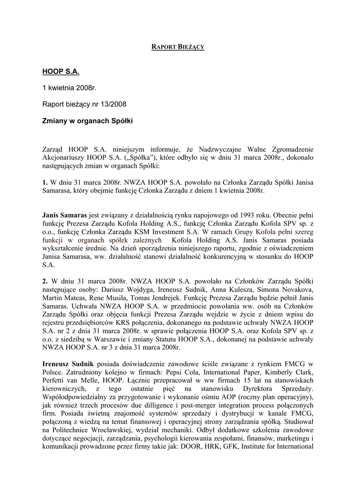 RAPORT BIEŻĄCY HOOP S.A. 1 kwietnia 2008r. Raport bieżący nr 13/2008 Zmiany w organach Spółki Zarząd HOOP S.A. niniejszym informuje, że Nadzwyczajne Walne Zgromadzenie Akcjonariuszy HOOP S.A. („Spółka”), które odbyło się w dniu 31 marca 2008r., dokonało następujących zmian w organach Spółki: 1. W dniu 31 marca 2008r. NWZA HOOP S.A. powołało na Członka Zarządu Spółki Janisa Samarasa, który obejmie funkcję Członka Zarządu z dniem 1 kwietnia 2008r. Janis Samaras jest związany z działalnością rynku napojowego od 1993 roku. Obecnie pełni funkcję Prezesa Zarządu Kofola Holding A.S., funkcję Członka Zarządu Kofola SPV sp. z o.o., funkcję Członka Zarządu KSM Investment S.A. W ramach Grupy Kofola pełni szereg funkcji w organach spółek zależnych Kofola Holding A.S. Janis Samaras posiada wykształcenie średnie. Na dzień sporządzenia niniejszego raportu, zgodnie z oświadczeniem Janisa Samarasa, ww. działalność stanowi działalność konkurencyjną w stosunku do HOOP S.A. 2. W dniu 31 marca 2008r. NWZA HOOP S.A. powołało na Członków Zarządu Spółki następujące osoby: Dariusz Wojdyga, Ireneusz Sudnik, Anna Kulesza, Simona Novakova, Martin Mateas, Rene Musila, Tomas Jendrejek. Funkcję Prezesa Zarządu będzie pełnił Janis Samaras. Uchwała NWZA HOOP S.A. w przedmiocie powołania ww. osób na Członków Zarządu Spółki oraz objęcia funkcji Prezesa Zarządu wejdzie w życie z dniem wpisu do rejestru przedsiębiorców KRS połączenia, dokonanego na podstawie uchwały NWZA HOOP S.A. nr 2 z dnia 31 marca 2008r. w sprawie połączenia HOOP S.A. oraz Kofola SPV sp. z o.o. z siedzibą w Warszawie i zmiany Statutu HOOP S.A., dokonanej na podstawie uchwały NWZA HOOP S.A. nr 3 z dnia 31 marca 2008r. Ireneusz Sudnik posiada doświadczenie zawodowe ściśle związane z rynkiem FMCG w Polsce. Zatrudniony kolejno w firmach: Pepsi Cola, International Paper, Kimberly Clark, Perfetti van Melle, HOOP. Łącznie przepracował w ww firmach 15 lat na stanowiskach kierowniczych, z tego ostatnie pięć na stanowisku Dyrektora Sprzedaży. Współodpowiedzialny za przygotowanie i wykonanie ośmiu AOP (roczny plan operacyjny), jak również trzech procesów due dilligence i post-merger integration process połączonych firm. Posiada świetną znajomość systemów sprzedaży i dystrybucji w kanale FMCG, połączoną z wiedzą na temat finansowej i operacyjnej strony zarządzania spółką. Studiował na Politechnice Wrocławskiej, wydział mechaniki. Odbył dodatkowe szkolenia zawodowe dotyczące negocjacji, zarządzania, psychologii kierowania zespołami, finansów, marketingu i komunikacji prowadzone przez firmy takie jak: DOOR, HRK, GFK, Institute for International Research, Francuski Instytut Gospodarki, Power Business Ass., PLMA. Ireneusz Sudnik nie prowadzi działalności konkurencyjnej w stosunku do HOOP S.A. Anna Kulesza jest pracownikiem HOOP S.A. od ponad 9 lat. Będąc na stanowisku, początkowo asystenta Dyrektora Naczelnego odpowiedzialnego za logistykę i produkcję oraz inwestycje w Spółce, a następnie zajmując stanowisko Kierownika Działu Prawnego zdobyła wiedzę z zakresu powyższych działalności Spółki oraz uczestniczyła w procesach zawierania wszystkich istotnych dla produkcyjnej działalności Spółki kontraktów. Kontynuując pracę jako Dyrektor Biura Prawnego Anna Kulesza zajmuje się również kwestiami prawnymi z pozostałych obszarów działalności Spółki, w tym marketingu, sprzedaży i finansów oraz odpowiada za aspekty korporacyjne. Anna Kulesza posiada wykształcenie wyższe. Ukończyła Wydział Prawa na Uniwersytecie Warszawskim, Podyplomowe Studia Menedżerskie w Wyższej Szkole Ekonomicznej oraz Studia doktoranckie na Uniwersytecie Warszawskim (praca naukowa z zakresu ładu korporacyjnego oraz wzajemnych relacji organów spółki publicznej). Anna Kulesza nie prowadzi działalności konkurencyjnej w stosunku do HOOP S.A. Simona Novakova jest związana z działalnością rynku napojowego w dziedzinie finansów od 1994 roku. Simona Novakova posiada szerokie doświadczenie w dziedzinie nadzoru finansowego (przygotowywanie Cash Flow Group Strategy, Capex and Opex financing, doradztwo finansowe w związku z reorganizacją grupy kapitałowej, organizowanie transfer pricing policy i konsolidacja w oparciu o IFRS, controling wewnętrzny). Obecnie pełni funkcję Członka Zarządu Kofola Holding A.S., funkcję Członka Zarządu Kofola SPV sp. z o.o., funkcję Członka Zarządu KSM Investment S.A. oraz funkcję Członka Zarządu Kofola Zrt. Simona Novakova posiada wykształcenie wyższe. Na dzień sporządzenia niniejszego raportu, zgodnie z oświadczeniem Simony Novakowej, ww. działalność stanowi działalność konkurencyjną w stosunku do HOOP S.A. Martin Mateas w latach 2004 – 2005 obejmował stanowisko Brand Managera w Heineken Slovakia A.S. Z grupą Kofola związany od 2005r. – początkowo jako Senior Brand Manager w Kofola Holding A.S., a następnie jako Dyrektor Marketingu, odpowiedzialny za strategię marketingową Grupy Kofola. Martin Mateas posiada wykształcenie wyższe. Na dzień sporządzenia niniejszego raportu, zgodnie z oświadczeniem Martina Mateasa, ww. działalność stanowi działalność konkurencyjną w stosunku do HOOP S.A. Rene Musila jest związany z działalnością rynku napojowego od 1993 roku. Rene Musila specjalizuje się w dziedzinie produkcji i innych kwestii technicznych związanych z produkcją napoi bezalkoholowych i wód mineralnych. Obecnie pełni funkcję Członka Zarządu Kofola Holding A.S. na stanowisku dyrektor ds. technicznych i produkcji, funkcję Wiceprezesa Zarządu Kofola A.S., funkcję Członka Zarządu w Santa Trans s.r.o. oraz funkcję Prezesa Zarządu w Kofola A.S. z siedzibą na Słowacji. Rene Musila posiada wykształcenie średnie. Na dzień sporządzenia niniejszego raportu, zgodnie z oświadczeniem Rene Musila, ww. działalność stanowi działalność konku