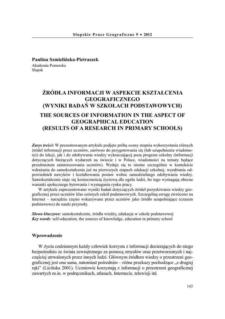 S ł u p s ki e P r a c e G e o g r a f i c z ne 9 • 2012 Paulina Szmielińska-Pietraszek Akademia Pomorska Słupsk ŹRÓDŁA INFORMACJI W ASPEKCIE KSZTAŁCENIA GEOGRAFICZNEGO (WYNIKI BADAŃ W SZKOŁACH PODSTAWOWYCH) THE SOURCES OF INFORMATION IN THE ASPECT OF GEOGRAPHICAL EDUCATION (RESULTS OF A RESEARCH IN PRIMARY SCHOOLS) Zarys treści: W prezentowanym artykule podjęto próbę oceny stopnia wykorzystania różnych źródeł informacji przez uczniów, zarówno do przygotowania się (lub uzupełnienia wiadomości) do lekcji, jak i do zdobywania wiedzy wykraczającej poza program szkolny (informacji dotyczących bieżących wydarzeń na świecie i w Polsce, wiadomości na tematy będące przedmiotem zainteresowania uczniów). Wydaje się to istotne szczególnie w kontekście wdrażania do samokształcenia już na pierwszych etapach edukacji szkolnej, wyrabiania odpowiednich nawyków i kształtowania postaw wobec samodzielnego zdobywania wiedzy. Samokształcenie staje się koniecznością życiową dla ogółu ludzi, bo tego wymagają obecne warunki społecznego bytowania i wymagania rynku pracy. W artykule zaprezentowano wyniki badań dotyczących źródeł pozyskiwania wiedzy geograficznej przez uczniów klas szóstych szkół podstawowych. Szczególną uwagę zwrócono na Internet – narzędzie często wskazywane przez uczniów jako źródło uzupełniające (czasem podstawowe) do nauki przyrody. Słowa kluczowe: samokształcenie, źródła wiedzy, edukacja w szkole podstawowej Key words: self-education, the sources of knowledge, education in primary school Wprowadzenie W życiu codziennym każdy człowiek korzysta z informacji docierających do niego bezpośrednio ze świata zewnętrznego za pomocą zmysłów oraz przetworzonych i najczęściej utrwalonych przez innych ludzi. Głównym źródłem wiedzy o przestrzeni geograficznej jest ona sama, natomiast pośrednim – różne przekazy pochodzące „z drugiej ręki” (Licińska 2001). Uczniowie korzystają z informacji o przestrzeni geograficznej zawartych m.in. w podręcznikach, atlasach, Internecie, telewizji itd. 143 Zgodnie z podstawą programową przedmiotu ’przyroda’ do celów, których osiągnięcie na II etapie edukacyjnym jest warunkiem powodzenia uczniów uczących się geografii w gimnazjum, należy wykształcenie umiejętności odbierania informacji o przestrzeni geograficznej zawartych w różnych źródłach. Podobne umiejętności akcentują zapisy treści przedmiotu ’historia i społeczeństwo’, w ramach którego uczeń „podaje przykłady ważnych problemów współczesnej Polski, korzystając z różnych źródeł informacji (od osób dorosłych, z prasy, radia, telewizji, Internetu)”. Ponadto w komentarzu do podstawy programowej przedmiotu ’przyroda’ w szkole podstawowej znajdujemy zapis, że „należy stosować na lekcjach przyrody metody, które […] ukształtują umiejętność korzystania z różnych źródeł informacji” oraz że „w szkole uczeń ma się nauczyć, jak ma się uczyć tego, czego się w szkole nie nauczył” (Podstawa programowa… 2009). Ostatnio coraz częściej podkreśla się, że nie tyle ważny jest wyniesiony ze szkoły zasób wiedzy (który ulega szybkiej dezaktualizacji), ile umiejętność wzbogacania go przez samokształcenie. Kształtowanie tej umiejętności uczniów musi być więc odpowiednio uwzględnione w nauczaniu (Zarys dydaktyki... 1997). Samokształcenie staje się w coraz większym stopniu także potrzebą całego społeczeństwa. Wiąże się to ze wzrostem poziomu wykształcenia oraz ze stałą koniecznością wzbogacania edukacji, niezależnie od miejsca i pozycji zajmowanej przez jednostkę w społeczeństwie. Samokształcenie staje się koniecznością życiową dla ogółu ludzi, bo to wymuszają warunki społecznego bytowania i wymagania rynku pracy. Wdrażanie do samokształcenia wymaga stosowania odpowiednich form i metod zapewniających uczniom właściwe zrozumienie tego typu działalności i wyrabianie odpowiednich umiejętności kształceniowych (Półturzycki 2005). Idea samokształcenia nie jest niczym nowym w polskiej myśli pedagogicznej. Już w okresie międzywojennym ukazywały się opracowania dotyczące procesu samokształcenia, wśród których na szczególne podkreślenie zasługują prace Floriana Znanieckiego i Władysława Okińskiego (Półturzycki 1983). Także po wojnie powstało wiele poradników skierowanych do nauczycieli bądź uczniów, wskazujących na konieczność rozwoju poprzez samokształcenie. Wymienić tu można np. pracę Czesława Maziarza (1966), Zofii Matulki (1983) czy obszerny podręcznik Józefa Półturzyckiego (1983). Pomimo, jakby się wydawało, dostrzegania wagi tej idei, opracowany w 1989 roku w ramach Komitetu Ekspertów do spraw Edukacji Narodowej raport tematyczny dotyczący samokształcenia jako podstawową tezę przyjmował stwierdzenie, iż „jedną z głównych przyczyn głębokiego kryzysu edukacji narodowej było obniżenie rangi samokształcenia: z procesu ogólnonarodowego w okresie powojennym do sprawy prywatnej Polaków, co obniżyło aktywność intelektualną jednostek i społeczeństwa polskiego” (Ludwiczak 1989). Czy po ponad dwudziestu latach i wielu próbach reformy polskiej szkoły i programów nauczania teza ta wydaje się ciągle aktualna? Jest to przecież okres spektakularnego rozwoju środków masowego przekazu, z Internetem na czele. Nie narzekamy już na brak wiadomości, lecz na ich nadmiar, a w dynamicznym procesie tworzenia się „społeczeństw informacyjnych” jedną z podsta144 wowych wartości ekonomicznych jest informacja oraz metody szybkiego jej pozyskania i przetworzenia (Pliszka 2005). Celem prowadzonych badań jest próba ustalenia, czy współczesna szkoła wdraża uczniów do samokształcenia już na pierwszych poziomach edukacji, czy wyrabia określone nawyki i kształtuje potrzeby poszerzania wiedzy poza wymaganą programem szkolnym, wykorzyst