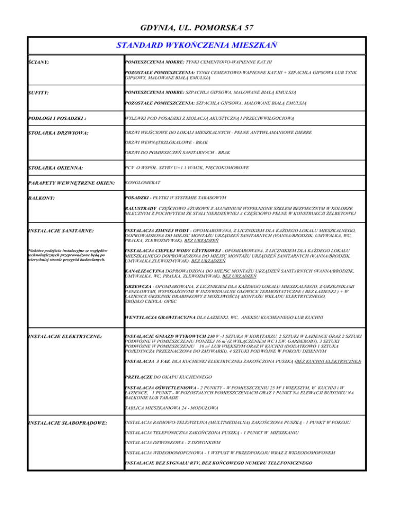 GDYNIA, UL. POMORSKA 57 STANDARD WYKOŃCZENIA MIESZKAŃ ŚCIANY: POMIESZCZENIA MOKRE: TYNKI CEMENTOWO-WAPIENNE KAT.III POZOSTAŁE POMIESZCZENIA: TYNKI CEMENTOWO-WAPIENNE KAT.III + SZPACHLA GIPSOWA LUB TYNK GIPSOWY, MALOWANE BIAŁĄ EMULSJĄ SUFITY: POMIESZCZENIA MOKRE: SZPACHLA GIPSOWA, MALOWANE BIAŁĄ EMULSJĄ POZOSTAŁE POMIESZCZENIA: SZPACHLA GIPSOWA, MALOWANE BIAŁĄ EMULSJĄ PODŁOGI I POSADZKI : WYLEWKI POD POSADZKI Z IZOLACJĄ AKUSTYCZNĄ I PRZECIWWILGOCIOWĄ STOLARKA DRZWIOWA: DRZWI WEJŚCIOWE DO LOKALI MIESZKALNYCH - PEŁNE ANTYWŁAMANIOWE DIERRE DRZWI WEWNĄTRZLOKALOWE - BRAK DRZWI DO POMIESZCZEŃ SANITARNYCH - BRAK STOLARKA OKIENNA: PCV O WSPÓŁ. SZYBY U=1.1 W/M2K, PIĘCIOKOMOROWE PARAPETY WEWNĘTRZNE OKIEN: KONGLOMERAT BALKONY: POSADZKI - PŁYTKI W SYSTEMIE TARASOWYM BALUSTRADY CZĘŚCIOWO AśUROWE Z ALUMINIUM WYPEŁNIONE SZKŁEM BEZPIECZNYM W KOLORZE MLECZNYM Z POCHWYTEM ZE STALI NIERDZEWNEJ A CZĘŚCIOWO PEŁNE W KONSTRUKCJI śELBETOWEJ INSTALACJE SANITARNE: INSTALACJA ZIMNEJ WODY - OPOMIAROWANA, Z LICZNIKIEM DLA KAśDEGO LOKALU MIESZKALNEGO, DOPROWADZONA DO MIEJSC MONTAśU URZĄDZEŃ SANITARNYCH (WANNA/BRODZIK, UMYWALKA, WC, PRALKA, ZLEWOZMYWAK), BEZ URZĄDZEŃ Niektóre podejścia instalacyjne ze względów technologicznych przeprowadzone będą po wierzchniej stronie przegród budowlanych. INSTALACJA CIEPŁEJ WODY UśYTKOWEJ - OPOMIAROWANA, Z LICZNIKIEM DLA KAśDEGO LOKALU MIESZKALNEGO DOPROWADZONA DO MIEJSC MONTAśU URZĄDZEŃ SANITARNYCH (WANNA/BRODZIK, UMYWALKA,ZLEWOZMYWAK), BEZ URZĄDZEŃ KANALIZACYJNA DOPROWADZONA DO MIEJSC MONTAśU URZĄDZEŃ SANITARNYCH (WANNA/BRODZIK, UMYWALKA, WC, PRALKA, ZLEWOZMYWAK), BEZ URZĄDZEŃ GRZEWCZA - OPOMIAROWANA, Z LICZNIKIEM DLA KAśDEGO LOKALU MIESZKALNEGO, Z GRZEJNIKAMI PANELOWYMI, WYPOSAśONYMI W INDYWIDUALNE GŁOWICE TERMOSTATYCZNE ( BEZ ŁAZIENKI ) + W ŁAZIENCE GRZEJNIK DRABINKOWY Z MOśLIWOŚCIĄ MONTAśU WKŁADU ELEKTRYCZNEGO, ŹRÓDŁO CIEPŁA: OPEC WENTYLACJA GRAWITACYJNA DLA ŁAZIENKI, WC, ANEKSU KUCHENNEGO LUB KUCHNI INSTALACJE ELEKTRYCZNE: INSTALACJE GNIAZD WTYKOWYCH 230 V -1 SZTUKA W KORYTARZU, 2 SZTUKI W ŁAZIENCE ORAZ 2 SZTUKI PODWÓJNE W POMIESZCZENIU PONIśEJ 16 m2 (Z WYŁĄCZENIEM WC I EW. GARDEROBY), 3 SZTUKI PODWÓJNE W POMIESZCZENIU 16 m2 LUB WIĘKSZYM ORAZ W KUCHNI (DODATKOWO 1 SZTUKA POJEDYNCZA PRZEZNACZONA DO ZMYWARKI), 4 SZTUKI PODWÓJNE W POKOJU DZIENNYM INSTALACJA 3 FAZ. DLA KUCHENKI ELEKTRYCZNEJ ZAKOŃCZONA PUSZKĄ (BEZ KUCHNI ELEKTRYCZNEJ) PRZYŁĄCZE DO OKAPU KUCHENNEGO INSTALACJA OŚWIETLENIOWA - 2 PUNKTY - W POMIESZCZENIU 25 M2 I WIĘKSZYM, W KUCHNI i W ŁAZIENCE, 1 PUNKT - W POZOSTAŁYCH POMIESZCZENIACH ORAZ 1 PUNKT NA ELEWACJI BUDYNKU NA BALKONIE LUB TARASIE TABLICA MIESZKANIOWA 24 - MODUŁOWA INSTALACJE SŁABOPRĄDOWE: INSTALACJA RADIOWO-TELEWIZYJNA (MULTIMEDIALNA) ZAKOŃCZONA PUSZKĄ - 1 PUNKT W POKOJU INSTALACJA TELEFONICZNA ZAKOŃCZONA PUSZKĄ - 1 PUNKT W MIESZKANIU INSTALACJA DZWONKOWA - Z DZWONKIEM INSTALACJA WIDEODOMOFONOWA - 1 WYPUST W PRZEDPOKOJU WRAZ Z WIDEODOMOFONEM INSTALACJE BEZ SYGNAŁU RTV, BEZ KOŃCOWEGO NUMERU TELEFONICZNEGO GDYNIA, UL. POMORSKA 57 STANDARD WYKOŃCZENIA BUDYNKU FUNDAMENTY: śELBETOWE ŚCIANY ZEWNĘTRZNE: W POZIOMIE KONDYGNACJI PIWNIC: ŚCIANY I SŁUPY śELBETOWE WYLEWANE NA MOKRO OSŁONOWE NADZIEMNE: MUROWANE Z BLOCZKÓW SILKA LUB śELBETOWE ŚCIANY WEWNĘTRZNE KONSTRUKCYJNE: W POZIOMIE KONYGNACJI PIWNIC: śELBETOWE WYLEWANE NA MOKRO W POZIOMIE KONDYGNACJI NADZIEMNYCH (OBUDOWUJĄCE KLATKĘ SCHODOWĄ I ODDZIELAJĄCE OD SIEBIE LOKALE MIESZKALNE): MUROWANE Z BLOCZKÓW SILKA LUB śELBETOWE ŚCIANY DZIAŁOWE: WEWNĄTRZ LOKALI MIESZKALNYCH Z BLOCZKÓW SILKA LUB ORT-GIPS STROPY: PŁYTA śELBETOWA TYPU "FILIGRAN" NA MOKRO BIEGI SCHODOWE: śELBETOWE, PŁYTOWE - WYLEWANE NA MOKRO DACH: STYROPIAN SPADKOWY POKRYTY PAPĄ TERMOZGRZEWALNĄ Z INSTALACJĄ ODGROMOWĄ STOLARKA DRZWIOWA I OKIENNA PCV LUB ALUMINIOWA O WSPÓŁ. SZYBY U=1.1 W/m2K KLATKI SCHODOWE: ŚCIANY: TYNKI CEMENTOWO-WAPIENNE + SZPACHLA GIPSOWA LUB TYNKI GIPSOWE, WYKOŃCZENIE WG ODRĘBNEJ ARANśACJI SCHODY I SPOCZNIKI: OBŁOśONE GRESEM ODPORNYM NA ŚCIERANIE, ANTYPOŚLIZGOWE BALUSTARDY: PEŁNE Z OCZEPEM DREWNIANYM I POCHWYTEM DREWNO/STAL NIERDZEWNA OŚWIETLENIE: STEROWANE AUTOMATEM SCHODOWYM (CZUJKI RUCHU) WINDA: KONE WYŁOśONA STALĄ NIERDZEWNĄ O WYMIARACH KABINY 1.10m x 2.10m x 2.10m POSADZKA: GRES STREFA WEJŚCIA: INDYWIDUALNE ARANśACJE GARAś PODZIEMNY: ŚCIANY: śELBETOWE, WYKOŃCZENIE - STRUKTURA BETONU POSADZKA:PŁYTA FUNDAMENTOWA Z BETONU HYDROTECHNICZNEGO ZATARTA NA GŁADKO, OZNAKOWANA BRAMY GARAśOWE: SEGMENTOWE, PODNOSZONE Z NAPĘDEM ELEKTRYCZNYM, STEROWANE PILOTEM OŚWIETLENIE: OPRAWY ŚWIETLÓWKOWE STEROWANE CZUJKAMI RUCHU WJAZD DO GARAśU PODZIEMNEGO PODGRZEWANY GARAśE INDYWIDUALNE: ŚCIANY: śELBETOWE LUB MUROWANE - MALOWANE POSADZKI: CEMENTOWE BRAMY GARAśOWE: UCHYLNE, RĘCZNIE STEROWANE, OCIEPLANE Z MOśLIWOŚCIĄ ZAINSTALOWANIA NAPĘDU ELEKTRYCZNEGO OŚWIETLENIE + 1 GNIAZDO GDYNIA, UL. POMORSKA 57 ZAGOSPODAROWANIE TERENU BUDYNEK USYTUOWANY ZOSTAŁ W CENTRALNEJ CZĘŚCI DZIAŁKI WEJŚCIE NA TEREN DZIAŁKI: OD STRONY ULICY POMORSKIEJ ARCHITEKTURA BUDYNKU: W CZĘŚCI FRONTOWEJ DWA WEJŚCIA DO KLATEK SCHODOWYCH, WJAZDY DO GARAśY INDYWIDUALNYCH DWUSTANOWISKOWYCH USYTUOWANYCH NA PARTERZE BUDYNKU ORAZ WJAZD I WYJAZD Z GARAśU PODZIEMNEGO WIELOSTANOWISKOWEGO, ARCHITEKTURĘ BUDYNKU UZUPEŁNIAJĄ DUśE TARASY I BALKONY POMIESZCZENIE NA ŚMIECI TEREN PRZED BUDYNKIEM UTWARDZONY