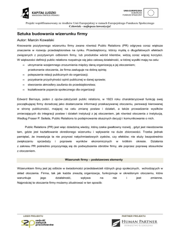 Projekt współfinansowany ze środków Unii Europejskiej w ramach Europejskiego Funduszu Społecznego Człowiek - najlepsza inwestycja! Sztuka budowania wizerunku firmy Autor: Marcin Kowalski Kreowanie pozytywnego wizerunku firmy zwane również Public Relations (PR) odgrywa coraz większe znaczenie w rozwoju przedsiębiorstwa na rynku. Przedsiębiorcy, którzy myślą o długofalowych efektach związanych z pozytywnym odbiorem firmy, lub produktów wśród klientów, widzą coraz więcej korzyści. W większości definicji public relations rozpatruje się jako celową działalność, w której wysiłki mają na celu: • utrzymanie wzajemnego zrozumienia między daną organizacją a jej otoczeniem; przekonanie otoczenia, że firma zasługuje na dobrą opinię; • polepszenie relacji publicznych do organizacji; • pozyskanie przychylności opinii publicznej w danej sprawie; • stworzenie atmosfery zaufania do przedsiębiorstwa; • kształtowanie poparcia społecznego dla organizacji Edward Bernays, jeden z ojców-założycieli public relations, w 1923 roku charakteryzował funkcję swej początkującej firmy doradczej jako dostarczanie informacji przekazywanej otoczeniu, perswazji kierowanej w stronę publiczności, mającej na celu zmianę postaw i działań, a także prowadzenie wysiłków zmierzających do integracji postaw i działań instytucji z jej otoczeniem, jak również otoczenia z instytucją. Według Fraser P. Seitela, Public Relations to podejmowanie słusznych decyzji i komunikowanie o nich. Public Relations (PR) jest więc dziedziną wiedzy, którą czeka gwałtowny rozwój , gdyż jest nieodzownie tam, gdzie jest kształtowanie określonego wizerunku i wpływanie na duże zbiorowości. Trzeba jednak pamiętać, że inwestycja ta nie przynosi natychmiastowych zysków, czy efektów; nie służy bezpośrednio zwiększaniu sprzedaży i poprawie wyników ekonomicznych w krótkim okresie. Działania z zakresu PR pośrednio przyczyniają się do podwyższenia obrotów firmy, ale poprzez poprawę stosunków z otoczeniem. Wizerunek firmy – podstawowe elementy Wizerunkiem firmy jest jej odbicie w świadomości przedstawicieli różnych grup społecznych, wchodzących w skład otoczenia. Firma, tak jak każda zresztą organizacja, funkcjonuje w określonym otoczeniu, które warunkuje jego działalność, wpływa na nie i jest Najprościej te otoczenie firmy możemy zilustrować w ten sposób: LIDER PROJEKTU PARTNER PROJEKTU zmienne. Projekt współfinansowany ze środków Unii Europejskiej w ramach Europejskiego Funduszu Społecznego Człowiek - najlepsza inwestycja! SPOŁECZNOŚ Ć LOKALNA PRACOWNI CY FIRMY FIRMA KLIENCI KONSUMENCI KONTRAHE NCI Należy przyjąć, że głównym celem Public Relations jest stworzenie pożądanego wizerunku firmy. Aby rozpocząć działania w tym zakresie, powinniśmy już na wstępie przeprowadzić własne badania. Dzięki nim znajdziemy odpowiedź na pytanie, jaki jest obecny wizerunek naszej firmy, a jaki jest lub powinien być pożądany. Okazuje się, że istnieją często różnice między tym, jak ocenia swój wizerunek dane przedsiębiorstwo, o tym, jaki jest on w grupach jego otoczenia. Firmy rozróżniają jedynie dwa rodzaje wizerunku: • wizerunek własny - wśród pracowników lub współpracowników firmy; • wizerunek obcy - wizerunek w pozostałych grupach otoczenia firmy np. kluczowi odbiorcy. Badanie wizerunku przedsiębiorstwa połączone jest często z badaniem wizerunku posiadanych określonych marek (produktów). Najczęściej przedmiotem badań są: • wiedza o istnieniu przedsiębiorstwa na rynku lokalnych lub krajowym; • znajomość jego znaku firmowego/ handlowego; • charakter przedsiębiorstwa (czym się zajmuje, jego profil działalności); • wiedza o oferowanych produktach czy usługach na rynku; • usytuowanie wśród przedsiębiorstw konkurencyjnych. W celu dokładniejszego poznania wizerunku przedsiębiorstwa, często stosuje się badania jakościowe, w tym metodę zogniskowanych wywiadów grupowych. Polega ona na gromadzeniu w jednym miejscu celowo dobranej, nielicznej reprezentacji osób (6-8 osób) i przeprowadzeniu z nimi wywiadu w postaci dyskusji moderowanej. Wywiad często odbywa się w formie dyskusji, gdyż przepływ informacji nie odbywa się jedynie w jedną stronę, ale każdy uczestnik grupy słyszy uwagi innych i reaguje na nie. LIDER PROJEKTU PARTNER PROJEKTU Projekt współfinansowany ze środków Unii Europejskiej w ramach Europejskiego Funduszu Społecznego Człowiek - najlepsza inwestycja! Przedmiotem badań może być m.in.: • wiedza o istnieniu przedsiębiorstwa na rynku; • znajomość jego znaku firmowego, marki; • charakter przedsiębiorstwa (czym się zajmuje); • wiedza o oferowanych produktach czy usługach na rynku; • usytuowanie wśród przedsiębiorstw konkurencyjnych. Formy działań Public Relations Firmowa działalność Public Relations może przybierać bardzo różne formy. Zależy to od budżetu promocyjnego/marketingowego, jakim dysponuje firma, zaplecza kadrowego (zasobów), czy nawet przyjętej i realizowanej strategii PR. W poniższym zestawieniu przedstawiam przykładowe działania w ramach różnych form PR. Współpraca ze środkami masowego przekazu została tutaj podzielone na formę prasową oraz formy radiową i telewizyjną oraz internetową. Forma prasowa • regularna działalność rzecznika prasowego, lub specjalisty ds. PR; • notatki prasowe (np. o podpisanych kontraktach, ważniejszych wydarzeniach firmowych, itp.); • reportaż o współpracy firmy z instytucjami naukowymi lubch organizacjami pozarządowymi; • oświadczenia prasowe (odpowiedź na krytykę publiczną, ataki medialne); • zwoływanie konferencji prasowych lub briefingów. Forma telewizyjna • reportaż o przygotowaniach do uruchomienia nowej produkcji, czy otwarciu nowego oddziału danego przedsiębiorstwa; • informacja lub relacja radiowa do serwisu (dziennika); 