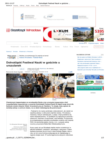 2011-12-27 Gazeta.pl Prezenty Dolnośląski Festiwal Nauki w gościnie … Tokfm.pl Poczta Forum Blogi Gazeta Wyborcza Wrocław 9ºC Szukaj Wiadomości Gazeta.pl Wrocław Witaj gościu z Euro 2012 Wrocław.Sport.pl Komunikacja Biznes Kultura Kina Forum Prognoza pogody Ogłoszenia Zmień miasto Prześlij nam informację Wiadomości z Wrocławia NAJCZĘŚCIEJ CZYTANE Możliwe, że zainteresują Cię artykuły na temat: 24 h Nie ma szans na S-Bahn Wrocław i w 2012 ... historia Wrocławia Festiwal Nauki Więźniowie i zakonnice? Sami mordercy i ... Zwycięsko przetrwał atak hakerów, chce ... Dolnośląski Festiwal Nauki w gościnie u urszulanek 0 Najlepsze budynki z 10 lat - aż 16 ... Jaka pogoda czeka nas w najbliższe dni i ... Lubiane przez 29 osób. Rejestracja, aby zobaczyć, co lubią Twoi znajomi. Lubię to! Rozmawiała Aneta Augustyn Jak uczą wrocławskie ogólniaki? Mamy ... 15.09.2011 , aktualizacja: 18.09.2011 10:16 Sylwester pod chmurką? Nie tylko we Wrocławiu! A AA REKLAMA re k lam a Chemiczny happening Fot. Mieczysław Michalak / Agencja Gazeta Chemicznym happeningiem na wrocławskim Rynku oraz uroczystą inauguracją w Auli Leopoldyńskiej rozpoczął się w czwartek Dolnośląski Festiwal Nauki W piątek swoje drzwi dla festiwalu otwiera klasztor Sióstr Urszulanek przy pl. Nankiera. To okazja, żeby zajrzeć do żeńskiej szkoły w centrum miasta, na co dzień niedostępnej dla postronnych. Fot. Mieczysław Michalak / Agencja Gazeta Chemiczny happening na wrocławskim Rynku otworzył tegoroczny Dolnośląski Festiwal Nauki - Festiwal to nie nauka zamknięta w laboratoriach, ale radość ze wspólnej zabawy w odkrywaniu tajników wiedzy. Wrocławscy naukowcy robią to wolontaryjnie, z pasją i chęcią dzielenia się swoim doświadczeniem. To dydaktyka na najwyższym poziomie mówił prof. Kazimierz Orzechowski, szef festiwalu. Przypomniał, że przygotowują go wszystkie wrocławskie uczelnie oraz instytuty PAN i że dominantą będzie chemia, m.in. z powodu setnej rocznicy przyznania Nobla Marii Skłodowskiej-Curie. Przez sześć dni we Wrocławiu będzie można uczestniczyć w kilkuset wykładach, pokazach, warsztatach, spacerach. Potem festiwal przeniesie się do innych miast Dolnego Śląska, które z roku na rok coraz liczniej przyłączają się do największego w regionie święta nauki. W sumie tegoroczna edycja to rekordowe …gazeta.pl/…/1,35771,10296044,Dol… 1/3 2011-12-27 Dolnośląski Festiwal Nauki w gościnie … niemal 1200 imprez. Fot. Mieczysław Michalak / Agencja Gazeta Chemiczny happening na Rynku otworzył tegoroczny Dolnośląski Festiwal Nauki w ięcej zdjęć Urszulanki z pl. Nankiera w tym roku świętują 200-lecie swojej obecności w tym miejscu. O urszulankach z Breslau i z Wrocławia opowie w piątek siostra prof. Ewa Józefa Jezierska, była wieloletnia matematyczka i dyrektorka urszulańskiego liceum, także profesor teologii na Papieskim Wydziale Teologicznym. Siostra poprowadzi przez korytarz św. Klary pełen barokowych obrazów ukazujących życie świętej, uchyli wejścia do katakumb, zaprowadzi do zielonego wirydarza, do kościoła z grobowcem księżnej Anny, fundatorki klasztoru klarysek, i z obrazem św. Urszuli pędzla M. L. Willmanna. Spacer poprzedzi pokaz slajdów z dawnego i obecnego klasztoru. Rozmowa z s. prof. Ewą J. Jezierską Aneta Augustyn: Utrzymujecie kontakt z niemieckimi urszulankami, które mieszkały tu przed wami? Siostra profesor Ewa J. Jezierska: Tak, z siostrą Carolą Kahler z Bielefeld, która wstąpiła do klasztoru Urszulanek niemieckich w Breslau w 1939 roku. Była nauczycielką historii. Po zakończeniu wojny wyjechała wraz z 70 innymi urszulankami do Bielefield, gdzie podjęły pracę w szkole. Dziś z tej grupy sióstr pozostało tam tylko sześć. Po wybuchu wojny nauczanie w naszych szkołach w Breslau było prowadzone do jesieni 1940 roku, kiedy władze niemieckie zamknęły je i częściowo zajęły budynki klasztorne. Sztab SS przejął w tym klasztorze rozmównice, korytarze, a nawet grobowce. Ponieważ nasz budynek ocalał podczas wojny, stał się czasowym schronieniem dla kleryków z seminarium, personelu kurii metropolitalnej i różnych zgromadzeń zakonnych. Po zakończeniu wojny na prośbę urszulanek niemieckich we Wrocławiu pojawiły się polskie, które przez kilkanaście miesięcy żyły jeszcze wspólnie pod jednym dachem. Pierwszą przełożoną po wojnie w grudniu 1945 roku została siostra Zenobia Krupik, mówiąca także po niemiecku. Wkrótce przybyła do Wrocławia siostra Celestyna Talarczyk, która zaczęła organizować dom dla studentek uniwersytetu, który właśnie ruszał. To u nas w sierpniu 1945 roku nastąpiło przejęcie diecezji przez kościelną władzę polską z rąk kościelnej władzy niemieckiej. Stronę polską reprezentowali ksiądz Karol Milik i ksiądz Bolesław Kominek. REKLAMA Wewnętrzny kościół w latach 70. został zamieniony na mauzoleum Piastów. Co zobaczymy podczas festiwalowego spaceru? REKLAMA - Klasztor Klarysek ufundowała księżna Anna, żona Henryka II Pobożnego; u nas została pochowana. W podziemiach kościoła spoczywają inni Piastowie, np. Henrykowie: III, V, VI, ich żony i córki. Ciekawostką jest urna znajdująca się w kościelnym oknie, ale o tym opowiem podczas spaceru. Reklamy Businessclick Microsoft Chmura Prywatna Wybierz rozwiązania Microsoft. Sprawdź korzyści z pracy w chmurze! Microsoft.com REKLAMA Obligacje Skarbowe Pewna inwestycja. Od 2 do 10 lat. Kup Obligacje Skarbowe ! obligacjeskarbowe.pl Nissany dostawcze Niech samochód stanie się Twoim współpracownikiem. Sprawdź ofertę! www.nissan.pl Reklamy BusinessClick Misją zakonu jest nauczanie. Kiedy we Wrocławiu powstała pierwsza szkoła urszulańska? - Urszulanki niemieckie przyjechały do Wrocławia z Kłodzka w 1686 roku i po czasowym zatrzymaniu się u klarysek zakupiły dwa domy przy ul. Łaciarskiej (wówczas Pokutniczej). Wkrótce otworzyły 