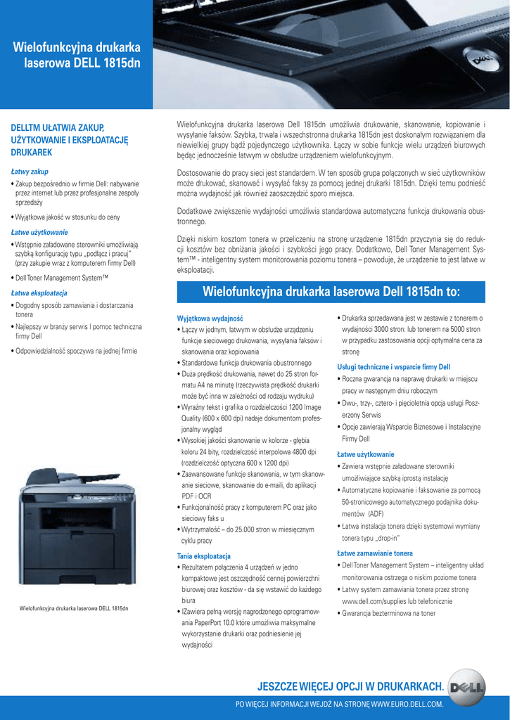 Wielofunkcyjna drukarka laserowa DELL 1815dn DELLTM UŁATWIA ZAKUP, UŻYTKOWANIE I EKSPLOATACJĘ DRUKAREK Wielofunkcyjna drukarka laserowa Dell 1815dn umożliwia drukowanie, skanowanie, kopiowanie i wysyłanie faksów. Szybka, trwała i wszechstronna drukarka 1815dn jest doskonałym rozwiązaniem dla niewielkiej grupy bądź pojedynczego użytkownika. Łączy w sobie funkcje wielu urządzeń biurowych będąc jednocześnie łatwym w obsłudze urządzeniem wielofunkcyjnym. Łatwy zakup Dostosowanie do pracy sieci jest standardem. W ten sposób grupa połączonych w sieć użytkowników może drukować, skanować i wysyłać faksy za pomocą jednej drukarki 1815dn. Dzięki temu podnieść można wydajność jak również zaoszczędzić sporo miejsca. • Zakup bezpośrednio w firmie Dell: nabywanie przez internet lub przez profesjonalne zespoły sprzedaży • Wyjątkowa jakość w stosunku do ceny Łatwe użytkowanie • Wstępnie załadowane sterowniki umożliwiają szybką konfigurację typu „podłącz i pracuj” (przy zakupie wraz z komputerem firmy Dell) • Dell Toner Management System™ Łatwa eksploatacja • Dogodny sposób zamawiania i dostarczania tonera • Najlepszy w branży serwis I pomoc techniczna firmy Dell • Odpowiedzialność spoczywa na jednej firmie Wielofunkcyjna drukarka laserowa DELL 1815dn Dodatkowe zwiększenie wydajności umożliwia standardowa automatyczna funkcja drukowania obustronnego. Dzięki niskim kosztom tonera w przeliczeniu na stronę urządzenie 1815dn przyczynia się do redukcji kosztów bez obniżania jakości i szybkości jego pracy. Dodatkowo, Dell Toner Management System™ - inteligentny system monitorowania poziomu tonera – powoduje, że urządzenie to jest łatwe w eksploatacji. Wielofunkcyjna drukarka laserowa Dell 1815dn to: Wyjątkowa wydajność • Łączy w jednym, łatwym w obsłudze urządzeniu funkcje sieciowego drukowania, wysyłania faksów i skanowania oraz kopiowania • Standardowa funkcja drukowania obustronnego • Duża prędkość drukowania, nawet do 25 stron formatu A4 na minutę (rzeczywista prędkość drukarki może być inna w zależności od rodzaju wydruku) • Wyraźny tekst i grafika o rozdzielczości 1200 Image Quality (600 x 600 dpi) nadaje dokumentom profesjonalny wygląd • Wysokiej jakości skanowanie w kolorze - głębia koloru 24 bity, rozdzielczość interpolowa 4800 dpi (rozdzielczość optyczna 600 x 1200 dpi) • Zaawansowane funkcje skanowania, w tym skanowanie sieciowe, skanowanie do e-maili, do aplikacji PDF i OCR • Funkcjonalność pracy z komputerem PC oraz jako sieciowy faks u • Wytrzymałość – do 25.000 stron w miesięcznym cyklu pracy Tania eksploatacja • Rezultatem połączenia 4 urządzeń w jedno kompaktowe jest oszczędność cennej powierzchni biurowej oraz kosztów - da się wstawić do każdego biura • IZawiera pełną wersję nagrodzonego oprogramowania PaperPort 10.0 które umożliwia maksymalne wykorzystanie drukarki oraz podniesienie jej wydajności • Drukarka sprzedawana jest w zestawie z tonerem o wydajności 3000 stron: lub tonerem na 5000 stron w przypadku zastosowania opcji optymalna cena za stronę Usługi techniczne i wsparcie firmy Dell • Roczna gwarancja na naprawę drukarki w miejscu pracy w następnym dniu roboczym • Dwu-, trzy-, cztero- i pięcioletnia opcja usługi Poszerzony Serwis • Opcje zawierają Wsparcie Biznesowe i Instalacyjne Firmy Dell Łatwe użytkowanie • Zawiera wstępnie załadowane sterowniki umożliwiające szybką iprostą instalację • Automatyczne kopiowanie i faksowanie za pomocą 50-stronicowego automatycznego podajnika dokumentów (ADF) • Łatwa instalacja tonera dzięki systemowi wymiany tonera typu „drop-in” Łatwe zamawianie tonera • Dell Toner Management System – inteligentny układ monitorowania ostrzega o niskim poziome tonera • Łatwy system zamawiania tonera przez stronę www.dell.com/supplies lub telefonicznie • Gwarancja bezterminowa na toner JESZCZE WIĘCEJ OPCJI W DRUKARKACH. PO WIĘCEJ INFORMACJI WEJDŹ NA STRONĘ WWW.EURO.DELL.COM. Wielofunkcyjna drukarka laserowa DELL 1815dn TONER FIRMY DELL PROSTY JAK DRUT SYSTEM ZARZĄDZANIA™ 1. Kiedy obniży się poziom tonera inteligentne oprogramowanie wyśle ostrzeżenie. Zdefiniuj odbiorcę ostrzeżenia za pomocą DellTM Printer Configuration Web Tool (Narzędzia Konfigurowania Sieciowego Drukarki Dell™) Cechy Typ produktu Funkcje Maksymalna rozdzielczość wydruku (B&W) Maksymalna rozdzielczość skanowania Prędkość drukowania Pamięć Procesor Panel sterowania Procesor Pojemność podajnika Pojemność tacki odbiorczej (Standard / Maks.) Maksymalne rozmiary nośnika (standard) Zakres zooma Wyposażenie w zestawie Miesięczny cykl pracy (maks.) Auto-dupleks Podajnik(i) nośnika 2. Kliknij na “Zamów toner online” dzięki czemu znajdziesz się na stronie Dell 3. Wybierz model drukarki. Złożenie zamówienia Rozmiary nośnika (szuflada główna) Rozmiary nośnika (zewnętrzny tor bypass) Typy nośników na toner przyjęte zostanie po wprowadzeniu Praca w sieci Port(y) / Łącznik(i) - Tył Port(y) / Łącznik(i) - Przód Opcjonalne sloty Dostępne tonery1 informacji o płatności. W ten sposób oszczędza się czas i pieniądze – dostawa dokonywana jest bez dodatkowych opłat. Niewielka opłata jeśli Gramatura papieru Wsparcie dla PostScript Protokół drukarki Oprogramowanie w zestawie dostawa ma nastąpić dnia następnego USŁUGI TECHNICZNE I WSPARCIE • Roczna usługa napraw drukarki w miejscu pracy w następnym dniu roboczym Next-BusinessDay On-site Service3 oferowana przez fachowy personel serwisowy • Konserwacja grzałki utrwalającej (fuser) jest standardem przez cały okres trwania gwarancji Obsługiwana czcionka Wymiary (Szer. x Gł. x Wys.) Waga Obsługiwane systemy operacyjne Akustyka2 Wilgotność względna Maksymalna wysokość npm Maks. temperatura otoczenia w czasie pracy Min temperatura otoczenia w czasie pracy Zasila