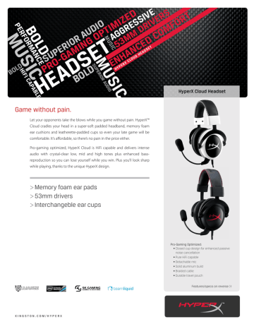 MU SIC P SU HY L XC R PE OU D A HE DS ET IO LE SIC AB AP UD RA IC IO ER HIF H MU D L BO T E S D A E E SIC MU C AN RM FO LD BO R PE D SIVE ERS RT E Z ES IV FO I O I D PTIMGGR DR OM U A O A MM C R D 3 G O I IN E 5 R C N PEGAM A U H S ON E R P D L BO HyperX Cloud Headset Game without pain. Let your opponents take the blows while you game without pain. HyperX™ Cloud cradles your head in a super-soft padded headband, memory foam ear cushions and leatherette-padded cups so even your late game will be comfortable. It’s affordable, so there’s no pain in the price either. Pro-gaming optimized, HyperX Cloud is HiFi capable and delivers intense audio with crystal-clear low, mid and high tones plus enhanced bassreproduction so you can lose yourself while you win. Plus you’ll look sharp while playing, thanks to the unique HyperX design. >>Memory foam ear pads >>53mm drivers >>Interchangeble ear cups Pro-Gaming Optimized: • Closed cup design for enhanced passive noise cancellation • Pure HiFi capable • Detachable mic • Solid aluminum build • Braided cable • Durable travel pouch Features/specs on reverse >> KINGSTON.COM/HYPERX AB AP BL SRIACUDIO MSUUPERIO LE SICDURA E F E AT U R E S / B E N E F I T S >> Comfortable — memory foam ear cushions with leatherette-padded headband >> Customizable — switch between leatherette and velour ear cushions for varying sound profiles and feel >> Compatible — with PCs, notebooks, tablets, mobile phones, airplane adapters and PS4 consoles >> Distinctive — HyperX branded design in red and black or white and black >> Guaranteed — two-year warranty, free technical support S P E C I F I C AT I O N S Headset >> Transducer type dynamic Ø 53mm >> Operating principle closed >> Frequency response 15Hz–25,000 Hz H Y P E R X PA R T N U M B E R S >> Nominal impedance 60 Ω per system >> Nominal SPL 98±3dB >> T.H.D. < 2% >> Power handling capacity 150mW >> Sound coupling to the ear circumaural >> Ambient noise attenuation approx. 20 dBa >> Headband pressure 5N >> Weight with microphone and cable 350g >> Cable length and type 1m + 2m extension + 10cm iPhone >> Connection mini stereo jack plug (3.5 mm) Microphone >> Transducer type condenser (back electret) >> Operating principle pressure gradient >> Polar pattern cardioid >> Power supply AB powering >> Supply voltage 2V >> Current consumption max 0.5 mA >> Nominal impedance ≤2.2 kΩ >> Open circuit voltage at f = 1 kHz: 20 mV / Pa >> Frequency response 100–12,000 Hz >> THD 2% at f = 1 kHz >> Max. SPL 105dB SPL (THD≤1.0% at 1 KHz) >> Microphone output -39±3dB >> Length mic boom 150mm (include gooseneck) >> Capsule diameter Ø6*5 mm >> Connection mini stereo jack plug (3.5mm) HyperX is a division of Kingston. THIS DOCUMENT SUBJECT TO CHANGE WITHOUT NOTICE. ©2015 Kingston Technology Corporation, 17600 Newhope Street, Fountain Valley, CA 92708 USA. All rights reserved. All trademarks and registered trademarks are the property of their respective owners. MKD-288.2US Black KHX-H3CL/WR White KHX-H3CLW SIC IC MU HyperX Cloud Headset S E R E IV SS RE T G G LD E G A AGADS BO C I E S H U M MU MU HIF LD BO SIC E V I S