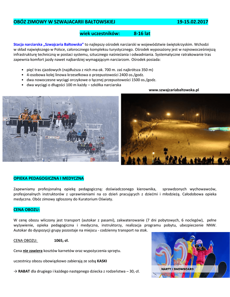 OBÓZ ZIMOWY W SZWAJACARII BAŁTOWSKIEJ wiek uczestników: 19-15.02.2017 8-16 lat Stacja narciarska „Szwajcaria Bałtowska” to najlepszy ośrodek narciarski w województwie świętokrzyskim. Wchodzi w skład największego w Polsce, całorocznego kompleksu turystycznego. Ośrodek wyposażony jest w najnowocześniejszą infrastrukturę techniczną w postaci systemu, sztucznego naśnieżania i odwadniania. Systematyczne ratrakowanie tras zapewnia komfort jazdy nawet najbardziej wymagającym narciarzom. Ośrodek posiada: • • • • pięć tras zjazdowych (najdłuższa z nich ma ok. 700 m. zaś najkrótsza 350 m) 4-osobowa kolej linowa krzesełkowa o przepustowości 2400 os./godz. dwa nowoczesne wyciągi orczykowe o łącznej przepustowości 1500 os./godz. dwa wyciągi o długości 100 m każdy – szkółka narciarska www.szwajcariabaltowska.pl OPIEKA PEDAGOGICZNA I MEDYCZNA Zapewniamy profesjonalną opiekę pedagogiczną: doświadczonego kierownika, sprawdzonych wychowawców, profesjonalnych instruktorów z uprawnieniami na co dzień pracujących z dziećmi i młodzieżą. Całodobowa opieka medyczna. Obóz zimowy zgłoszony do Kuratorium Oświaty. CENA OBOZU: W cenę obozu wliczony jest transport (autokar z pasami), zakwaterowanie (7 dni pobytowych, 6 noclegów), pełne wyżywienie, opieka pedagogiczna i medyczna, instruktorzy, realizacja programu pobytu, ubezpieczenie NNW. Autokar do dyspozycji grupy pozostaje na miejscu - codzienny transport na stok. CENA OBOZU: 1065,-zł. Cena nie zawiera kosztów karnetów oraz wypożyczenia sprzętu. uczestnicy obozu obowiązkowo zabierają ze sobą KASKI → RABAT dla drugiego i każdego następnego dziecka z rodzeństwa – 30,-zł. ZAKWATEROWANIE Ośrodek szkoleniowo-wypoczynkowy "Leśne Kąty" - usytuowany jest w malowniczej okolicy w bezpośrednim sąsiedztwie lasu, 5 km od Ostrowca Świętokrzyskiego, 8 km od Szwajcarii Bałtowskiej. Oferuje wspaniałe warunki do wypoczynku i przytulną atmosferę. Obiekt posiada 80 miejsc noclegowych w standardzie studio 2- lub 3-osobowe i pokoje 2-osobowe. Wszystkie pokoje z pełnym węzłem sanitarnym. Do dyspozycji 4 sale świetlicowe. Na terenie ośrodka stół do tenisa oraz piłkarzyki. Ośrodek ogrodzony z boiskiem do piłki. WYŻYWIENIE Pełne wyżywienie – na miejscu w stołówce ośrodka – śniadanie, kolacja (stół szwedzki), obiad (zupa w wazach II danie serwowane), podwieczorek. Pobyt na obozie zaczyna się obiadokolacją a kończy obiadem. Pyszna, domowa kuchnia przyjazna alergikom. PROGRAM POBYTU: - codzienne zajęcia na stoku pod opieką instruktora - nauka od podstaw i doskonalenie technik jazdy na nartach i snowboardzie w podziale na grupy zaawansowania; jazdy nocne. - SNOWPARK – dla starszych i doświadczonych narciarzy/snowboarderów coś dla spragnionych adrenaliny – pierwszy na terenie województwa świętokrzyskiego profesjonalny SnowPark. Wszystkie najpopularniejsze przeszkody, charakterystyczne dla tego typu obiektów: poręcz spadowa, Box prosty, Butter Box, Box rainbow, Box disaster, Wallride, jeśli warunki pogodowe pozwolą nie zabraknie również profesjonalnej skoczni. - wycieczka do Ostrowca Świętokrzyskiego - Park Miejski im. Józefa Piłsudskiego, pływalnia Rawszczyzna (wielofunkcyjny, dziesięciotorowy basen o wymiarach olimpijskich z przesuwnym pomostem, miejsce treningów Otylii Jędrzejczak. W części rekreacyjnej znajduje się basen do nauki pływania oraz basen rekreacyjny ze sztuczną rzeką, gejzerami, biczami wodnymi oraz dwoma zjeżdżalniami) - wycieczka do Ćmielowa - zwiedzanie Żywego Muzeum Porcelany - jednego z 7 cudów nowej Polski, gdzie zobaczyć można na żywo jak powstaje porcelana. Będzie możliwość zapoznania się z procesem produkcji porcelany i obejrzeć współczesną kolekcję porcelany www.turystyka.cmielow.com.pl - zwiedzanie najstarszej w Polsce prahistorycznej kopalni krzemienia pasiastego wraz z warsztatami www.krzemionki.pl - wizyta w Wiosce Świętego Mikołaja - kino 5D - kolejka Rollercoaster dla starszych dzieci – (jeśli będzie czynna – atrakcja uzależniona od warunków atmosferycznych) - kulig i ognisko - gry i zabawy na świeżym powietrzu - dyskoteki i wieczory filmowe - zimowe konkursy i wiele innych atrakcji ORGANIZACJA I PROWADZENE Fundacja „ANIMADA” ul. Legnicka 65, 54-206 Wrocław/ www.animada.pl; [email protected] Koordynator wyjazdu: Anna Jantas tel. 579-077-363 ZAPISY NA ZIMOWISKO I WARUNKI REZERWACJI MIEJSCA 1. Zgłoszenie uczestnictwa drogą mailową na adres: [email protected] lub sms na nr: 579-077-363 Zgłoszenie w formie: Szwajcaria, imię i nazwisko dziecka, wiek dziecka, kontakt do rodziców – tel. i e-mail 2. Harmonogram wpłat: - 300,-zł. – zaliczka równoznaczna z rezerwacją miejsca - 200,-zł. - do 20 XI 2016 - 200,-zł. – do 20 XII 2016 - pozostała część - najpóźniej do 16.01.2017 3. Wypełnienie i podpisanie karty kwalifikacyjne uczestnika obozu zimowego, oświadczenia zawierającego zgodę na udział dziecka w obozie, oświadczenia o zapoznaniu się z Regulaminem , warunkami uczestnictwa w obozie oraz na przetwarzanie danych osobowych (dokumenty zostaną przesłane na adres e-mail po otrzymaniu zgłoszenia) . Wypełnione dokumenty można wysłać pocztą na adres fundacji lub złożyć osobiście: Fundacja „Animada” ul. Legnicka 65, 54-206 Wrocław lub oryginały złożyć w czasie styczniowego zebrania (w tym przypadku prosimy o wcześniejsze przesłanie skanu wypełnionych dokumentów drogą e-mail: [email protected] najlepiej do 22 XII 2016) 4. Wpłaty na konto Fundacji: Fundacja „Animada” Bank BGŻBNPParibas S.A nr rachunku: 91 2030 0045 1110 0000 0416 4520 Tytuł przelewu: Imię i nazwisko dziecka – Obóz Szwajcaria Bałtowska 2017 O zakwalifikowaniu się dziecka na obóz zimowy w Szwajcarii Bałtowskiej 2017 decyduje kolejność zgłoszeń i wpłata zaliczki na konto. Fundacja „ANIMADA” jest organizacją non-profit, dlatego wszystkie pozyskane ś