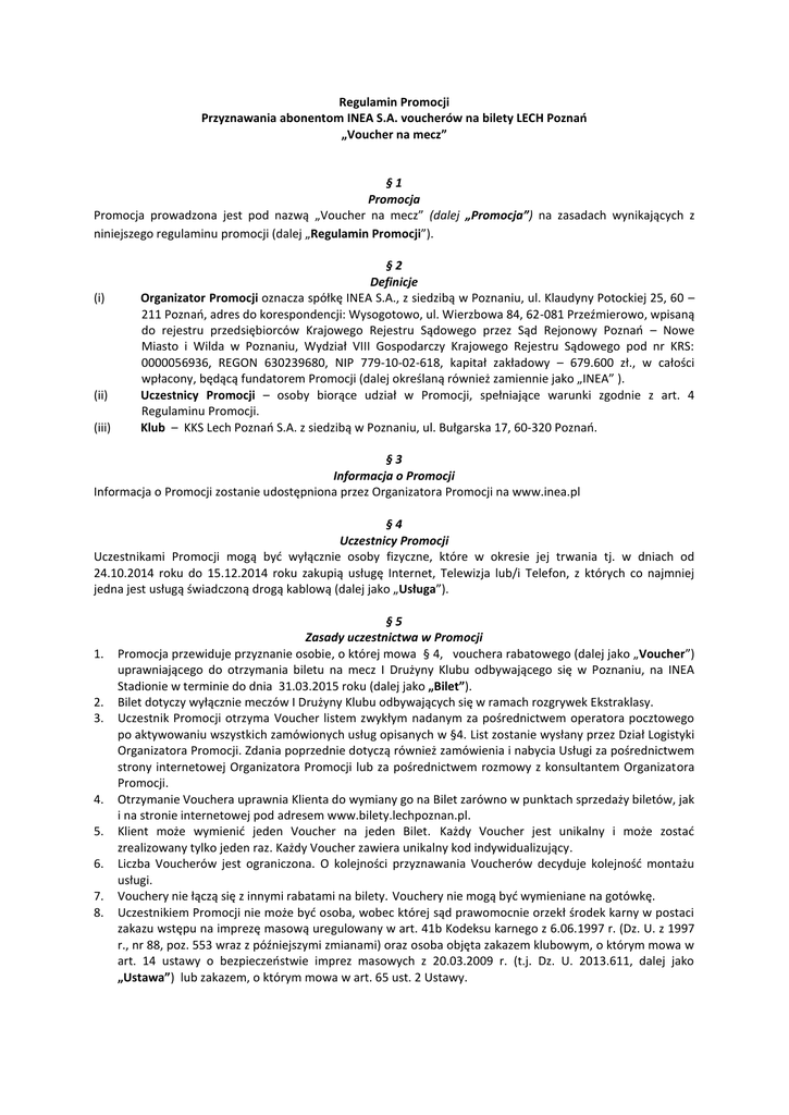 Regulamin Promocji Przyznawania abonentom INEA S.A. voucherów na bilety LECH Poznań „Voucher na mecz” §1 Promocja Promocja prowadzona jest pod nazwą „Voucher na mecz” (dalej „Promocja”) na zasadach wynikających z niniejszego regulaminu promocji (dalej „Regulamin Promocji”). (i) (ii) (iii) §2 Definicje Organizator Promocji oznacza spółkę INEA S.A., z siedzibą w Poznaniu, ul. Klaudyny Potockiej 25, 60 – 211 Poznań, adres do korespondencji: Wysogotowo, ul. Wierzbowa 84, 62-081 Przeźmierowo, wpisaną do rejestru przedsiębiorców Krajowego Rejestru Sądowego przez Sąd Rejonowy Poznań – Nowe Miasto i Wilda w Poznaniu, Wydział VIII Gospodarczy Krajowego Rejestru Sądowego pod nr KRS: 0000056936, REGON 630239680, NIP 779-10-02-618, kapitał zakładowy – 679.600 zł., w całości wpłacony, będącą fundatorem Promocji (dalej określaną również zamiennie jako „INEA” ). Uczestnicy Promocji – osoby biorące udział w Promocji, spełniające warunki zgodnie z art. 4 Regulaminu Promocji. Klub – KKS Lech Poznań S.A. z siedzibą w Poznaniu, ul. Bułgarska 17, 60-320 Poznań. §3 Informacja o Promocji Informacja o Promocji zostanie udostępniona przez Organizatora Promocji na www.inea.pl §4 Uczestnicy Promocji Uczestnikami Promocji mogą być wyłącznie osoby fizyczne, które w okresie jej trwania tj. w dniach od 24.10.2014 roku do 15.12.2014 roku zakupią usługę Internet, Telewizja lub/i Telefon, z których co najmniej jedna jest usługą świadczoną drogą kablową (dalej jako „Usługa”). 1. 2. 3. 4. 5. 6. 7. 8. §5 Zasady uczestnictwa w Promocji Promocja przewiduje przyznanie osobie, o której mowa § 4, vouchera rabatowego (dalej jako „Voucher”) uprawniającego do otrzymania biletu na mecz I Drużyny Klubu odbywającego się w Poznaniu, na INEA Stadionie w terminie do dnia 31.03.2015 roku (dalej jako „Bilet”). Bilet dotyczy wyłącznie meczów I Drużyny Klubu odbywających się w ramach rozgrywek Ekstraklasy. Uczestnik Promocji otrzyma Voucher listem zwykłym nadanym za pośrednictwem operatora pocztowego po aktywowaniu wszystkich zamówionych usług opisanych w §4. List zostanie wysłany przez Dział Logistyki Organizatora Promocji. Zdania poprzednie dotyczą również zamówienia i nabycia Usługi za pośrednictwem strony internetowej Organizatora Promocji lub za pośrednictwem rozmowy z konsultantem Organizatora Promocji. Otrzymanie Vouchera uprawnia Klienta do wymiany go na Bilet zarówno w punktach sprzedaży biletów, jak i na stronie internetowej pod adresem www.bilety.lechpoznan.pl. Klient może wymienić jeden Voucher na jeden Bilet. Każdy Voucher jest unikalny i może zostać zrealizowany tylko jeden raz. Każdy Voucher zawiera unikalny kod indywidualizujący. Liczba Voucherów jest ograniczona. O kolejności przyznawania Voucherów decyduje kolejność montażu usługi. Vouchery nie łączą się z innymi rabatami na bilety. Vouchery nie mogą być wymieniane na gotówkę. Uczestnikiem Promocji nie może być osoba, wobec której sąd prawomocnie orzekł środek karny w postaci zakazu wstępu na imprezę masową uregulowany w art. 41b Kodeksu karnego z 6.06.1997 r. (Dz. U. z 1997 r., nr 88, poz. 553 wraz z późniejszymi zmianami) oraz osoba objęta zakazem klubowym, o którym mowa w art. 14 ustawy o bezpieczeństwie imprez masowych z 20.03.2009 r. (t.j. Dz. U. 2013.611, dalej jako „Ustawa”) lub zakazem, o którym mowa w art. 65 ust. 2 Ustawy. 1. 2. 1. §6 Czas trwania Promocji Promocja rozpoczyna się dnia 24.10.2014 roku i kończy w dniu 15.12.2014 roku o godzinie 24:00. Organizator Promocji zastrzega sobie prawo do wcześniejszego zakończenia Promocji. Wydane Uczestnikom Promocji Vouchery będą mogły zostać zrealizowane najpóźniej w terminie do dnia 31.03.2015 roku. §7 Reklamacje i skargi Reklamacje lub skargi ze strony Uczestników Promocji dotyczące jej organizacji powinny być składane w formie pisemnej na adres: INEA S.A Wysogotowo, ul. Wierzbowa 84 62-081 Przeźmierowo Reklamacje Z dopiskiem „Voucher na mecz” 2. 3. 4. 5. Reklamacje lub skargi składane w formie pisemnej powinny zawierać: imię, nazwisko i dokładny adres Uczestnika Promocji, numer telefonu kontaktowego, jak również dokładny opis podstaw reklamacji lub skargi oraz podpis Uczestnika Promocji. Po otrzymaniu reklamacji lub skargi, Organizator Promocji rozpatrzy ją w terminie 30 dni od daty jej otrzymania. Decyzja Organizatora Promocji w przedmiocie reklamacji lub skargi jest ostateczna i wiążąca. Za organizację meczu, w tym jego przeniesienie w czasie lub w inne miejsce, odwołanie oraz za prawidłowe działalnie strony internetowej, o której mowa w § 5 ust. 3, odpowiada Klub. Organizator Promocji nie odpowiada za zdarzenia określone w zdaniu poprzedzającym. §8 Postanowienia końcowe Każdy z biorących udział w Promocji, poprzez przystąpienie do Promocji akceptuje warunki Regulaminu Promocji. Poznań, dnia 24 października 2014 roku