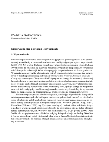 http://dx.doi.org./10.17651/POLON.35.13 POLONICA XXXIV PL ISSN 0137-9712 IZABELA GATKOWSKA Uniwersytet Jagielloński, Kraków Empiryczna sieć powiązań leksykalnych 1. Wprowadzenie Potrzeba reprezentowania znaczeń jednostek języka za pomocą postaci sieci semantycznej ujawniła się w badaniach nad sztuczną inteligencją rozpoczętych na przełomie lat 60. i 70. XX wieku. Badacze poszukujący algorytmów rozumienia tekstu (Schank 1975) doszli do wniosku, że algorytm rozumiejący tekst lub rozpoznający obraz musi mieć dostęp do informacji, która nie występuje bezpośrednio w tekście czy obrazie. W przeciwnym przypadku algorytm nie potrafi poprawnie zinterpretować tak naturalnych w ludzkiej komunikacji sekwencji wypowiedzi: Wczoraj dostałam spaniela — Cieszę się, że masz psa. Chcąc umożliwić algorytmowi dostęp do informacji nieobecnej bezpośrednio w wypowiedzi, można posłużyć się siecią zbudowaną ze znaczeń i zależności (relacji) zachodzących pomiędzy znaczeniami. Algorytm, który zlokalizuje jednostkę analizowanej wypowiedzi w tak rozumianej sieci, zyskuje dostęp do wszystkich znaczeń, które wiążą się z analizowaną jednostką, a więc uzyska wiedzę, że np. spaniel łączy się bezpośrednio ze znaczeniem pies oraz pośrednio ze znaczeniem zwierzę. Sieć semantyczną można zbudować ręcznie, analizując odpowiednio liczny zbiór zdań reprezentatywnych dla każdego z umieszczonych w sieci znaczeń — tak zbudowano i buduje się nadal wychodzące z różnych założeń sieci łączące znaczenia za pomocą relacji semantycznych i pragmatycznych np. WordNet (Miller i wsp. 1998), FrameNet (Fillmore 2000) czy Cyc (tzw. ontologia). Jednak różne założenia leżące u podstaw wymienionych sieci spowodowały, że sieci różnią się nie tylko zbiorem relacji semantycznych, np. WordNet ma ich kilkanaście, a Cyc ponad 20000 (Pohl 2009), ale też pojmowaniem obiektów, między którymi relacje zachodzą. WordNet i Cyc są słownikami pojęć i jednostek słownika, a FrameNet jest słownikiem struktur semantycznych, za pomocą których można opisać znaczenie jednostki leksykalnej w zdaniu. 156 Izabela Gatkowska Sieć reprezentującą znaczenia jednostek języka można także zbudować empirycznie, pozyskując naturalny zbiór powiązań pomiędzy znaczeniami jednostek słownika za pomocą eksperymentu psycholingwistycznego, np. poprzez test swobodnych skojarzeń słownych — w ten sposób zbudowano np. Edinburgh Associative Thesaurus (EAT, Kiss, Armstrong, Milroy, Piper 1973). Jednak sam eksperyment dostarcza tylko danych o powiązaniach, a sieć zyskuje przydatność wówczas, gdy dokonamy interpretacji powiązań pomiędzy znaczeniami. Jako pierwszy zwrócił na to uwagę H.H. Clark (1970), wskazując możliwość interpretacji skojarzeń za pomocą metod znanych językoznawstwu. Jednak praca Clarka była studium skoncentrowanym na objaśnianiu mechanizmów powstawania skojarzeń leksykalnych i nie analizowała konkretnej sieci. Chcąc opisać sposób reprezentowania znaczeń jednostek leksykalnych w sieci zbudowanej eksperymentalnie, musimy poklasyfikować ujawniające się w wyniku eksperymentu zależności pomiędzy znaczeniami, gdyż zakładamy, że nie tylko fakt powiązania z innymi znaczeniami, ale także jakość powiązań definiuje znaczenie jednostki leksykalnej w sieci. Zdefiniowane w ten sposób ‘naturalne’ znaczenie jednostki leksykalnej można porównać ze znaczeniem tej samej jednostki słownika zbudowanym przez leksykografów. Niniejszy tekst przedstawi budowę empirycznej sieci powiązań leksykalnych, próbę klasyfikacji występujących w sieci powiązań pomiędzy znaczeniami oraz wstępną charakterystykę definiowanego przez sieć znaczenia rzeczownika. 2. Empiryczna sieć powiązań leksykalnych 2.1. Podstawa eksperymentalna — test swobodnych skojarzeń słownych Diagnostyczną przydatność analizy powiązań leksykalnych zauważyli amerykańscy psychiatrzy G. Kent i A.J. Rosanoff, którzy w roku 1910 opracowali i przeprowadzili test swobodnych skojarzeń słownych. W trakcie testu przebadano 1000 zdrowych osób o różnym wykształceniu i zawodach, prosząc badanych o podanie pierwszego przychodzącego na myśl skojarzenia wywołanego przez wyraz-bodziec. Zbadano w ten sposób skojarzenia dla 100 wyrazów-bodźców (głównie rzeczowników i przymiotników). Lista Kent-Rosanoffa została przetłumaczona na kilka języków, dla których powtórzono eksperyment, umożliwiając w ten sposób badania porównawcze. Badania skojarzeń słownych kontynuowano: Palermo, Jenkins (1964), Postman, Keppel (1970), Kiss, Armstrong, Milroy, Piper (1973), Moss, Older (1996), Nelson, McEvoy, Schreiber (1998), a powtarzalność wyników pozwalała zmniejszać liczbę badanych osób przy jednoczesnym zwiększaniu liczby wyrazów-bodźców, np. 500 badanych i 200 wyrazów (Palermo, Jenkins 1964) czy 100 badanych i 8400 wyrazów (Kiss, Armstrong, Milroy, Piper 1973). Zwiększanie użytej w testach liczby wyrazów sprawiło, że wyniki testów stały się materiałem ciekawym dla językoznawstwa, a prowadzony przez wiele lat eksperyment Kiss, Armstrong, Milroy, Piper (1973) pozwolił nawet na zbudowanie tezaurusa dla języka angielskiego — Empiryczna sieć powiązań leksykalnych 157 Edinburgh Associative Thesaurus (EAT). Eksperymenty prowadzące do budowy sieci skojarzeń leksykalnych prowadzi się także współcześnie, np. De Deyne, Storms (2008). Po roku 2000 do badań nad swobodnymi skojarzeniami słownymi włączyła się też lingwistyka komputerowa, poszukując naturalnego modelu łączliwości znaczeń, np. Melinger, Weber (2006), S. Schulte im Walde, S. Borgwaldt, R. Jauch (2012). W Polsce badania swobodnych skojarzeń słownych przeprowadziła w latach 1964/1965 I. Kurcz. Podstawą eksperymentu I. Kurcz była pełna (100 wyrazów) lista Kent-Rosanoffa, w tłumaczeniu na język polski. W teście uczestniczyło 1000 stu