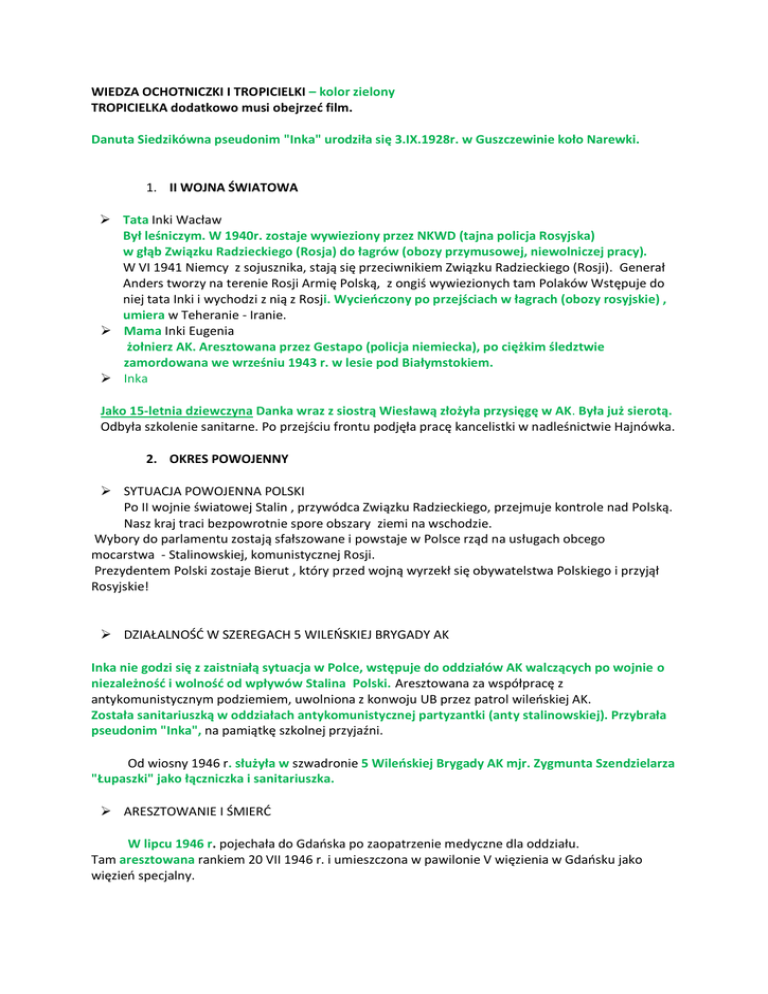 WIEDZA OCHOTNICZKI I TROPICIELKI – kolor zielony TROPICIELKA dodatkowo musi obejrzeć film. Danuta Siedzikówna pseudonim "Inka" urodziła się 3.IX.1928r. w Guszczewinie koło Narewki. 1. II WOJNA ŚWIATOWA Tata Inki Wacław Był leśniczym. W 1940r. zostaje wywieziony przez NKWD (tajna policja Rosyjska) w głąb Związku Radzieckiego (Rosja) do łagrów (obozy przymusowej, niewolniczej pracy). W VI 1941 Niemcy z sojusznika, stają się przeciwnikiem Związku Radzieckiego (Rosji). Generał Anders tworzy na terenie Rosji Armię Polską, z ongiś wywiezionych tam Polaków Wstępuje do niej tata Inki i wychodzi z nią z Rosji. Wycieńczony po przejściach w łagrach (obozy rosyjskie) , umiera w Teheranie - Iranie. Mama Inki Eugenia żołnierz AK. Aresztowana przez Gestapo (policja niemiecka), po ciężkim śledztwie zamordowana we wrześniu 1943 r. w lesie pod Białymstokiem. Inka Jako 15-letnia dziewczyna Danka wraz z siostrą Wiesławą złożyła przysięgę w AK. Była już sierotą. Odbyła szkolenie sanitarne. Po przejściu frontu podjęła pracę kancelistki w nadleśnictwie Hajnówka. 2. OKRES POWOJENNY SYTUACJA POWOJENNA POLSKI Po II wojnie światowej Stalin , przywódca Związku Radzieckiego, przejmuje kontrole nad Polską. Nasz kraj traci bezpowrotnie spore obszary ziemi na wschodzie. Wybory do parlamentu zostają sfałszowane i powstaje w Polsce rząd na usługach obcego mocarstwa - Stalinowskiej, komunistycznej Rosji. Prezydentem Polski zostaje Bierut , który przed wojną wyrzekł się obywatelstwa Polskiego i przyjął Rosyjskie! DZIAŁALNOŚĆ W SZEREGACH 5 WILEŃSKIEJ BRYGADY AK Inka nie godzi się z zaistniałą sytuacja w Polce, wstępuje do oddziałów AK walczących po wojnie o niezależność i wolność od wpływów Stalina Polski. Aresztowana za współpracę z antykomunistycznym podziemiem, uwolniona z konwoju UB przez patrol wileńskiej AK. Została sanitariuszką w oddziałach antykomunistycznej partyzantki (anty stalinowskiej). Przybrała pseudonim "Inka", na pamiątkę szkolnej przyjaźni. Od wiosny 1946 r. służyła w szwadronie 5 Wileńskiej Brygady AK mjr. Zygmunta Szendzielarza "Łupaszki" jako łączniczka i sanitariuszka. ARESZTOWANIE I ŚMIERĆ W lipcu 1946 r. pojechała do Gdańska po zaopatrzenie medyczne dla oddziału. Tam aresztowana rankiem 20 VII 1946 r. i umieszczona w pawilonie V więzienia w Gdańsku jako więzień specjalny. Po ciężkim śledztwie 3 VIII 1946 r. skazana na śmierć przez Wojskowy Sąd Rejonowy w Gdańsku. Wyrok śmierci na młodszą sanitariuszkę był komunistyczną zbrodnią sądową. Mimo torturowania nie wydała swoich kolegów z AK. "Inka" nie uległa namowom obrońcy z urzędu i nie podpisała się pod pismem Bieruta, "prezydenta" z sowieckiego nadania, o ułaskawienie. Pismo podpisał obrońca. Bierut nie skorzystał z prawa łaski. W przesłanym grypsie z więzienia "Inka" napisała "Powiedzcie mojej babci, że zachowałam się jak trzeba". Została rozstrzelana 28 sierpnia 1946 r. o 6.15 strzałem w głowę przez dowódcę plutonu egzekucyjnego, ponieważ żołnierze z plutonu nie chcieli jej zabić. Za 2 dni miała ukończyć 18 lat…. Do „Inki” strzelało 10 żołnierzy, każdy miał 10 sztuk amunicji w bębnie pepeszy. Wobec niepowodzenia egzekucji, choć wystrzelono 100 kul z odległości kilku kroków, do słaniającej się dziewczyny podszedł oficer UB i z bliska strzelił jej w głowę. Przed śmiercią „Inka” zdążyła jeszcze krzyknąć: „Niech żyje Polska! Niech żyje „Łupaszko”! W październiku 2014 r "kat polskich patriotów" Wacław Krzyżanowski, oskarżyciel posiłkowy w procesie 17-letniej sanitariuszki "Inki", został pochowany z honorami wojskowymi. Jak mogło dojść do takiego skandalu… Po wielu miesiącach poszukiwań badacze z instytutu są już pewni, że jeden ze szkieletów znalezionych na Cmentarzu Garnizonowym w Gdańsku, to szczątki ciała 17-letniej Danuty Siedzikówny "Inki". Potwierdzają to badania genetyczne przeprowadzone przez badaczy. · · · · · II Wojna Światowa - największy konflikt zbrojny w historii świata, trwający od 1 września 1939 do 2 września 1945 roku AK – Armia Krajowa – armia utworzona w okupowanej Polsce , mająca rząd w Londynie. Działała podczas II Wojny Światowej w sposób tajny (konspiracja) UB – urząd bezpieczeństwa –zwalczał tych wszystkich którzy nie pogodzili się z nową okupacją Polski (po okupacji niemieckiej, przyszła po II Wojnie Światowej okupacja Rosyjska) Stalin – Przywódca Związku Radzieckiego (Rosji), jeden z największych zbrodniarzy XX wieku, narzucił po II Wojnie światowej Polsce swój rząd. Związek radziecki – komunistyczna Rosja