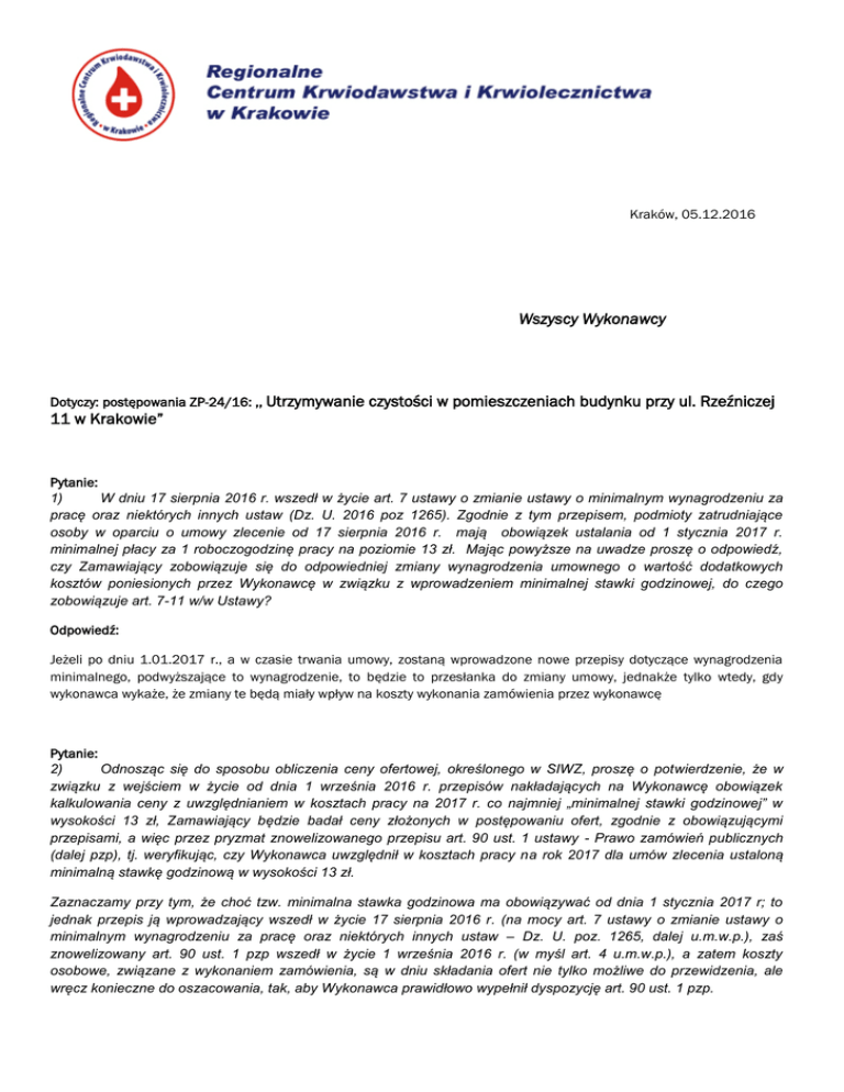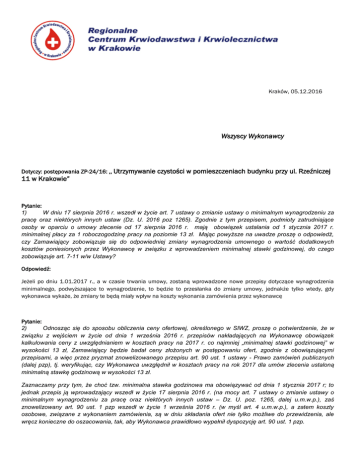 Kraków, 05.12.2016 Wszyscy Wykonawcy Dotyczy: postępowania ZP-24/16: ,, Utrzymywanie czystości w pomieszczeniach budynku przy ul. Rzeźniczej 11 w Krakowie” Pytanie: 1) W dniu 17 sierpnia 2016 r. wszedł w życie art. 7 ustawy o zmianie ustawy o minimalnym wynagrodzeniu za pracę oraz niektórych innych ustaw (Dz. U. 2016 poz 1265). Zgodnie z tym przepisem, podmioty zatrudniające osoby w oparciu o umowy zlecenie od 17 sierpnia 2016 r. mają obowiązek ustalania od 1 stycznia 2017 r. minimalnej płacy za 1 roboczogodzinę pracy na poziomie 13 zł. Mając powyższe na uwadze proszę o odpowiedź, czy Zamawiający zobowiązuje się do odpowiedniej zmiany wynagrodzenia umownego o wartość dodatkowych kosztów poniesionych przez Wykonawcę w związku z wprowadzeniem minimalnej stawki godzinowej, do czego zobowiązuje art. 7-11 w/w Ustawy? Odpowiedź: Jeżeli po dniu 1.01.2017 r., a w czasie trwania umowy, zostaną wprowadzone nowe przepisy dotyczące wynagrodzenia minimalnego, podwyższające to wynagrodzenie, to będzie to przesłanka do zmiany umowy, jednakże tylko wtedy, gdy wykonawca wykaże, że zmiany te będą miały wpływ na koszty wykonania zamówienia przez wykonawcę Pytanie: 2) Odnosząc się do sposobu obliczenia ceny ofertowej, określonego w SIWZ, proszę o potwierdzenie, że w związku z wejściem w życie od dnia 1 września 2016 r. przepisów nakładających na Wykonawcę obowiązek kalkulowania ceny z uwzględnianiem w kosztach pracy na 2017 r. co najmniej „minimalnej stawki godzinowej” w wysokości 13 zł, Zamawiający będzie badał ceny złożonych w postępowaniu ofert, zgodnie z obowiązującymi przepisami, a więc przez pryzmat znowelizowanego przepisu art. 90 ust. 1 ustawy - Prawo zamówień publicznych (dalej pzp), tj. weryfikując, czy Wykonawca uwzględnił w kosztach pracy na rok 2017 dla umów zlecenia ustaloną minimalną stawkę godzinową w wysokości 13 zł. Zaznaczamy przy tym, że choć tzw. minimalna stawka godzinowa ma obowiązywać od dnia 1 stycznia 2017 r; to jednak przepis ją wprowadzający wszedł w życie 17 sierpnia 2016 r. (na mocy art. 7 ustawy o zmianie ustawy o minimalnym wynagrodzeniu za pracę oraz niektórych innych ustaw – Dz. U. poz. 1265, dalej u.m.w.p.), zaś znowelizowany art. 90 ust. 1 pzp wszedł w życie 1 września 2016 r. (w myśl art. 4 u.m.w.p.), a zatem koszty osobowe, związane z wykonaniem zamówienia, są w dniu składania ofert nie tylko możliwe do przewidzenia, ale wręcz konieczne do oszacowania, tak, aby Wykonawca prawidłowo wypełnił dyspozycję art. 90 ust. 1 pzp. Odpowiedź: Badanie, czy Wykonawca przestrzega minimalnych stawek, odbywać się będzie tylko wtedy, gdy powstaną w ogóle przesłanki do badania kwestii rażąco niskiej ceny zdefiniowane w art. 90 ust. 1 PZP (tj. gdy powstaną wątpliwości zamawiającego co do możliwości wykonania przedmiotu zamówienia zgodnie z wymaganiami określonymi przez zamawiającego lub wynikającymi z odrębnych przepisów, albo gdy wątpliwości takie, zgodnie z art. 90 ust. 1a PZP, będą musiały powstać). Jeżeli ogólne przesłanki uruchomienia procedury wyjaśnienia rażąco niskiej ceny nie zostaną spełnione (tj. Zamawiający nie będzie miał wątpliwości, o których mowa w przepisach), to wówczas procedura ta nie zostanie uruchomiona, a kwestia przestrzegania przez Wykonawcę przepisów o minimalnym wynagrodzeniu nie zostanie zbadana Pytanie: 3) Czy w związku z ogłoszeniem wysokości minimalnego wynagrodzenia za pracę na 2017 r. (Rozporządzenie Rady Ministrów z dnia 9 września 2016 r. - Dz. U. z 2016 r. poz. 1456) oraz wysokości minimalnej stawki godzinowej (Obwieszczenie Prezesa Rady Ministrów z dnia 21 września 2016 r. sprawie wysokości minimalnej stawki godzinowej w 2017 r. – M.P. nr 934) Wykonawca winien w cenie swej oferty skalkulować koszty pracy na 2017r. w znanej na dzień składania ofert wysokości, tj. min. 2000 zł na umowę o pracę oraz min. 13 zł za 1 roboczogodzinę pracy na umowę - zlecenie, czy też Zamawiający nie stawia takiego wymagania i po zawarciu umowy, na wniosek Wykonawcy, dokona odpowiedniej waloryzacji wynagrodzenia umownego o wartość dodatkowych kosztów poniesionych przez Wykonawcę w związku ze zmianą wysokości minimalnego wynagrodzenia za pracę oraz wprowadzeniem minimalnej stawki godzinowej? Odpowiedź: Wykonawca ma skalkulować ofertę na odpowiednim poziomie aby zapewnić mu zadowalający zysk przy realizacji minimum stawianego w opisie przedmiotu zamówienia przez Zamawiajacego. Zamawiający nie stawia tu żadnych wymagań, oprócz ogólnego wymogu przestrzegania przez Wykonawców przepisów prawa. Dopiero jeśli okaże się, ze istnieje przesłanka wezwania Wykonawcy do przedstawienia kalkulacji złożonej oferty (udzielenia wyjaśnień w trybie art. 90), to wykonawca będzie musiał przedstawić taką kalkulację, z której wynikać będzie zachowanie przez Wykonawcę przepisów o minimalnym wynagrodzeniu za pracę. Jeśli natomiast zajdzie przesłanka zmiany umowy z powodu zmiany wynagrodzenia minimalnego, to zmiana taka zostanie dokonana w trybie art. 142 ust. 5 pkt. 2 pzp, jeżeli spełnią się przewidziane tym przepisem przesłanki. Pytanie: Dotyczy zapisów SIWZ – paragraf 6 ust. 1 d) wzoru umowy. Proszę o aktualizację w/w zapisów ponieważ nie uwzględniają one zmiany przepisów ustawy prawo zamówień publicznych od 1 września 2016r., zgodnie z którą przepis art. 142 ust. 5 pkt. 2 ustawy prawo zamówień publicznych otrzymał następujące brzmienie: „wysokości minimalnego wynagrodzenia za pracę albo wysokości minimalnej stawki godzinowej, ustalonych na podstawie przepisów ustawy z dnia 10 października 2002 r. o minimalnym wynagrodzeniu za pracę; Odpowiedź: Zamawiający wprowadzi wymagana aktualizacje do umowy Pytanie: Terminy wejścia w życie i wielkość zmian wprowadzonych w art. 142 ust 5 ustawy PZP w całości są niezależne od woli stron umowy o zam