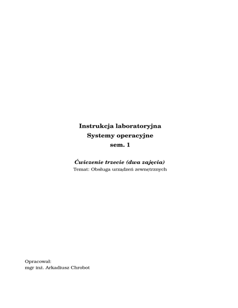 Instrukcja laboratoryjna Systemy operacyjne sem. 1 Ćwiczenie trzecie (dwa zajęcia) Temat: Obsługa urządzeń zewnętrznych Opracował: mgr inż. Arkadiusz Chrobot 1. Wstęp Programista tworzący aplikacje działające pod kontrolą dowolnego systemu operacyjnego (o ile nie jest to bardzo prymitywny system) nie musi znać szczegółów związanych z obsługą sprzętu, na którym jego program będzie uruchamiany. Wystarczy, że będzie umiał skorzystać z funkcji systemowych, które realizują to zadanie. Dzięki temu kod jego programów staje się bardziej przenośny, a praca systemu komputerowego, na którym wykonywane są te programy, bardziej stabilna. W innej sytuacji znajduje się informatyk tworzący oprogramowanie systemowe. Jego zadaniem jest stworzenie najbardziej uniwersalnych i odpornych na błędy procedur obsługi urządzeń. Zadanie to komplikuje się, jeśli system ma współpracować ze sprzętem tego samego rodzaju, ale pochodzącym od wielu różnych producentów i nieposiadającym standardowego sposobu obsługi. W takim wypadku programista systemowy może stworzyć abstrakcyjną warstwę1 z dokładnie zdefiniowanym interfejsem, której przeznaczeniem jest obsługa urządzeń wejścia – wyjścia. Producent urządzenia, który zna specyfikację takiego interfejsu może dostarczyć własne podprogramy obsługi swojego urządzenia (sterowniki). Jedną z większych zalet systemu DOS, a zarazem jedną z największych jego wad jest możliwość bezpośredniej obsługi sprzętu przez programy użytkownika. Tę własność można wykorzystać do poznania zasad obsługiwania niektórych z tych urządzeń. 2. Pamięć ekranu Pamięć karty graficznej (lub jej fragment) jest odwzorowany we fragmencie pamięci RAM komputera. Oznacza to, że zapisanie jakiejkolwiek wartości do tego obszaru RAM spowoduje również zapis tych wartości do pamięci karty graficznej. W przypadku trybu tekstowego dla większości kart graficznych obszar ten zaczyna się od adresu B800:0000h, natomiast jego wielkość zależna jest od trybu tekstowego, w jakim w danej chwili karta pracuje. Opis jednego znaku, który jest wyświetlany na ekranie zajmuje w tej pamięci dwa bajty: pierwszy jest kodem ASCII wyświetlanego znaku, natomiast drugi jest wartością atrybutu tego znaku. W przypadku trybu graficznego zarówno początek bufora w pamięci, jak i jego wielkość oraz organizacja wewnętrzna zależą od rodzaju karty. 1 Przykładem takiej warstwy jest wirtualny system plików występujący w niektórych systemach uniksowych. 2 3. Bufor klawiatury W pamięci RAM znajduje się również obszar, gdzie zapamiętywane są dane przesyłane przez sterownik klawiatury. Obszar ten ma wielkość 32 bajtów i zaczyna się od adresu 0040:001Eh. Jest on zorganizowany w postaci struktury cyklicznej, dlatego skojarzone są z nim dwie zmienne dwu bajtowe o adresach 0040:001Ah i 0040:001Ch oznaczające odpowiednio początek cyklicznego bufora klawiatury (wskazuje pierwszy znak do odebrania) i koniec cyklicznego bufora klawiatury (wskazuje pierwsze wolne miejsce na nadchodzący znak). Za każdym razem, kiedy użytkownik naciśnie klawisz do tego bufora wpisywane są dwa bajty: kod klawisza i kod ASCII. 4. Mysz Mysz w systemie MS-DOS jest obsługiwana za pomocą przerwania 33h. Procedura obsługi tego przerwania dostarczana jest jako sterownik myszy przez jej producenta. Jeśli dostawca myszy nie zaopatrzył jej w sterownik, stosowana jest domyślna procedura obsługi będąca częścią systemu MS-DOS. Zapewnia ona między innymi takie funkcje, jak: inicjalizacja myszy, wyświetlenie/ukrycie kursora, odczytanie stanu przycisków i położenia myszy, odczytanie informacji o naciśnięciu przycisków myszy. Więcej informacji na temat obsługi urządzeń wejścia-wyjścia można znaleźć w rozdziałach 14 i 15 książki „DOS 5 od środka” oraz w rozdziale 14 książki „Anatomia PC”. 5. Zadania Podczas pierwszych zajęć należy przynajmniej zrealizować drugie zadanie. Na drugich zajęciach pozostałe. 1. [1 punkty] Napisz program, który odwołując się bezpośrednio do pamięci karty graficznej w trybie tekstowym zaprezentuje na ekranie monitora prostą animację (np. przesuwający się kolorowy prostokąt). 2. [2 punkty] Napisz program, który będzie wypisywał na ekran, na bieżąco zawartość bufora klawiatury i stan jego wskaźników. 3. [1 punkty] Napisz program, który będzie pokazywał kursor myszy oraz podawał na bieżąco informacje o jego współrzędnych oraz o stanie przycisków myszy. 3