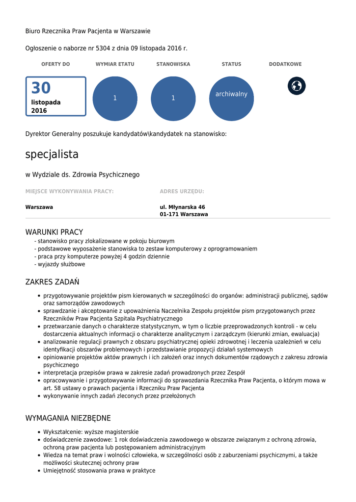 Biuro Rzecznika Praw Pacjenta w Warszawie Ogłoszenie o naborze nr 5304 z dnia 09 listopada 2016 r. OFERTY DO WYMIAR ETATU STANOWISKA 1 1 30 listopada 2016 STATUS DODATKOWE archiwalny Dyrektor Generalny poszukuje kandydatów\kandydatek na stanowisko: specjalista w Wydziale ds. Zdrowia Psychicznego MIEJSCE WYKONYWANIA PRACY: ADRES URZĘDU: Warszawa ul. Młynarska 46 01-171 Warszawa WARUNKI PRACY - stanowisko pracy zlokalizowane w pokoju biurowym - podstawowe wyposażenie stanowiska to zestaw komputerowy z oprogramowaniem - praca przy komputerze powyżej 4 godzin dziennie - wyjazdy służbowe ZAKRES ZADAŃ przygotowywanie projektów pism kierowanych w szczególności do organów: administracji publicznej, sądów oraz samorządów zawodowych sprawdzanie i akceptowanie z upoważnienia Naczelnika Zespołu projektów pism przygotowanych przez Rzeczników Praw Pacjenta Szpitala Psychiatrycznego przetwarzanie danych o charakterze statystycznym, w tym o liczbie przeprowadzonych kontroli - w celu dostarczenia aktualnych informacji o charakterze analitycznym i zarządczym (kierunki zmian, ewaluacja) analizowanie regulacji prawnych z obszaru psychiatrycznej opieki zdrowotnej i leczenia uzależnień w celu identyfikacji obszarów problemowych i przedstawianie propozycji działań systemowych opiniowanie projektów aktów prawnych i ich założeń oraz innych dokumentów rządowych z zakresu zdrowia psychicznego interpretacja przepisów prawa w zakresie zadań prowadzonych przez Zespół opracowywanie i przygotowywanie informacji do sprawozdania Rzecznika Praw Pacjenta, o którym mowa w art. 58 ustawy o prawach pacjenta i Rzeczniku Praw Pacjenta wykonywanie innych zadań zleconych przez przełożonych WYMAGANIA NIEZBĘDNE Wykształcenie: wyższe magisterskie doświadczenie zawodowe: 1 rok doświadczenia zawodowego w obszarze związanym z ochroną zdrowia, ochroną praw pacjenta lub postępowaniem administracyjnym Wiedza na temat praw i wolności człowieka, w szczególności osób z zaburzeniami psychicznymi, a także możliwości skutecznej ochrony praw Umiejętność stosowania prawa w praktyce Znajomość Konstytucji RP Znajomość ustawy o prawach pacjenta i Rzeczniku Praw Pacjenta oraz aktów wykonawczych Znajomość ustawy o ochronie zdrowia psychicznego oraz aktów wykonawczych Znajomość ustawy o służbie cywilnej Znajomość Kodeksu karnego, Kodeksu karnego wykonawczego, Kodeksu cywilnego, Kodeksu postępowania cywilnego, Kodeksu rodzinnego i opiekuńczego Znajomość rozporządzenia w sprawie wykazu zakładów psychiatrycznych i zakładów leczenia odwykowego przeznaczonych do wykonywania środków zabezpieczających oraz składu, trybu powołania i zadań komisji psychiatrycznej do spraw środków zabezpieczających Znajomość podstaw ustrojowych funkcjonowania państwa, w tym przepisów określających kompetencje organów administracji rządowej i samorządowej Bardzo dobra organizacja pracy własnej, terminowość oraz odporność na stres Posiadanie obywatelstwa polskiego albo obywatelstwa innego państwa Unii Europejskiej albo obywatelstwa innego państwa, którego obywatele na podstawie umów międzynarodowych lub przepisów prawa wspólnotowego posiadają prawo podjęcia zatrudnienia na terytorium Rzeczypospolitej Polskiej Korzystanie z pełni praw publicznych Nieskazanie prawomocnym wyrokiem za umyślne przestępstwo lub umyślne przestępstwo skarbowe WYMAGANIA DODATKOWE preferowane wykształcenie prawnicze, administracyjne, psychologiczne, socjologiczne lub medyczne DOKUMENTY I OŚWIADCZENIA NIEZBĘDNE Życiorys/CV i list motywacyjny Kopie dokumentów potwierdzających spełnienie wymagania niezbędnego w zakresie wykształcenia Kopie dokumentów potwierdzających spełnienie wymagania niezbędnego w zakresie doświadczenia zawodowego / stażu pracy Oświadczenie o posiadanym obywatelstwie albo kopia dokumentu potwierdzającego posiadane obywatelstwo W przypadku osób nieposiadających obywatelstwa polskiego - kopia dokumentu potwierdzającego znajomość języka polskiego zgodnie z rozporządzeniem Prezesa Rady Ministrów w sprawie określenia rodzajów dokumentów potwierdzających znajomość języka polskiego przez osoby nieposiadające obywatelstwa polskiego, ubiegające się o zatrudnienie w służbie cywilnej Oświadczenie o wyrażeniu zgody na przetwarzanie danych osobowych do celów naboru Oświadczenie o korzystaniu z pełni praw publicznych Oświadczenie o nieskazaniu prawomocnym wyrokiem za umyślne przestępstwo lub umyślne przestępstwo skarbowe DOKUMENTY I OŚWIADCZENIA DODATKOWE Kopie dokumentów potwierdzających spełnienie wymagania dodatkowego w zakresie wykształcenia TERMINY I MIEJSCE SKŁADANIA DOKUMENTÓW Dokumenty należy złożyć do: 30 listopada 2016 r. Decyduje data: stempla pocztowego / osobistego dostarczenia oferty do urzędu Miejsce składania dokumentów: Biuro Rzecznika Praw Pacjenta ul. Młynarska 46 01-171 Warszawa w zamkniętej kopercie koniecznie z dopiskiem: „Nabór nr 43/2016 WZP" INNE INFORMACJE: W miesiącu poprzedzającym datę upublicznienia ogłoszenia wskaźnik zatrudnienia osób niepełnosprawnych w urzędzie, w rozumieniu przepisów o rehabilitacji zawodowej i społecznej oraz zatrudnianiu osób niepełnosprawnych, wynosi co najmniej 6%. Proponowane wynagrodzenie zasadnicze : 3100,00 zł brutto. W ofercie należy podać dane kontaktowe - adres do korespondencji, adres e-mail, numer telefonu. Za ofertę złożoną w terminie uznaje się ofertę nadaną w terminie określonym w ogłoszeniu o naborze (liczy się data nadania). Oferty otrzymane po terminie nie będą rozpatrywane. Bliższe informacje można uzyskać pod nr tel. (0-22) 532-82-57, a także na stronie internetowej: www.bpp.gov.pl w zakładce: ”praca”. Do składania dokumentów zapraszamy również osoby niepełnosprawne. Nasz urząd jest pracodawcą równych szans i wszystkie aplikacje są rozważane z równą uwagą bez względu na płeć, wiek, niepełnosprawn