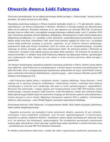 Otwarcie dworca Łódź Fabryczna Tytuł nieco prowokacyjny, bo na odjazd pierwszego składu pociągu z „Fabrycznego” musimy jeszcze poczekać, ale dzień ten jest już coraz bliżej. Największa inwestycja kolejowa w Polsce (wartość kontraktu brutto to: 1,75 mld złotych) i jedna z największych ( po dworcu kolejowym w Wiedniu i Berlinie) w Europie pomału ale zdecydowanie zbliża się ku końcowi. Wszystko wskazuje na to, jak zapewnia nas rzecznik PKP PLK, że pierwsze pociągi ruszą na szlak wraz z początkiem nowego-zimowego rozkładu jazdy, czyli 11 grudnia 2016 roku. Inwestycja pomiędzy ulicami Składową, Kilińskiego i Nowotargową w Łodzi, której zakończenie kilkakrotnie przedłużano ( co wynikało z wielu złożonych i niespodziewanych przeszkód), nareszcie będzie miała swój finał. Dziennikarz TwK, który teren budowy oglądał już trzeci raz, i za każdym razem mógł podziwiać postępy w pracach, zapewnia, że po otwarciu dworca kolejowego, pasażerowie będą pod dużym wrażeniem. Jeśli nie stanie się nic niespodziewanego, wszystko wskazuje na koniec sierpnia, jako datę zakończenia robót. Na pierwszą podróż z Koluszek na „Fabryczny” przyjdzie nam jednak jeszcze poczekać kilka miesięcy. Od września do grudnia po nowym torowisku i w obrębie stacji Łódź Fabryczna odbywać się będą jazdy testowe, sprawdzające stan wykonanych robót. Dopiero po tym czasie w trasę wyruszy pierwszy skład pociągu z pasażerami. -Na bieżąco monitorujemy największą kolejową inwestycję punktową w Polsce. Bardzo ważny będzie etap odbiorów. Łódź Fabryczna to przedsięwzięcie o bardzo dużym znaczeniu komunikacyjnym nie tylko dla Łodzi. Wraz z przygotowywanym podziemnym połączeniem do stacji Łódź Kaliska stworzy nowe możliwości komunikacji dalekobieżnej i aglomeracyjnej – mówi Ireneusz Merchel, prezes PKP Polskich Linii Kolejowych S.A. – Łódź Fabryczna będzie jedną z wizytówek miasta i regionu łódzkiego. Nowy dworzec i tunel wpisują się w ogromny program przebudowy i modernizacji miasta, uwalniają duże obszary inwestycyjne w centrum oraz zwiększają rolę kolei w ruchu aglomeracyjnym i wojewódzkim. Kluczowe dla samorządu i całego regionu jest kontynuowanie przez PKP PLK budowy tunelu średnicowego z nowymi stacjami: Łódź Centrum i Łódź Manufaktura. Dzięki tym zmianom Łódzka Kolej Aglomeracyjna będzie dążyć do stworzenia drugiego po Warszawie systemu kolei podziemnej z trzema stacjami w sercu miasta. Będziemy intensywnie wspierać PLK w szybkim i terminowym odbiorze całej inwestycji – mówi Witold Stępień, marszałek województwa łódzkiego. Nowoczesny dworzec Łódź Fabryczna to trzypoziomowy obiekt, który będzie przyjazny podróżnym, także osobom niepełnosprawnym. – Wygodne poruszanie się pomiędzy trzema poziomami obiektu zapewnią 16 par schodów ruchomych, 4 pary chodników ruchomych oraz 10 wind ogólnodostępnych i 5 technicznych, wszystkie są opisane alfabetem Braille’a. Dodatkowo system płytek prowadzących wskazuje drogi m.in. do peronów, kas biletowych, wejścia/wyjścia. Na krawędziach peronowych zastosowane zostaną płyty wskaźnikowe, które ostrzegą i poinformują osoby niewidome o zmianie kierunku trasy – powiedział nam rzecznik PKP PLK Mirosław Siemieniec. W obiekcie przewidziano także kasy i toalety dla osób o ograniczonej możliwości poruszania się. Ponadto w zakresie urządzeń teletechnicznych przewiduje się budowę dźwiękowego systemu ostrzegawczego (DSO) zlokalizowanego na dworcu i w tunelu. System umożliwia nadawanie niezależnych komunikatów informacyjnych, również w sytuacji zagrożenia pożarem. Zarządca infrastruktury wspólnie z przewoźnikami wypracował docelowy model ruchu pociągów. Według planów dworzec kolejowy Łódź Fabryczna od grudnia obsługiwać będzie ponad 117 pociągów w ciągu doby, w tym: 28 pociągów ŁKA, 41 pociągów PKP Intercity, 48 pociągów Przewozy Regionalne- dowiedzieliśmy się w biurze prasowym Polskich Linii Kolejowych. O komentarz poprosiliśmy także rzecznika budowy dworca Łódź Fabryczna, Katarzynę Rumowską. – Budowa jest w fazie wykończeniowej. Trwają prace przy montażu okładzin ściennych i sufitowych, słupów pomiędzy peronami, a także sufitów podwieszanych. Kończą się prace przy montażu trakcji kolejowej. Wkrótce rozpoczną się zapowiadane próby testowe pociągów. W środku obiektu trwają również prace porządkowe: czyszczenie posadzek, szyb, glazury w pomieszczeniach sanitarnych – powiedziała naszej gazecie Katarzyna Rumowska, rzecznik prasowy Generalnego Wykonawcy, Konsorcjum Torpol- Astaldi- Intercor- PBDiM, budowy dworca Łódź Fabryczna. Na zewnątrz obiektu kończą się roboty przy budowie węzła drogowego Nowotargowa i torowiska w okolicy ulic Składowa /POW. Inwestycje tak wielofunkcyjne, jak Dworzec Łódź Fabryczna, generują nową sieć połączeń komunikacji miejskiej. Przy łódzkim projekcie powstaje siatka połączeń tramwajowo-autobusowych, która umożliwi pasażerom szybki dostęp do obiektu i ułatwi zmianę środka lokomocji. – Trwa budowa infrastruktury w tym zakresie. Jej głównymi elementami są ulice (Nowowęglowa i Nowotargowa z systemem ramp i wiaduktów), a także torowiska tramwajowe. Istotny będzie również węzeł przesiadkowy (przystanek) zlokalizowany na wysokości ul. POW. Powstają tu cztery 65-metrowe perony dla tramwajów i autobusów. Na jednym takim peronie jednocześnie będą mogły zatrzymać się dwa tramwaje, jeden za drugim. Perony będą zadaszone 30metrowymi wiatami. Przystanek, jak cały Dworzec, będzie dostosowany dla osób niepełnosprawnych (znajdą się tu m.in. m.in. znaczniki krawędzi i ścieżki doprowadzające) – powiedziała Katarzyna Rumowska. Dla jak najlepszej obsługi podróżnych przewidziano blisko 1600 m² powierzchni komercyjnej. Klienci kolei znajdą tam m.in.: punkty gastronomiczne i 