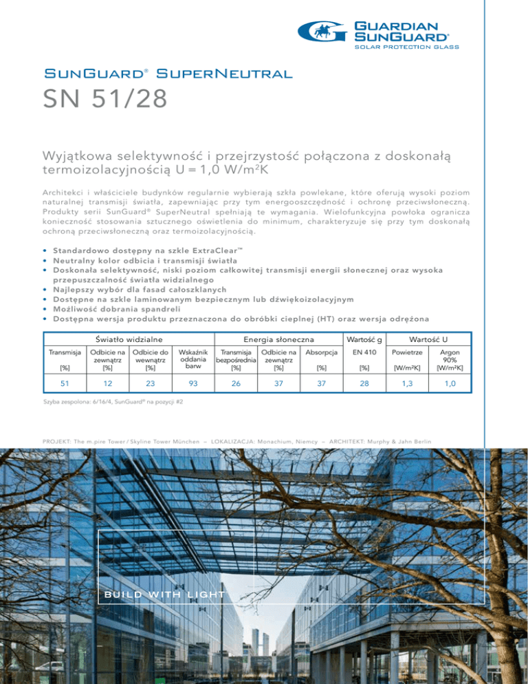 SunGuard SuperNeutral ® SN 51/28 Wyjątkowa selektywność i przejrzystość połączona z doskonałą termoizolacyjnością U = 1,0 W/m 2K Architekci i właściciele budynków regularnie wybierają szkła powlekane, które oferują wysoki poziom naturalnej transmisji światła, zapewniając przy tym energooszczędność i ochronę przeciwsłoneczną. Produkty serii SunGuard ® SuperNeutral spełniają te wymagania. Wielofunkcyjna powłoka ogranicza konieczność stosowania sztucznego oświetlenia do minimum, charakteryzuje się przy tym doskonałą ochroną przeciwsłoneczną oraz termoizolacyjnością. • Standardowo dostępny na szkle ExtraClear ™ • Neutralny kolor odbicia i transmisji światła • D oskonała selektywność, niski poziom całkowitej transmisji energii słonecznej oraz wysoka przepuszczalność światła widzialnego • Najlepszy wybór dla fasad całoszklanych • Dostępne na szkle laminowanym bezpiecznym lub dźwiękoizolacyjnym • Możliwość dobrania spandreli • Dostępna wersja produktu przeznaczona do obróbki cieplnej (HT) oraz wersja odrężona Światło widzialne Transmisja Energia słoneczna [%] Odbicie na zewnątrz [%] Odbicie do wewnątrz [%] Wskaźnik oddania barw 51 12 23 93 Transmisja Odbicie na bezpośrednia zewnątrz [%] [%] 26 37 Wartość g Wartość U Absorpcja EN 410 Powietrze [%] [%] [W/m²K] Argon 90% [W/m²K] 37 28 1,3 1,0 Szyba zespolona: 6/16/4, SunGuard® na pozycji #2 PROJEKT: The m.pire Tower / Skyline Tower München – LOKALIZACJA: Monachium, Niemcy – ARCHITEKT: Murphy & Jahn Berlin Produkty serii SunGuard ® dostępne są w różnych miejscach w Europie za pośrednictwem niezależnej sieci zakładów przetwarzających szkło GUARDIANa. W celu uzyskania dodatkowych informacji, należy skontaktować się z lokalnym przedstawicielem firmy GUARDIAN. GUARDIAN Industries U.K. Ltd. GUARDIAN Luxguard I, S.A. GUARDIAN Glass España, S.L. GUARDIAN Orosháza Kft. United Kingdom Luxembourg Spain Hungary Phone: 0044 (0) 800 032 6322 Phone: 00 352 50301 Phone: 00 34 948 817255 Phone: 0036 (0) 68 887 200 e-Mail: [email protected] e-Mail: sales_bascharage@ e-Mail: [email protected] e-Mail: oroshaza_sales@ guardian.com guardian.com GUARDIAN Thalheim GmbH GUARDIAN Częstochowa Sp. z o.o. GUARDIAN Steklo Ryazan LLC Germany Poland Russia Phone: 0049 (0) 3494 361 800 Phone: 0048 (0) 34 323 9200 Phone: 007 (8) 4912 956600 e-Mail: anwendungstechnik@ e-Mail: tech_poland@ e-Mail: [email protected] guardian.com guardian.com Podane wartości są wartościami nominalnymi podlegającymi tolerancjom produkcyjnym. Podane wartości spektrofotometryczne są zgodne z EN 410; wartości współczynnika przenikania ciepła U są zgodne z EN 673. Sprzedaż produktów przedstawionych w tej publikacji podlega ogólnym warunkom sprzedaży firmy GUARDIAN, jak rownież dodatkowym obowiązującym pisemnym gwarancjom. Nabywca jest odpowiedzialny za potwierdzenie, że produkty są odpowiednie do ich zamierzonego zastosowania. W celu uzyskania wszelkich stosownych instrukcji użytkowania i obsługi, jak rownież aktualnych informacji o produkcie, prosimy o kontakt z Państwa lokalnym przedstawicielem firmy GUARDIAN. www.sunguardglass.pl GUARDIAN Europe Numer referencyjny: 6-16-4 / HS SN 51/28 / PL / 12-11 ©2011 GUARDIAN Industries Corp. Nazwa SunGuard ® jest zastrzeżonym znakiem towarowym należącym do GUARDIAN Industries Corp.