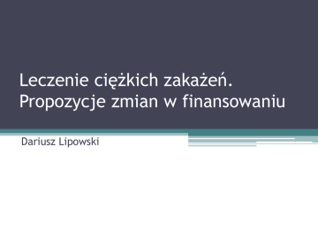 Leczenie ciężkich zakażeń. Propozycje zmian w finansowaniu Dariusz Lipowski Definicja • Ciężkie zakażenie ▫ zakażenie prowadzące do dysfunkcji lub niewydolności jednolub wielonarządowej ▫ zakażenie powodujące znaczące pogorszenie stanu chorego z zaawansowaną chorobą przewlekłą ▫ zakażenie narządu lub ogólnoustrojowe u osób z obniżoną odpornością • Ciężkie zakażenie ▫ jedna z głównych przyczyn zgonów chorych z obniżoną odpornością ▫ może prowadzić do zgonu lub długotrwałej niezdolności do aktywności zawodowej osoby dotychczas zdrowe Leczenie ciężkich zakażeń • Różnice w postępowaniu diagnostycznym i terapeutycznym ▫ wymóg szybkiej i efektywnej diagnostyki ▫ często szeroko spektralne leczenie empiryczne ▫ leczenie wymaga wiedzy dotyczącej funkcji organizmu monitorowanie parametrów życiowych ▫ niezbędna szybka reakcja na obserwowane zaburzenia czynnościowe Leczenie ciężkich zakażeń • w przypadku dysfunkcji lub niewydolności narządowej ▫ leczenie wspomagające lub zastępujące czynność niewydolnego organu ▫ wymagania sprzętowe ▫ dodatkowe umiejętności zespołu terapeutycznego Leczenie ciężkich zakażeń • zwiększone obciążenie czasowe i kadrowe • zwiększone koszty ▫ ▫ ▫ ▫ diagnostyki leczenia zakażenia prowadzenia chorego leczenie niewydolności narządowej • wydłużony czas hospitalizacji Miejsce leczenia chorych Zakażenia leczone w OIT Umieralność 40 – 50% Najliczniejsza grupa chorych z ciężkimi zakażeniami Zakażenia ciężkie Leczenie szpitalne Umieralność < 10% Zakażenia o lekkim przebiegu Leczenie ambulatoryjne lub w oddziale szpitalnym Umieralność < 1% Leczenie ciężkich zakażeń w obecnym systemie realizacji świadczeń zdrowotnych • brak świadczeń dedykowanych chorym w ciężkim stanie ▫ Oddział Intensywnej Opieki Medycznej ▫ Oddział Zintensyfikowanego Nadzoru i Leczenia • w praktyce ▫ świadczenia realizowane w niewystarczającym zakresie ▫ przeniesienie do OIT po załamaniu funkcji życiowych w stanie zagrożenia życia późno, po nieefektywnym postępowaniu terapeutycznym dotyczy nielicznych chorych (brak miejsc w OIT) • obecnie finansowanie świadczenia jest niezależne od ▫ ▫ ▫ ▫ ▫ ciężkości stanu chorego intensywności i liczby zastosowanych procedur inwazyjnego i nieinwazyjnego monitorowania funkcji życiowych realnych kosztów diagnostyki i leczenia czasu hospitalizacji • scedowane na świadczeniodawcę ▫ koszt leczenia pokrywany ze środków uzyskiwanych za hospitalizacje pozostałych pacjentów Finansowanie leczenia ciężkich zakażeń od wprowadzenia JPG • brak zasadniczych zmian w zakresie finansowania świadczeń jako system nowy zawierał w sobie błędy nie rozwiązany problem referencyjności ośrodków • brak działań „naprawczych” ze strony NFZ dotyczących „niejednorodnych” chorych w grupach JPG arbitralnego przyjęcia czasu i odpłatności za hospitalizację długość „okresu finansowanego grupą” stawka za każdy dzień hospitalizacji poza w/w okresem Propozycje zmian finansowania • realizacja w perspektywie krótkoterminowej ▫ wykorzystanie obecnych, używanych przy punktowaniu świadczeń narzędzi ICD-10 ICD-9 ▫ utworzenie dodatkowych grup JPG dla ciężkich zakażeń ▫ skrócenie okresu finansowanego grupą ▫ wyższa/realistyczna w stosunku do aktualnych cen stawka za hospitalizacje dłuższe Propozycje zmian finansowania • zmiany ewolucyjne – realizacja wieloletnia ▫ referencyjność ośrodków ▫ osobny system finansowania oddziałów dla ciężko chorych Przykłady szczegółowych zmian finansowania leczenia ciężkich zakażeń • wyodrębnienie dodatkowych JPG ▫ ciężka posocznica ▫ ciężkie choroby zapalne oun ▫ zapalenie płuc wymagające wspomagania funkcji oddechowych Kwalifikacja chorych do nowych JPG • warunek konieczny kwalifikacji ▫ wykonanie u chorego jednej z wymienionych procedur ICD-9 ▫ wystąpienie powikłań narządowych wg kodów ICD-10 Ciężka posocznica ICD - 10 Lista chorób wg obecnego katalogu (grupa S53) Wymagania dodatkowe ICD -9 00.17 89.602 89.61 89.62 93.96 96.04 Wymagania dodatkowe ICD - 10 D65 D69.5 D70 D73.3 E87.0 E87.1 E87.2 I50 I50.1 J96.0 K72.0 N17.8 R57.8 Liczba dni finansowanych grupą Wartość osobodnia ponad ryczałt Proponowana punktacja 15 8 280 00.17 – wlew amin presyjnych; 81.61 – monitorowanie ciśnienia tętniczego; 89.62 – monitorowanie OCŻ Ciężkie choroby zapalne ośrodkowego układu nerwowego ICD - 10 Lista chorób wg obecnego katalogu (grupa A57) Wymagania dodatkowe ICD -9 00.102 01.02 02.39 02.41 02.43 03.79 03.92 31.1 89.60 89.602 89.61 89.62 96.04 97.37 Wymagania dodatkowe ICD - 10 D65 D69.5 D70 D73.3 I50 I50.1 J96.0 K72.0 N17.8 Liczba dni finansowanych grupą Wartość osobodnia ponad ryczałt Proponowana punktacja 15 8 220 00.102 – dokomorowe podawanie leków; 02.39 – drenaż komorowy; 03.92 – leczenie dokanałowe; 03.79 – drenaż lędźwiowy; 81.61 – monitorowanie ciśnienia tętniczego Zapalenie płuc wymagające wspomagania funkcji oddechowych ICD - 10 Lista chorób wg obecnego katalogu (grupa D18) Wymagania dodatkowe ICD -9 93.90 96.04 31.1 31.29 93.93 93.94 93.95 93.98 Liczba dni finansowanych grupą Wartość osobodnia ponad ryczałt Proponowana punktacja 15 8 180 93.93 – wentylacja nieinwazyjna; 96.04 – intubacja dotchawicza; 31.1 – tracheostomia czasowa; 93.90 – toaleta drzewa oskrzelowego Wnioski • Obecny system finansowania świadczeń nie pokrywa kosztów leczenia ciężkich zakażeń • Konsekwencją niewłaściwego finansowania leczenia ciężkich zakażeń jest niewystarczający zakres realizowanych świadczeń • Możliwa jest poprawa finansowania leczenia ciężkich zakażeń Wnioski • Zmiany w finansowaniu z wykorzystaniem obecnych narzędzi (ICD-9, ICD-10) mogą stać się pierwszym etapem utworzenia systemu ośrodków referencyjnyc