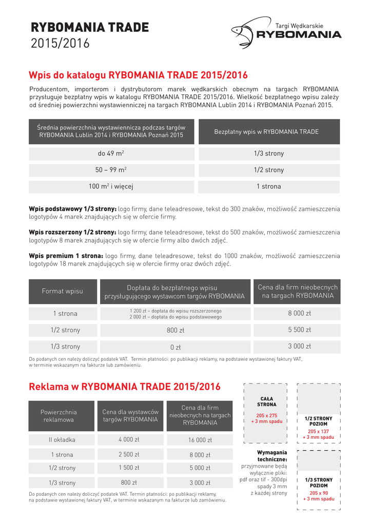 RYBOMANIA TRADE 2015/2016 Wpis do katalogu RYBOMANIA TRADE 2015/2016 Producentom, importerom i dystrybutorom marek wędkarskich obecnym na targach RYBOMANIA przysługuje bezpłatny wpis w katalogu RYBOMANIA TRADE 2015/2016. Wielkość bezpłatnego wpisu zależy od średniej powierzchni wystawienniczej na targach RYBOMANIA Lublin 2014 i RYBOMANIA Poznań 2015. Średnia powierzchnia wystawiennicza podczas targów RYBOMANIA Lublin 2014 i RYBOMANIA Poznań 2015 Bezpłatny wpis w RYBOMANIA TRADE do 49 m2 1/3 strony 50 – 99 m2 1/2 strony 100 m2 i więcej 1 strona Wpis podstawowy 1/3 strony: logo firmy, dane teleadresowe, tekst do 300 znaków, możliwość zamieszczenia logotypów 4 marek znajdujących się w ofercie firmy. Wpis rozszerzony 1/2 strony: logo firmy, dane teleadresowe, tekst do 500 znaków, możliwość zamieszczenia logotypów 8 marek znajdujących się w ofercie firmy albo dwóch zdjęć. Wpis premium 1 strona: logo firmy, dane teleadresowe, tekst do 1000 znaków, możliwość zamieszczenia logotypów 18 marek znajdujących się w ofercie firmy oraz dwóch zdjęć. Format wpisu Dopłata do bezpłatnego wpisu przysługującego wystawcom targów RYBOMANIA Cena dla firm nieobecnych na targach RYBOMANIA 1 strona 1 200 zł – dopłata do wpisu rozszerzonego 2 000 zł – dopłata do wpisu podstawowego 8 000 zł 1/2 strony 800 zł 5 500 zł 1/3 strony 0 zł 3 000 zł Do podanych cen należy doliczyć podatek VAT. Termin płatności: po publikacji reklamy, na podstawie wystawionej faktury VAT, w terminie wskazanym na fakturze lub zamówieniu. Reklama w RYBOMANIA TRADE 2015/2016 Cena dla wystawców targów RYBOMANIA Cena dla firm nieobecnych na targach RYBOMANIA II okładka 4 000 zł 16 000 zł 1 strona 2 500 zł 8 000 zł 1/2 strony 1 500 zł 5 000 zł 1/3 strony 800 zł 3 000 zł Powierzchnia reklamowa Do podanych cen należy doliczyć podatek VAT. Termin płatności: po publikacji reklamy, na podstawie wystawionej faktury VAT, w terminie wskazanym na fakturze lub zamówieniu. CAŁA STRONA 205 x 275 + 3 mm spadu Wymagania techniczne: przyjmowane będą wyłącznie pliki: pdf oraz tif - 300dpi spady 3 mm z każdej strony 1/2 STRONY POZIOM 205 x 137 + 3 mm spadu 1/3 STRONY POZIOM 205 x 90 + 3 mm spadu