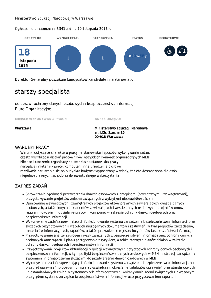 Ministerstwo Edukacji Narodowej w Warszawie Ogłoszenie o naborze nr 5341 z dnia 10 listopada 2016 r. OFERTY DO 18 listopada 2016 WYMIAR ETATU STANOWISKA 1 1 STATUS DODATKOWE archiwalny Dyrektor Generalny poszukuje kandydatów\kandydatek na stanowisko: starszy specjalista do spraw: ochrony danych osobowych i bezpieczeństwa informacji Biuro Organizacyjne MIEJSCE WYKONYWANIA PRACY: ADRES URZĘDU: Warszawa Ministerstwo Edukacji Narodowej al. J.Ch. Szucha 25 00-918 Warszawa WARUNKI PRACY Warunki dotyczące charakteru pracy na stanowisku i sposobu wykonywania zadań: częsta weryfikacja działań pracowników wszystkich komórek organizacyjnych MEN Miejsce i otoczenie organizacyjno-techniczne stanowiska pracy: narzędzia i materiały pracy: komputer i inne urządzenia biurowe możliwość poruszania się po budynku: budynek wyposażony w windy, toaleta dostosowana dla osób niepełnosprawnych, schodołaz do ewentualnego wykorzystania ZAKRES ZADAŃ Sprawdzanie zgodności przetwarzania danych osobowych z przepisami (zewnętrznymi i wewnętrznymi), przygotowywanie projektów zaleceń związanych z wykrytymi nieprawidłowościami Opiniowanie wewnętrznych i zewnętrznych projektów aktów prawnych zawierających kwestie danych osobowych, a także innych dokumentów zawierających kwestie danych osobowych (projektów umów, regulaminów, pism), udzielanie pracownikom porad w zakresie ochrony danych osobowych oraz bezpieczeństwa informacji Wykonywanie zadań zapewniających funkcjonowanie systemu zarządzania bezpieczeństwem informacji oraz służących przygotowywaniu wszelkich niezbędnych dokumentów i zestawień, w tym projektów zarządzenia, materiałów informacyjnych, raportów, a także prowadzenie rejestru incydentów bezpieczeństwa informacji Przygotowywanie analizy zagrożeń i ryzyk związanych z bezpieczeństwem informacji oraz ochroną danych osobowych oraz raportu i planu postępowania z ryzykiem, a także rocznych planów działań w zakresie ochrony danych osobowych i bezpieczeństwa informacji Przygotowywanie projektów aktualizacji regulacji wewnętrznych dotyczących ochrony danych osobowych i bezpieczeństwa informacji, w tym polityki bezpieczeństwa danych osobowych w MEN i instrukcji zarządzania systemami informatycznymi służącymi do przetwarzania danych osobowych w MEN Wykonywanie zadań zapewniających funkcjonowanie systemu zarządzania bezpieczeństwem informacji, np. przegląd uprawnień, procedur, formularzy oświadczeń, określenie katalogów uprawnień oraz standardowych i niestandardowych zmian w systemach teleinformatycznych; wykonywanie zadań związanych z okresowym przeglądem systemu zarządzania bezpieczeństwem informacji wraz z przygotowaniem raportu i monitorowaniem realizacji zaleceń; branie udziału w audytach systemu zarządzania bezpieczeństwem informacji Nadzorowanie administratora bezpieczeństwa informacji w jednostce podległej MEN w zakresie zbiorów danych osobowych jej powierzonych, nadzorowanie realizacji zadań dotyczących bezpieczeństwa przetwarzania danych osobowych wykonywanych przez administratorów systemów informatycznych oraz opiekunów systemów informatycznych służących do przetwarzania danych osobowych; weryfikowanie poprawności procesu udzielania upoważnień do przetwarzania danych osobowych, prowadzenia ewidencji osób upoważnionych do przetwarzania danych osobowych i zgłaszania zbiorów danych osobowych do rejestracji Generalnemu Inspektorowi Ochrony Danych Osobowych; nadzorowanie rejestrowania i wyjaśniania incydentów bezpieczeństwa informacji Zapewnianie zapoznania osób upoważnionych do przetwarzania danych osobowych z przepisami o ochronie danych osobowych; przekazywanie departamentowi właściwemu do spraw kadr informacji o potrzebie organizacji szkoleń z zakresu ochrony danych osobowych i bezpieczeństwa informacji, a w razie potrzeby prowadzenie szkoleń wewnętrznych z zakresu ochrony danych osobowych i bezpieczeństwa informacji WYMAGANIA NIEZBĘDNE Wykształcenie: wyższe staż pracy: 1 rok znajomość przepisów z zakresu ochrony danych osobowych, w tym w odniesieniu do systemów informatycznych służących do przetwarzania danych osobowych, oraz umiejętność ich stosowania w praktyce znajomość przepisów dotyczących systemu zarządzania bezpieczeństwem informacji, oraz umiejętność ich stosowania w praktyce znajomość zasad funkcjonowania administracji publicznej, w tym służby cywilnej i kodeksu postępowania administracyjnego umiejętność planowania i organizacji pracy własnej umiejętność argumentowania umiejętność współpracy samodzielność kreatywność rzetelność i terminowość Posiadanie obywatelstwa polskiego Korzystanie z pełni praw publicznych Nieskazanie prawomocnym wyrokiem za umyślne przestępstwo lub umyślne przestępstwo skarbowe WYMAGANIA DODATKOWE Wykształcenie: wyższe magisterskie lub wykształcenie wyższe prawnicze doświadczenie zawodowe: 1 rok w obszarze związanym z przestrzeganiem zasad ochrony danych osobowych znajomość języka angielskiego na poziomie komunikatywnych (B1) DOKUMENTY I OŚWIADCZENIA NIEZBĘDNE Życiorys/CV i list motywacyjny Kopie dokumentów potwierdzających spełnienie wymagania niezbędnego w zakresie wykształcenia Kopie dokumentów potwierdzających spełnienie wymagania niezbędnego w zakresie doświadczenia zawodowego / stażu pracy Oświadczenie o posiadaniu obywatelstwa polskiego albo kopia dokumentu potwierdzającego posiadanie polskiego obywatelstwa Oświadczenie o wyrażeniu zgody na przetwarzanie danych osobowych do celów naboru Oświadczenie o korzystaniu z pełni praw publicznych Oświadczenie o nieskazaniu prawomocnym wyrokiem za umyślne przestępstwo lub umyślne przestępstwo skarbowe DOKUMENTY I OŚWIADCZENIA DODATKOWE kopia dokumentu potwierdzającego niepełnosprawność - w przypadku kandydatek/kandydatów, zamierzających skorzystać z pierwszeństwa w zatrudnieniu w przypadku, gdy znajdą się w g