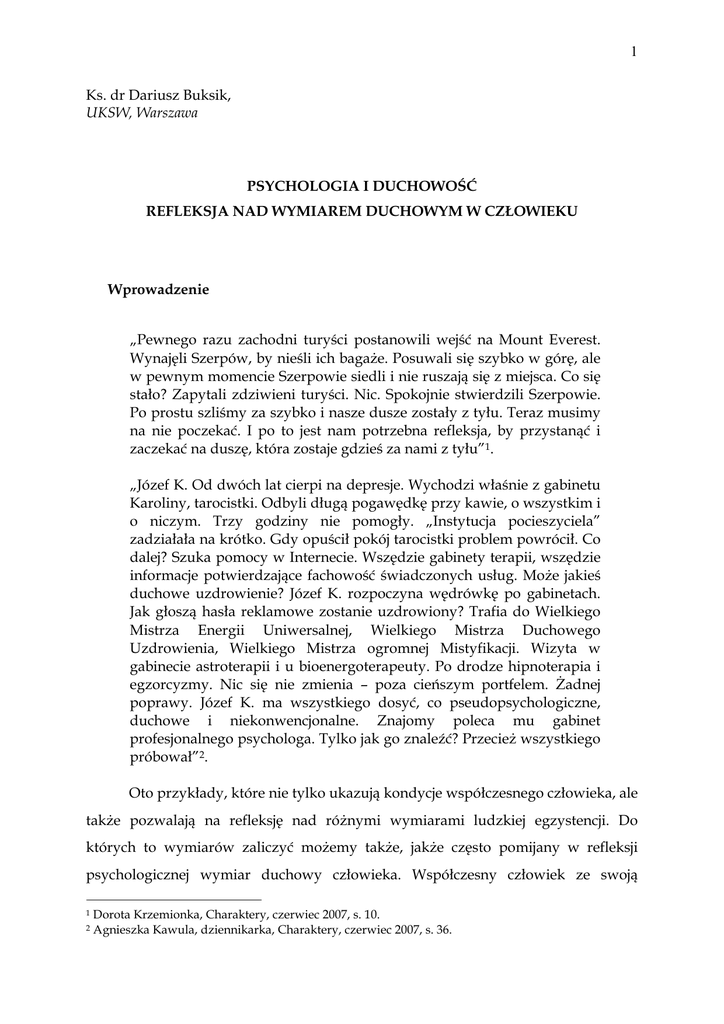 1 Ks. dr Dariusz Buksik, UKSW, Warszawa PSYCHOLOGIA I DUCHOWOŚĆ REFLEKSJA NAD WYMIAREM DUCHOWYM W CZŁOWIEKU Wprowadzenie „Pewnego razu zachodni turyści postanowili wejść na Mount Everest. Wynajęli Szerpów, by nieśli ich bagaŜe. Posuwali się szybko w górę, ale w pewnym momencie Szerpowie siedli i nie ruszają się z miejsca. Co się stało? Zapytali zdziwieni turyści. Nic. Spokojnie stwierdzili Szerpowie. Po prostu szliśmy za szybko i nasze dusze zostały z tyłu. Teraz musimy na nie poczekać. I po to jest nam potrzebna refleksja, by przystanąć i zaczekać na duszę, która zostaje gdzieś za nami z tyłu”1. „Józef K. Od dwóch lat cierpi na depresje. Wychodzi właśnie z gabinetu Karoliny, tarocistki. Odbyli długą pogawędkę przy kawie, o wszystkim i o niczym. Trzy godziny nie pomogły. „Instytucja pocieszyciela” zadziałała na krótko. Gdy opuścił pokój tarocistki problem powrócił. Co dalej? Szuka pomocy w Internecie. Wszędzie gabinety terapii, wszędzie informacje potwierdzające fachowość świadczonych usług. MoŜe jakieś duchowe uzdrowienie? Józef K. rozpoczyna wędrówkę po gabinetach. Jak głoszą hasła reklamowe zostanie uzdrowiony? Trafia do Wielkiego Mistrza Energii Uniwersalnej, Wielkiego Mistrza Duchowego Uzdrowienia, Wielkiego Mistrza ogromnej Mistyfikacji. Wizyta w gabinecie astroterapii i u bioenergoterapeuty. Po drodze hipnoterapia i egzorcyzmy. Nic się nie zmienia – poza cieńszym portfelem. śadnej poprawy. Józef K. ma wszystkiego dosyć, co pseudopsychologiczne, duchowe i niekonwencjonalne. Znajomy poleca mu gabinet profesjonalnego psychologa. Tylko jak go znaleźć? PrzecieŜ wszystkiego próbował”2. Oto przykłady, które nie tylko ukazują kondycje współczesnego człowieka, ale takŜe pozwalają na refleksję nad róŜnymi wymiarami ludzkiej egzystencji. Do których to wymiarów zaliczyć moŜemy takŜe, jakŜe często pomijany w refleksji psychologicznej wymiar duchowy człowieka. Współczesny człowiek ze swoją 1 2 Dorota Krzemionka, Charaktery, czerwiec 2007, s. 10. Agnieszka Kawula, dziennikarka, Charaktery, czerwiec 2007, s. 36. 2 przewagą intelektualną i techniczną nad minionymi pokoleniami coraz bardziej czuje, Ŝe jest zagroŜony zniknięciem dotychczasowego systemu bezpieczeństwa, wyeliminowaniem najbardziej ludzkich wartości: prawdy, dobra, miłości, wartości moralnych, duchowych czy religijnych. ZagroŜenia te przejawiają się z jednej strony w kryzysie pojęcia prawdy spowodowanej: „dominacją, technologicznego modelu poznania”, zaciskające horyzonty poznawcze człowieka; deformacją informacji..., zwielokrotnioną przez środki masowego przekazu; kształtowaniem często utylitarnych schematów myślenia; brakiem nastawienia na refleksję i kontemplację, oraz nieodpowiedzialnością za słowo mówione i pisane”, z drugiej strony powyŜsze zagroŜenia znajdują swój wyraz w kryzysie systemu wartości, relatywizmie moralnym, religijnym, czy teŜ kryzysie duchowym (Zdybicka, 1993). Pojawiające się w Ŝyciu wielu osób problemy natury lęku, depresji, zagubienia czy pustki egzystencjalnej dotyczą, nie tylko sfery biologicznej czy teŜ społecznego funkcjonowania, ale równieŜ płaszczyzny duchowej człowieka. Płaszczyzny, którą coraz częściej dostrzegają nie tylko psycholodzy teoretycy, ale takŜe psychoterapeuci. Człowiek współczesny coraz częściej stawia sobie pytanie, czy Ŝyć Ŝyciem, które tylko „muska powierzchnię”, czy odwaŜyć się na ryzyko wędrówki „w głąb”? Pozwolić się zamknąć w sfunkcjonalizowanym świecie, czy przyjąć odpowiedzialność za własne wybory? Być, czy się stawać? Istnieć czy egzystować?. Oto dylematy, od których człowiek nigdy się nie wyzwoli i których nikt za niego nie rozwiąŜe. Człowiek musi nie tylko wybierać. (Kierkegaard, 1995). Wybierając odwaŜnie i czasami wbrew powszechnie istniejącym społecznym zasadom funkcjonowania ma szanse dojrzałego rozwoju, tworzenia własnej drogi Ŝyciowej i w jakimś stopniu uniknięcia wielu kryzysów, problemów egzystencjalnych, które jakŜe często znajdują swoje podłoŜe w braku Ŝycia duchowego, religijnego oraz opartego na wartościach i normach. W niniejszym opracowaniu pragnę zwrócić uwagę na wymiar duchowy człowieka, który jest jego częścią i jak kaŜdy inny wymiar moŜe ulec zniekształceniu oraz podlegać ciągłemu rozwojowi, chociaŜ jakŜe często jest niezauwaŜalny „gołym okiem”, tzn. okiem naukowca, który wszystko chce mieć uporządkowane i logicznie 3 wynikajace z przyjętych zaloŜeń. A w takim wypadku sfera ducha, duchowość umyka, rozmywa się, jest nie do uchwycenia. KaŜdy z nas chce być szczęśliwym, osiągnąć jak najpełniejszy rozwój, iść w górę, a nie toczyć się, czy teŜ zamknąć swoje Ŝycie w byle jakości. Skoro „stan szczęśliwości” jest pojęciem dającym się naukowo zdefiniować i ilościowo zmierzyć, jak mówi psychologia pozytywna, to moŜe tak samo jest z „płaszczyzną ducha”. MoŜe warto nie rezygnować we współczesnym Ŝyciu z prób nauczenia człowieka dostrzegania płaszczyzny ducha, tak jak nie rezygnuje się z nauczenia człowieka bycia szczęśliwym. 1. Rozumienie człowieka w psychologii Zwracając uwagę na zagadnienie duchowości człowieka naleŜy powiedzieć przede wszystkim o tym jak się rozumie i interpretuje naturę człowieka. Człowiek jako istota Ŝywa nieustannie znajduje się w drodze do budowania swojej osobowości w sposób dojrzały i odpowiedzialny. Jest istotą rozwijającą się w róŜnych płaszczyznach swojej egzystencji od sfery biologicznej po duchową. Jedni określają to trudem rozwoju, inni walką wewnętrzną, jeszcze inni pokonywaniem samego siebie, własnych kryzysów w celu budowania silnej i trwałej osobowości. Pytając o człowieka pytamy o konkretny podmiot, który się staje jak pisze Frankl (1984) „człowiek nigdy nie jest a ciągle się s