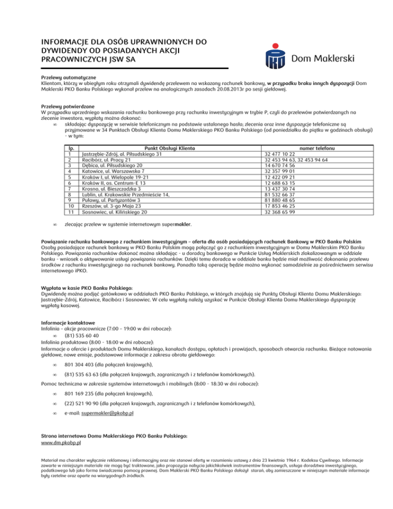 INFORMACJE DLA OSÓB UPRAWNIONYCH DO DYWIDENDY OD POSIADANYCH AKCJI PRACOWNICZYCH JSW SA Przelewy automatyczne Klientom, którzy w ubiegłym roku otrzymali dywidendę przelewem na wskazany rachunek bankowy, w przypadku braku innych dyspozycji Dom Maklerski PKO Banku Polskiego wykonał przelew na analogicznych zasadach 20.08.2013r po sesji giełdowej. Przelewy potwierdzane W przypadku uprzedniego wskazania rachunku bankowego przy rachunku inwestycyjnym w trybie P, czyli do przelewów potwierdzanych na zlecenie inwestora, wypłaty można dokonać: • składając dyspozycję w serwisie telefonicznym na podstawie ustalonego hasła; zlecenia oraz inne dyspozycje telefoniczne są przyjmowane w 34 Punktach Obsługi Klienta Domu Maklerskiego PKO Banku Polskiego (od poniedziałku do piątku w godzinach obsługi) - w tym: lp. 1 2 3 4 5 6 7 8 9 10 11 • Punkt Obsługi Klienta Jastrzębie-Zdrój, al. Piłsudskiego 31 Racibórz, ul. Pracy 21 Dębica, ul. Piłsudskiego 20 Katowice, ul. Warszawska 7 Kraków I, ul. Wielopole 19-21 Kraków II, os. Centrum-E 13 Krosno, ul. Bieszczadzka 3 Lublin, ul. Krakowskie Przedmieście 14, Puławy, ul. Partyzantów 3 Rzeszów, ul. 3-go Maja 23 Sosnowiec, ul. Kilińskiego 20 numer telefonu 32 477 10 22 32 453 94 63, 32 453 94 64 14 670 74 56 32 357 99 01 12 422 09 21 12 688 63 15 13 437 30 74 81 532 66 37 81 880 48 65 17 853 46 25 32 368 65 99 zlecając przelew w systemie internetowym supermakler. Powiązanie rachunku bankowego z rachunkiem inwestycyjnym – oferta dla osób posiadających rachunek Bankowy w PKO Banku Polskim Osoby posiadające rachunek bankowy w PKO Banku Polskim mogą połączyć go z rachunkiem inwestycyjnym w Domu Maklerskim PKO Banku Polskiego. Powiązania rachunków dokonać można składając - u doradcy bankowego w Punkcie Usług Maklerskich zlokalizowanym w oddziale banku - wniosek o aktywowanie usługi powiązania rachunków. Dzięki temu doradca w oddziale banku będzie miał możliwość dokonania przelewu środków z rachunku inwestycyjnego na rachunek bankowy. Ponadto taką operację będzie można wykonać samodzielnie za pośrednictwem serwisu internetowego iPKO. Wypłata w kasie PKO Banku Polskiego: Dywidendę można podjąć gotówkowo w oddziałach PKO Banku Polskiego, w których znajdują się Punkty Obsługi Klienta Domu Maklerskiego: Jastrzębie-Zdrój, Katowice, Racibórz i Sosnowiec. W celu wypłaty należy uzyskać w Punkcie Obsługi Klienta Domu Maklerskiego dyspozycję wypłaty kasowej. Informacje kontaktowe Infolinia – akcje pracownicze (7:00 – 19:00 w dni robocze): • (81) 535 60 40 Infolinia produktowa (8:00 - 18:00 w dni robocze): Informacje o ofercie i produktach Domu Maklerskiego, kanałach dostępu, opłatach i prowizjach, sposobach otwarcia rachunku. Bieżące notowania giełdowe, nowe emisje, podstawowe informacje z zakresu obrotu giełdowego: • 801 304 403 (dla połączeń krajowych), • (81) 535 63 63 (dla połączeń krajowych, zagranicznych i z telefonów komórkowych). Pomoc techniczna w zakresie systemów internetowych i mobilnych (8:00 - 18:30 w dni robocze): • 801 169 235 (dla połączeń krajowych), • (22) 521 90 90 (dla połączeń krajowych, zagranicznych i z telefonów komórkowych), • e-mail: [email protected] Strona internetowa Domu Maklerskiego PKO Banku Polskiego: www.dm.pkobp.pl Materiał ma charakter wyłącznie reklamowy i informacyjny oraz nie stanowi oferty w rozumieniu ustawy z dnia 23 kwietnia 1964 r. Kodeksu Cywilnego. Informacje zawarte w niniejszym materiale nie mogą być traktowane, jako propozycja nabycia jakichkolwiek instrumentów finansowych, usługa doradztwa inwestycyjnego, podatkowego lub jako forma świadczenia pomocy prawnej. Dom Maklerski PKO Banku Polskiego dołożył starań, aby zamieszczone w niniejszym materiale informacje były rzetelne oraz oparte na wiarygodnych źródłach.