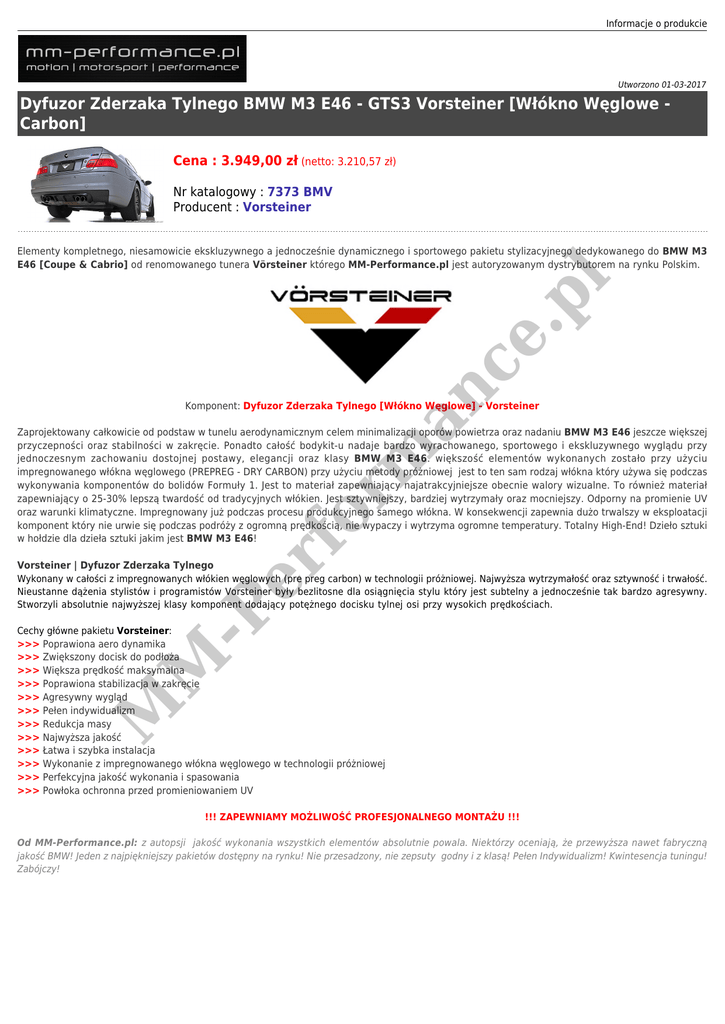 Informacje o produkcie Utworzono 01-03-2017 Dyfuzor Zderzaka Tylnego BMW M3 E46 - GTS3 Vorsteiner [Włókno Węglowe Carbon] Cena : 3.949,00 zł (netto: 3.210,57 zł) Nr katalogowy : 7373 BMV Producent : Vorsteiner an ce .p l Elementy kompletnego, niesamowicie ekskluzywnego a jednocześnie dynamicznego i sportowego pakietu stylizacyjnego dedykowanego do BMW M3 E46 [Coupe & Cabrio] od renomowanego tunera Vörsteiner którego MM-Performance.pl jest autoryzowanym dystrybutorem na rynku Polskim. Komponent: Dyfuzor Zderzaka Tylnego [Włókno Węglowe] - Vorsteiner er fo rm Zaprojektowany całkowicie od podstaw w tunelu aerodynamicznym celem minimalizacji oporów powietrza oraz nadaniu BMW M3 E46 jeszcze większej przyczepności oraz stabilności w zakręcie. Ponadto całość bodykit-u nadaje bardzo wyrachowanego, sportowego i ekskluzywnego wyglądu przy jednoczesnym zachowaniu dostojnej postawy, elegancji oraz klasy BMW M3 E46. większość elementów wykonanych zostało przy użyciu impregnowanego włókna węglowego (PREPREG - DRY CARBON) przy użyciu metody próżniowej jest to ten sam rodzaj włókna który używa się podczas wykonywania komponentów do bolidów Formuły 1. Jest to materiał zapewniający najatrakcyjniejsze obecnie walory wizualne. To również materiał zapewniający o 25-30% lepszą twardość od tradycyjnych włókien. Jest sztywniejszy, bardziej wytrzymały oraz mocniejszy. Odporny na promienie UV oraz warunki klimatyczne. Impregnowany już podczas procesu produkcyjnego samego włókna. W konsekwencji zapewnia dużo trwalszy w eksploatacji komponent który nie urwie się podczas podróży z ogromną prędkością, nie wypaczy i wytrzyma ogromne temperatury. Totalny High-End! Dzieło sztuki w hołdzie dla dzieła sztuki jakim jest BMW M3 E46! -P Vorsteiner | Dyfuzor Zderzaka Tylnego Wykonany w całości z impregnowanych włókien węglowych (pre preg carbon) w technologii próżniowej. Najwyższa wytrzymałość oraz sztywność i trwałość. Nieustanne dążenia stylistów i programistów Vorsteiner były bezlitosne dla osiągnięcia stylu który jest subtelny a jednocześnie tak bardzo agresywny. Stworzyli absolutnie najwyższej klasy komponent dodający potężnego docisku tylnej osi przy wysokich prędkościach. M M Cechy główne pakietu Vorsteiner: >>> Poprawiona aero dynamika >>> Zwiększony docisk do podłoża >>> Większa prędkość maksymalna >>> Poprawiona stabilizacja w zakręcie >>> Agresywny wygląd >>> Pełen indywidualizm >>> Redukcja masy >>> Najwyższa jakość >>> Łatwa i szybka instalacja >>> Wykonanie z impregnowanego włókna węglowego w technologii próżniowej >>> Perfekcyjna jakość wykonania i spasowania >>> Powłoka ochronna przed promieniowaniem UV !!! ZAPEWNIAMY MOŻLIWOŚĆ PROFESJONALNEGO MONTAŻU !!! Od MM-Performance.pl: z autopsji jakość wykonania wszystkich elementów absolutnie powala. Niektórzy oceniają, że przewyższa nawet fabryczną jakość BMW! Jeden z najpiękniejszy pakietów dostępny na rynku! Nie przesadzony, nie zepsuty godny i z klasą! Pełen Indywidualizm! Kwintesencja tuningu! Zabójczy! l ce .p an rm fo er -P M M Prawo autorskie (copyright) - wszelkie tłumaczenia oraz zdjęcia są własnością intelektualną MM-Performance.pl. Wykorzystywanie bez zgody właściciela zabronione!