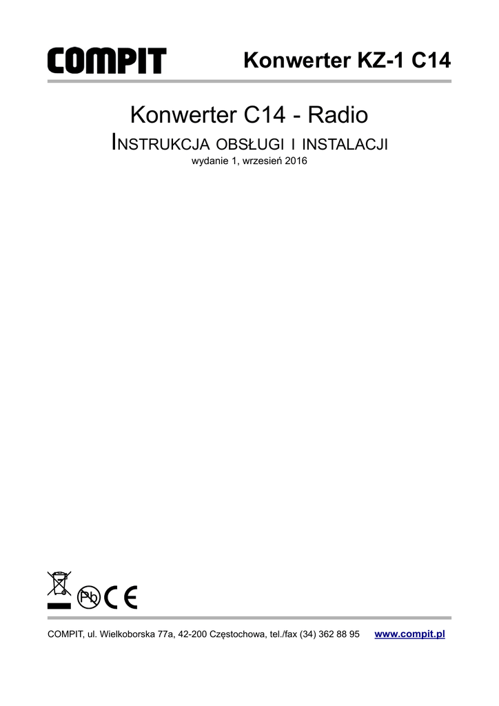 Konwerter KZ-1 C14 Konwerter C14 - Radio INSTRUKCJA OBSŁUGI I INSTALACJI wydanie 1, wrzesień 2016 Pb COMPIT, ul. Wielkoborska 77a, 42-200 Częstochowa, tel./fax (34) 362 88 95 www.compit.pl 1 Zasady bezpieczeństwa Przed zainstalowaniem należy uważnie przeczytać instrukcję obsługi. Nie wolno użytkować niezgodnie z przeznaczeniem. Wszelkich napraw regulatorów może dokonywać wyłącznie serwis producenta. Dokonywanie naprawy przez osobę nieupoważnioną przez firmę COMPIT powoduję utratę gwarancji. 2 Opis konwertera Konwerter KZ-1 C14 umożliwia radiową transmisję pomiędzy urządzeniami posługującymi się protokołem C14. Konwerter umieszczony jest w obudowie z tworzywa sztucznego przeznaczonej do włożenia do gniazda elektrycznego. W dolnej części znajduje się antena. Konwerter dostarcza także zasilania dla urządzeń go pozbawionych np. NANO ONE. Może też zostać wykorzystany w przypadku, gdy regulator, z którym będzie współpracował nie ma możliwości zasilania zewnętrznych urządzeń. 2.1 Dane techniczne Zasilanie: Maksymalny prąd pobierany Temperatura otoczenia: Temperatura składowania: Wilgotność względna: Przyłącza: Wymiary: Waga: AC 230V I = 0,05A 0..55°C 0..55°C 5 – 80% bez kondensacji Zaciski śrubowe 1x0,75mm² 68x118x65mm 0,22 kg 3 Montaż Prace przyłączeniowe i montaż powinny być wykonane wyłącznie przez osoby z odpowiednimi kwalifikacjami i uprawnieniami, zgodnie z obowiązującymi przepisami i normami. 3.1 Wybór właściwej lokalizacji Konwertera nie wolno zabudowywać w metalowych obudowach. Należy wybrać lokalizację zapewniająca niezawodną transmisję. 3.2 Przyłączanie Aby zdemontować tylną ściankę konwertera, należy odkręcić 4 wkręty. Za pomocą przewodu 2 żyłowego należy połączyć zaciski konwertera A-B z odpowiednimi zaciskami regulatora lub modułu pokojowego. Połączyć należy zaciski o takich samych oznaczeniach. Jeżeli moduł pokojowy nie ma własnego zasilania, należy użyć przewodu 4 żyłowego. Konwerter może zasilać tylko jeden panel pomieszczeniowy. 2 Instrukcja Konwerter KZ-1C14, wydanie 1, wrzesień 2016 OBUDOWA ZŁĄCZE DO PODŁĄCZENIA PANELU POKOJOWEGO LUB REGULATORA U G B A ON 1 2 3 4 S1 + + G R WYBÓR KANAŁU KONTROLKI 3.2.1 Schemat podłączenia konwertera do regulatorów BIOMAX 741G, MULTI 740G, R 740G + + G R UG BA S1 1 2 3 4 ON 31 30 29 28 27 26 U G B A 43 42 41 40 39 38 37 36 35 34 33 32 Moduł wykonawczy E9 1 2 3 4 5 6 7 8 9 10 11 12 13 14 15 16 17 18 1920 21 22 23 24 25 Instrukcja Konwerter KZ-1C14, wydanie 1, wrzesień 2016 3 3.2.2 Schemat podłączenia konwertera do regulatorów MULTI 751 G1, R 750 G1 CO CW POD RS485 ZEW U G B A + + G R UG B A S1 1 2 3 4 ON 3.2.3 Schemat podłączenia konwertera do regulatorów R 750 G3, R 740S + + G R UGBA S1 1 2 3 4 U G B A U G B A ZŁĄCZE SERWIS NANO Tkotła TCWU Tpod. Tzewn. 21 22 23 24 25 26 Termostat ON 15 16 17 18 19 20 RS485 R740S STB Wen. Pod. PCWU PCO L N L N L N L N 14 13 12 11 10 9 4 Bezpiecznik F6,3A 250V Sieć 230V~ L N 8 7 6 5 4 3 2 1 Instrukcja Konwerter KZ-1C14, wydanie 1, wrzesień 2016 3.2.4 Schemat podłączenia konwertera do modułu odczytowego NANO ONE. UGBA O N 1 2 3 4 NANO one S1 + + B2 A2 U G R G B1 A1 3.3 Ustawianie kanału Nr kanału 0 Ustawienie przełącznika ON Nr kanału Ustawienie przełącznika 4 1234 1 ON 1 234 5 1234 2 ON ON ON 1 234 6 1234 3 ON ON 1 234 7 1234 ON 1 234 Numer kanałów ustawione w obu współpracujących ze sobą urządzeniach muszą być takie same. Instrukcja Konwerter KZ-1C14, wydanie 1, wrzesień 2016 5 DEKLARACJA ZGODNOŚCI COMPIT ul. Wielkoborska 77 42-280 Częstochowa Deklaruję, że produkt Konwerter C14 radio-RS Stosowany zgodnie z przeznaczeniem i według instrukcji obsługi producenta, spełnia następujące wymagania: 1. Dyrektywy 2004/108/WE (EMC) Parlamentu Europejskiego i Rady z dnia 15 grudnia 2004 r. w sprawie zbliżenia Państw Członkowskich odnoszącej się do kompatybilności elektromagnetycznej oraz uchylającej dyrektywę 89/336/EWG (Dz.Urz. UE L 390 z 31.12.2004, s. 24) (Ustawa z dnia 13 kwietnia 2007 r. o kompatybilności elektromagnetycznej wdrażająca dyrektywę 2004/108/WE) Wykaz norm zharmonizowanych zastosowanych do wykazania zgodności z wymaganiami zasadniczymi wymienionych dyrektyw: PN-EN 60730-2-9:2006, EN 60730-2-9:2002 + A1:2003 + A11:2003 + A12:2004 + A2:2005, w połączeniu z PN-EN 60730-1:2002 + A12:2004 + A13:2005 + A14:2006, EN 60730-1:2000 + A11:2002 + A12:2003 + A13:2004 + A1:2004 + A14:2005 Oznaczenie roku, w którym naniesiono znak CE: 14 Częstochowa, 2014-10-07 6 Piotr Roszak, właściciel Instrukcja Konwerter KZ-1C14, wydanie 1, wrzesień 2016
