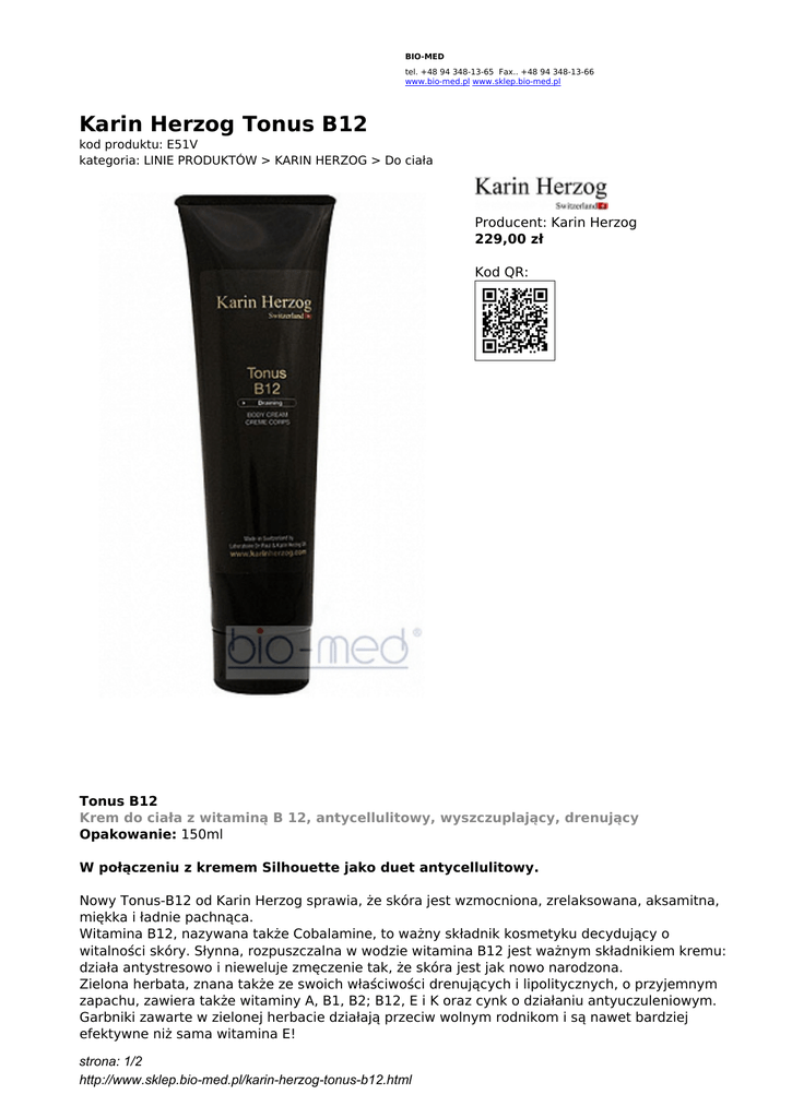 BIO-MED tel. +48 94 348-13-65 Fax.. +48 94 348-13-66 www.bio-med.pl www.sklep.bio-med.pl Karin Herzog Tonus B12 kod produktu: E51V kategoria: LINIE PRODUKTÓW > KARIN HERZOG > Do ciała Producent: Karin Herzog 229,00 zł Kod QR: Tonus B12 Krem do ciała z witaminą B 12, antycellulitowy, wyszczuplający, drenujący Opakowanie: 150ml W połączeniu z kremem Silhouette jako duet antycellulitowy. Nowy Tonus-B12 od Karin Herzog sprawia, że skóra jest wzmocniona, zrelaksowana, aksamitna, miękka i ładnie pachnąca. Witamina B12, nazywana także Cobalamine, to ważny składnik kosmetyku decydujący o witalności skóry. Słynna, rozpuszczalna w wodzie witamina B12 jest ważnym składnikiem kremu: działa antystresowo i nieweluje zmęczenie tak, że skóra jest jak nowo narodzona. Zielona herbata, znana także ze swoich właściwości drenujących i lipolitycznych, o przyjemnym zapachu, zawiera także witaminy A, B1, B2; B12, E i K oraz cynk o działaniu antyuczuleniowym. Garbniki zawarte w zielonej herbacie działają przeciw wolnym rodnikom i są nawet bardziej efektywne niż sama witamina E! strona: 1/2 http://www.sklep.bio-med.pl/karin-herzog-tonus-b12.html Inaczej niż w przypadku kremów Karin Herzog bogatych w tlen, Tonus-B12 to krem, który należy wmasowywać, żeby osiągnąć naturalny efekt drenujący, dopełniający działanie kremu Silhouette i zawartych w nim 4% tlenu. Krem został tak zaprojektowany, by stopniowo, dokładnie wchłaniał się w skórę podczas masażu. Sposób użycia: Wariant 1: rano i/albo wieczorem po prysznicu nałóż krem “Tonus-B12” na całe ciało i masuj, aż całkowicie się wchłonie. Wariant 2: rano i/albo wieczorem nałóż najpierw, bez wmasowywania Silhouette krem z tlenem na te części ciała, które tego potrzebują, a potem użyj kremu “Tonus-B12” i masuj, aż całkowicie się wchłonie. Skład: Aqua;Paraffinum liquidum; Glycerin; Sorbitan palmitate; Polysorbate 20; Alcohol denat. (denaturated: also conforms with ICCP/SASO); Sesamum Indicum Seed Oil; Avocado Oil PEG-1 esters; Jojoba esters; Tocopheryl acetate; Jasminum offcinale; Camellia Sinensis Leaf Powder; Citric acid; Salicylic acid; Cyanocobalamin; Parfum © 2011 Laboratorium Gardner s.c. ************************************************************************************************* ***** DLACZEGO LINIA KOSMETYKÓW KARIN HERZOG JEST TAKA WYJĄTKOWA? Tlen działa antybakteryjnie, usuwa toksyny. Jest antyseptyczy i przeciwzapalny. Kontroluje wytwarzanie sebum i wspomaga wytwarzanie kolagenu, przez co następuje normalizacja skóry i jej rewitalizacja. Wspomaga działanie takich substancji jak: witamina A, H, glukoza, olejek różany, awokado, rumianek, kakao i innych składników wchodzących w skład produktów KH. Tlen jest znakomitym nośnikiem tych substancji. Umożliwia ich wniknięcie w głębiej położone warstwy skóry, ponieważ będąc w postaci płynnej w kremie uwalnia się w kontakcie ze skórą do postaci gazu. Następnie zwiększa swoją objętość ponad 20 razy i wytwarza ciśnienie pozwalające mu wniknąć do skóry właściwej. STOSOWANIE KOSMETYKÓW Z TLENEM KARIN HERZOG Nie powinno się łączyć produktów z tlenem KH z innymi markami kosmetyków. Tlen może spowodować niepożądane reakcje na skórze i wnieść nieznane substancje z innych kosmetyków do głębszych warstw skóry. Jeśli masz np. swoje ulubione mleczko lub tonik zmyj je wodą przed nałożeniem kremu z tlenem. Kosmetyki tlenowe KH zawierają ustabilizowany tlen (Hydrogen Peroxide). Dlatego mają delikatne działanie wybielające. Należy unikać kontaktu z brwiami i rzęsami. Zalecamy nałożenie kremu z tlenem na pędzelek i rozprowadzenie na wybrane części ciała bez wmasowywania w skórę. Ponieważ skóra rąk wchłonie więcej tlenu. Zrobi to szybciej niż np. skóra na twarzy. Efektywne działanie kremu ograniczy się wówczas do skóry dłoni, zamiast działać tam gdzie tego chcemy. Ze względu na tlen, który jest aktywnym czynnikiem, kosmetyki KH można zaliczyć do tzw. grupy kosmeceutyków. Produkty KH nie są testowane na zwierzętach i nie zawierają ekstraktów zwierzęcych. Testy produktów KH zostały przeprowadzone in vitro lub na wolontariuszach. Kosmetyki z tlenem KH nie zawierają konserwantów. strona: 2/2 http://www.sklep.bio-med.pl/karin-herzog-tonus-b12.html