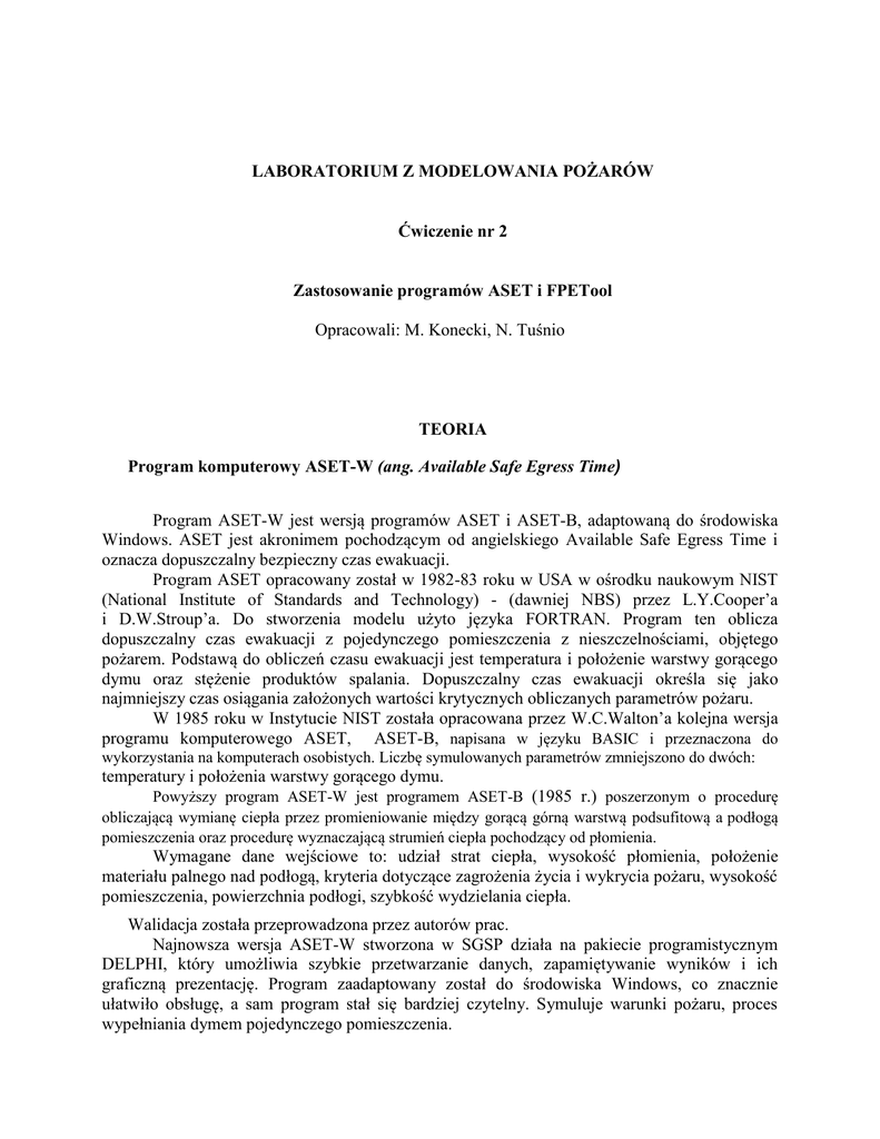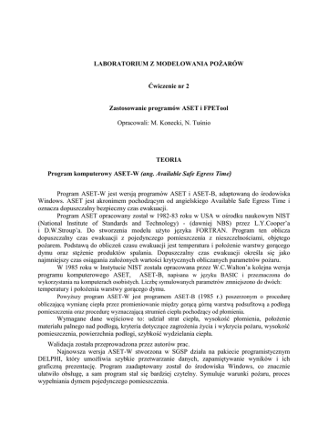 LABORATORIUM Z MODELOWANIA POŻARÓW Ćwiczenie nr 2 Zastosowanie programów ASET i FPETool Opracowali: M. Konecki, N. Tuśnio TEORIA Program komputerowy ASET-W (ang. Available Safe Egress Time) Program ASET-W jest wersją programów ASET i ASET-B, adaptowaną do środowiska Windows. ASET jest akronimem pochodzącym od angielskiego Available Safe Egress Time i oznacza dopuszczalny bezpieczny czas ewakuacji. Program ASET opracowany został w 1982-83 roku w USA w ośrodku naukowym NIST (National Institute of Standards and Technology) - (dawniej NBS) przez L.Y.Cooper’a i D.W.Stroup’a. Do stworzenia modelu użyto języka FORTRAN. Program ten oblicza dopuszczalny czas ewakuacji z pojedynczego pomieszczenia z nieszczelnościami, objętego pożarem. Podstawą do obliczeń czasu ewakuacji jest temperatura i położenie warstwy gorącego dymu oraz stężenie produktów spalania. Dopuszczalny czas ewakuacji określa się jako najmniejszy czas osiągania założonych wartości krytycznych obliczanych parametrów pożaru. W 1985 roku w Instytucie NIST została opracowana przez W.C.Walton’a kolejna wersja programu komputerowego ASET, ASET-B, napisana w języku BASIC i przeznaczona do wykorzystania na komputerach osobistych. Liczbę symulowanych parametrów zmniejszono do dwóch: temperatury i położenia warstwy gorącego dymu. Powyższy program ASET-W jest programem ASET-B (1985 r.) poszerzonym o procedurę obliczającą wymianę ciepła przez promieniowanie między gorącą górną warstwą podsufitową a podłogą pomieszczenia oraz procedurę wyznaczającą strumień ciepła pochodzący od płomienia. Wymagane dane wejściowe to: udział strat ciepła, wysokość płomienia, położenie materiału palnego nad podłogą, kryteria dotyczące zagrożenia życia i wykrycia pożaru, wysokość pomieszczenia, powierzchnia podłogi, szybkość wydzielania ciepła. Walidacja została przeprowadzona przez autorów prac. Najnowsza wersja ASET-W stworzona w SGSP działa na pakiecie programistycznym DELPHI, który umożliwia szybkie przetwarzanie danych, zapamiętywanie wyników i ich graficzną prezentację. Program zaadaptowany został do środowiska Windows, co znacznie ułatwiło obsługę, a sam program stał się bardziej czytelny. Symuluje warunki pożaru, proces wypełniania dymem pojedynczego pomieszczenia. Znaczne ułatwienie w obsłudze stanowi możliwość wybrania wejściowej charakterystyki spalania z listy dostępnych materiałów palnych, powszechnie stosowanych jako materiały wyposażenia wnętrz. Wprowadzone krzywe HRR bazują na rzeczywistych testach ogniowych przeprowadzonych w USA. Otrzymane wartości parametrów pożaru mogą być przenoszone do arkuszy kalkulacyjnych. W formie tabelarycznej otrzymywane są przebiegi czasowe: temperatury warstwy podsufitowej, wysokość warstwy chłodnej, gęstość strumienia ciepła od płomienia, gęstość strumienia ciepła wymienianego w układzie warstwa gorąca- podłoga. Wyniki obliczeń można odwzorować graficznie za pomocą wykresów. Program jako dane wyjściowe traktuje te parametry, które są istotne z punktu widzenia prowadzenia ewakuacji osób z budynku. Dlatego też równania procedury obliczeń odnoszą się do procesów rządzących I fazą rozwoju pożaru. Zestaw programów komputerowych FPETool (ang. Fire Protection Engineering Tool). Program o akronimie FPEtool oznacza narzędzie inżynierskie bezpieczeństwa pożarowego. Stanowi zestaw sprawdzonych narzędzi badawczych w postaci procedur obliczeniowych używanych przez specjalistów w dziedzinie pożarnictwa do oceny dynamiki rozwoju pożaru w pomieszczeniach jak i zagrożenia bezpieczeństwa ludzi znajdujących się w budynku. Obecnie istnieje i jest szeroko dostępnych wiele programów podobnych w swej budowie i założeniach. Program FPEtool jednak jest jednym z najbardziej rozbudowanych a jednocześnie łatwych w obsłudze dla użytkownika. Wyniki otrzymane dzięki niemu są najbardziej zbliżone do otrzymanych w warunkach rzeczywistych pożarów eksperymentalnych, przeprowadzanych w jednym lub w układzie dwóch pomieszczeń. Pozwala również na symulację wpływu tryskacza na moc pożaru jaki i przemieszczającego się dymu w korytarzu. Opublikowana wersja programu 3.2 FPETool została napisana przez S. Deal’a w 1993 r. i opublikowana przez Narodowy Instytut Standardów i Technologii (NIST- USA). Za pomocą modeli programu jest możliwa ocena możliwości przeżycia człowieka poddanego ekspozycji zmiennych warunków pożaru w pomieszczeniu określanych temperaturą dymu i jego toksycznością. Dokumentacja programu jest dostępna w formacie PDF. FPEtool jest kompilacją kilku modułów obliczeniowych: SYSTEM SETUP, FIREFORM, MAKEFIRE, FIRE SIMULATOR, CORRIDOR, 3rd ROOM. SYSTEM SETUP jest programem standardowym. Pozwala użytkownikowi zmienić docelowe miejsce zapisania pliku oraz katalogi źródłowe, zmieniać jednostki operacyjne oraz kolory wyświetlanego obrazu. Używa się systemu SI (system międzynarodowy lub system metryczny) jako domyślnego systemu jednostek. FIREFORM to zestaw procedur zaprojektowanych w celu szybkiego rozwiązywania zagadnień pożarowych o różnych liczbach danych wejściowych. Niżej przykładowe procedury obliczeniowe. Niżej podano przykładowe procedury obliczeniowe opisujące wybrane zjawiska pożarowe. SAMOZAPŁON MATERIAŁU PROMIENIOWANIA CIEPLNEGO WSKUTEK ODDZIAŁYWANIA STRUMIENIA Procedury korelacji doświadczalnych określające moc pożaru (generowanej w strefie spalania), która jest w stanie spowodować samozapłon materiału palnego. Określana jest moc pożaru konieczna do wywołania samozapłonu niepalącego się materiału, który nie ma bezpośredniego kontaktu z płomieniami, ani ze strumieniem ciepła konwekcyjnego. Dane eksperymentalne zapewniają wyznaczenie korelacji między szczytową wartością szybkości wydzielania ciepła z płonącego przedmiotu, a maksymalną odległością do drugiego, nie spalając