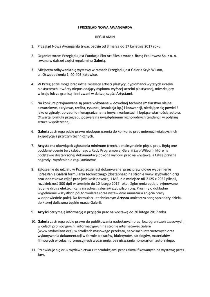 I PRZEGLĄD NOWA AWANGARDA REGULAMIN 1. Przegląd Nowa Awangarda trwać będzie od 3 marca do 17 kwietnia 2017 roku. 2. Organizatorem Przeglądu jest Fundacja Eko Art Silesia wraz z firmą Pro Inwest Sp. z o. o. zwana w dalszej części regulaminu Galerią. 3. Miejscem odbywania się wystawy w ramach Przeglądu jest Galeria Szyb Wilson, ul. Oswobodzenia 1, 40-403 Katowice. 4. W Przeglądzie mogą brać udział wszyscy artyści plastycy, dyplomanci wyższych uczelni plastycznych i twórcy nieposiadający dyplomu wyższej uczelni plastycznej, mieszkający w kraju lub za granicą i inni zwani w dalszej części Artystami. 5. Na konkurs przyjmowane są prace wykonane w dowolnej technice (malarstwo olejne, akwarelowe, akrylowe, rzeźba, rysunek, instalacja itp.) i konwencji, niedające się powielić jako oryginały, uprzednio nienagradzane na innych konkursach i będące własnością autora. Otwarta formuła przeglądu pozwala na uwzględnienie różnorodnych tendencji w polskiej sztuce współczesnej. 6. Galeria zastrzega sobie prawo niedopuszczenia do konkursu prac uniemożliwiających ich ekspozycję z przyczyn technicznych. 7. Artysta ma obowiązek zgłoszenia minimum trzech, a maksymalnie pięciu prac. Będą one poddane ocenie Jury (złożonego z Rady Programowej Galerii Szyb Wilson), które na podstawie dostarczonej dokumentacji dokona wyboru prac na wystawę, a także przyzna nagrody i wyróżnienia regulaminowe. 8. Zgłoszenie do udziału w Przeglądzie jest dokonywane przez prawidłowe wypełnienie i przesłanie Galerii formularza technicznego (dostępnego na stronie www.szybwilson.org) oraz dodatkowo zdjęć prac (wielkość powyżej 1 MB, nie mniejsze niż 2125 x 2952 pikseli, rozdzielczość 300 dpi) w terminie do 10 lutego 2017 roku. Zgłoszenia będą przyjmowane jedynie drogą elektroniczną na adres: [email protected]. Prosimy o dokładne wypełnienie wszystkich pól formularza (oraz wstawienie miniaturki zdjęcia pracy w odpowiednie pole). Na formularzu technicznym Artysta umieszcza cenę sprzedaży dzieła, do której doliczona będzie marża Galerii. 9. Artyści otrzymają informację o przyjęciu prac na wystawę do 20 lutego 2017 roku. 10. Galeria zastrzega sobie prawo do publikowania nadesłanych prac, bez ograniczeń czasowych, w celach promocyjnych i informacyjnych na stronie internetowej Galerii (www.szybwilson.org), w środkach masowego przekazu, serwisach internetowych oraz wykonywania dokumentacji w formie plakatów, biuletynów, katalogów, materiałów filmowych w celach promocyjnych wydarzenia, bez uiszczania honorarium autorskiego. 11. Przewiduje się druk wydawnictwa z reprodukcjami prac zakwalifikowanych na wystawę przez Jury. 12. Przesyłki z pracami powinny być odpowiednio zabezpieczone w opakowaniach umożliwiających wysyłkę zwrotną. Za ewentualne uszkodzenia lub zaginięcia prac podczas transportu Galeria nie ponosi odpowiedzialności. 13. Koszty dostarczenia i odesłania prac oraz ich ewentualnego ubezpieczenia na czas transportu ponoszą Artyści. 14. Każda praca powinna być z tyłu opisana imieniem i nazwiskiem Artysty, tytułem pracy, numerem telefonu do Artysty. 15. Prace powinny być przygotowane w sposób umożliwiający ich powieszenie, dostosowany do wagi i rozmiaru obrazu: mieć przymocowany haczyk (lub inne mocowanie). 16. Za ubezpieczenie obrazów odpowiadają Artyści. Galeria nie ponosi odpowiedzialności (szczególnie finansowej) za zniszczenie lub zgubienie dzieła, jednak dołożymy wszelkich starań, by prace wróciły do Artystów w takim samym stanie, w jakim zostały dostarczone, a każda problematyczna sytuacja będzie rozpatrywana indywidualnie. 17. Galeria nie zwraca kosztów dojazdu, pobytu ani wszelkich innych kosztów związanych z udziałem Artysty w Przeglądzie. 18. • • • Nagrody (Angelusy) ANGELUS – Grand Prix ANGELUS – II Nagroda ANGELUS – Wyróżnienie (Nagrody będą dotowane finansowo) 19. Galeria zastrzega sobie prawo do innego podziału nagród. 20. Zgodnie z wolą Artystów wszystkie prace na Przeglądzie są wystawiane na sprzedaż, chyba że Artysta zastrzeże, iż nie chce sprzedawać danego dzieła. 21. Sprzedaż odbywa się przez cały czas trwania Przeglądu. Kupujący dokonują rezerwacji, wpłacając zaliczkę, a następnie dopłacają resztę kwoty przy odbiorze obrazu. Zakupione prace mogą być odebrane przez kupujących po zakończeniu Przeglądu, dzięki czemu aż do tego momentu pozostają one częścią wystawy. Wyjątek stanowią goście zagraniczni i kolekcjonerzy z dalszych stron Polski, którzy mogą odebrać zakupione prace po uzgodnieniu indywidualnym. 22. Jeśli Artysta nie chce sprzedawać którejś ze swoich prac, w polu „cena” na formularzu technicznym należy wpisać „własność prywatna”. Taką informację należy również umieścić z tyłu obrazu np. na naklejce przytwierdzonej na stałe. 23. Rozliczenie z Artystami nastąpi do około jednego miesiąca po zakończeniu Przeglądu. W zależności od indywidualnych ustaleń należność zostanie przelana na numer konta podany przez Artystę bądź (po ustaleniu terminu) będzie do odebrania w siedzibie Przeglądu. 24. Przystąpienie do konkursu oznacza akceptację regulaminu