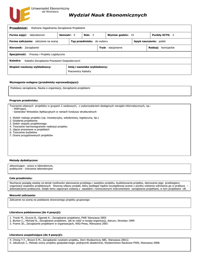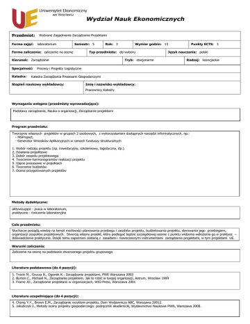 Wydział Nauk Ekonomicznych Przedmiot: Forma zajęć: Wybrane Zagadnienia Zarządzania Projektami laboratorium Semestr: 5 Forma zaliczenia: zaliczenie na ocenę Rok: 3 Typ przedmiotu: do wyboru Kierunek: Zarządzanie Specjalność: Katedra: Wymiar godzin: 15 Punkty ECTS: 3 Język nauczania: polski Tryb: stacjonarne Rodzaj: licencjackie Procesy i Projekty Logistyczne Katedra Zarządzania Procesami Gospodarczymi Stopień naukowy wykładowcy: Imię i nazwisko wykładowcy: Pracownicy Katedry Wymagania wstępne (przedmioty wprowadzające): Podstawy zarządzania, Nauka o organizacji, Zarządzanie projektami Program przedmiotu: Tworzenie własnych projektów w grupach 2 osobowych, z wykorzystaniem dostępnych narzędzi informatycznych, np.: - MSProject, - Generator Wniosków Aplikacyjnych w ramach funduszy strukturalnych 1. 2. 3. 4. 5. 6. 7. Wybór rodzaju projektu (np. inwestycyjny, szkoleniowy, logistyczny, itp.) Działania projektowe Dobór zespołu projektowego Tworzenie harmonogramów realizacji projektu Ujęcie procesowe w projektach Tworzenie budŜetów Ocena przygotowanych projektów Metody dydaktyczne: aktywizujące - praca w laboratorium, praktyczne - ćwiczenia laboratoryjne Cele przedmiotu: Słuchacze posiądą wiedzę na temat moŜliwości planowania przebiegu i zasobów projektu, budŜetowania projektu, sterowania jego przebiegiem, organizacji zespołów projektowych. Stworzą własny projekt, który podlegać będzie szczegółowej ocenie z punktu widzenia wdroŜenia go w praktyce – doświadczenie praktyczne. Dzięki temu zapoznani zostaną z zasadami i nowoczesnymi instrumentami zarządzania projektami, w tym projektami UE. Warunki zaliczenia: Zaliczenie na ocenę na podstawie stworzonego projektu grupowego Literatura podstawowa (do 4 pozycji): 1. Trocki M., Grucza B., Ogonek K.: Zarządzanie projektami, PWE Warszawa 2003 2. Burton C., Michael N., Zarządzanie projektem. Jak to robić w twojej organizacji, Astrum, Wrocław 1999 3. Frame JD., Zarządzanie projektami w organizacjach, WIG-Press, Warszawa 2001 Literatura uzupełniająca (do 4 pozycji): 4. Chong Y.Y., Brown E.M., Zarządzanie ryzykiem projektu, Dom Wydawniczy ABC, Warszawa 20012. 5. Jakubczyk J., Metody oceny projektu gospodarczego: podręcznik akademicki, Wydawnictwo Naukowe PWN, Warszawa 2008.