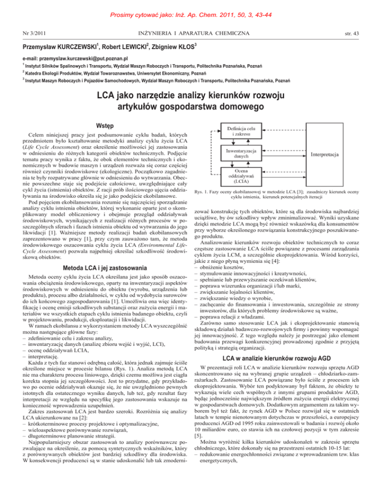 Prosimy cytować jako: Inż. Ap. Chem. 2011, 50, 3, 43-44 INŻYNIERIA I APARATURA CHEMICZNA Nr 3/2011 str. 43 Przemysław KURCZEWSKI1, Robert LEWICKI2, Zbigniew KŁOS3 e-mail: [email protected] 1 Instytut Silników Spalinowych i Transportu, Wydział Maszyn Roboczych i Transportu, Politechnika Poznańska, Poznań 2 Katedra Ekologii Produktów, Wydział Towaroznawstwa, Uniwersytet Ekonomiczny, Poznań 3 Instytut Maszyn Roboczych i Pojazdów Samochodowych, Wydział Maszyn Roboczych i Transportu, Politechnika Poznańska, Poznań LCA jako narzędzie analizy kierunków rozwoju artykułów gospodarstwa domowego Wstęp Celem niniejszej pracy jest podsumowanie cyklu badań, których przedmiotem było kształtowanie metodyki analizy cyklu życia LCA (Life Cycle Assessment) oraz określenie możliwości jej zastosowania w odniesieniu do różnych kategorii obiektów technicznych. Podjęcie tematu pracy wynika z faktu, że obok elementów technicznych i ekonomicznych w budowie maszyn i urządzeń rozważa się coraz częściej również czynniki środowiskowe (ekologiczne). Początkowo zagadnienia te były rozpatrywane głównie w odniesieniu do wytwarzania. Obecnie powszechne staje się podejście całościowe, uwzględniające cały cykl życia (istnienia) obiektów. Z racji prób ilościowego ujęcia oddziaływania na środowisko określa się je jako podejście ekobilansowe. Pod pojęciem ekobilansowania rozumie się najczęściej sporządzanie analizy cyklu istnienia obiektów, której wykonanie oparte jest o skomplikowany model obliczeniowy i obejmuje przegląd oddziaływań środowiskowych, wynikających z realizacji różnych procesów w poszczególnych sferach i fazach istnienia obiektu od wytwarzania do jego likwidacji [1]. Ważniejsze metody realizacji badań ekobilansowych zaprezentowano w pracy [1], przy czym zauważono tam, że metoda środowiskowego oszacowania cyklu życia LCA (Environmental LifeCycle Assessment) pozwala najpełniej określać szkodliwość środowiskową obiektów. Metoda LCA i jej zastosowania Metoda oceny cyklu życia LCA określana jest jako sposób oszacowania obciążenia środowiskowego, oparty na inwentaryzacji aspektów środowiskowych w odniesieniu do obiektu (wyrobu, urządzenia lub produktu), procesu albo działalności, w cyklu od wydobycia surowców do ich końcowego zagospodarowania [1]. Umożliwia ona więc identyfikację i ocenę emisji szkodliwych substancji oraz zużycia energii i materiałów we wszystkich etapach cyklu istnienia badanego obiektu, czyli w projektowaniu, produkcji, eksploatacji i likwidacji. W ramach ekobilansu z wykorzystaniem metody LCA wyszczególnić można następujące główne fazy: – zdefiniowanie celu i zakresu analizy, – inwentaryzację danych (analizę zbioru wejść i wyjść, LCI), – ocenę oddziaływań LCIA, – interpretację. Każda z tych faz stanowi odrębną całość, która jednak zajmuje ściśle określone miejsce w procesie bilansu (Rys. 1). Analiza metodą LCA nie ma charakteru procesu liniowego, dzięki czemu możliwa jest ciągła korekta stopnia jej szczegółowości. Jest to przydatne, gdy przykładowo po ocenie oddziaływań okazuje się, że nie uwzględniono pewnych istotnych dla ostatecznego wyniku danych, lub też, gdy rezultat fazy interpretacji ze względu na specyfikę jego zastosowania wskazuje na konieczność wprowadzenia uzupełnień. Zakres zastosowań LCA jest bardzo szeroki. Rozróżnia się analizy LCA ukierunkowane na [2]: – krótkoterminowe procesy projektowe i optymalizacyjne, – wieloaspektowe porównywanie rozwiązań, – długoterminowe planowanie strategii. Najpopularniejszy obszar zastosowań to analizy porównawcze pozwalające na określenie, za pomocą syntetycznych wskaźników, który z porównywanych obiektów jest bardziej szkodliwy dla środowiska. W konsekwencji producenci są w stanie udoskonalić lub tak zmoderni- Rys. 1. Fazy oceny ekobilansowej w metodzie LCA [3]; zasadniczy kierunek oceny cyklu istnienia, kierunek potencjalnych iteracji zować konstrukcję tych obiektów, które są dla środowiska najbardziej uciążliwe, by ów szkodliwy wpływ zminimalizować. Wyniki uzyskane dzięki metodzie LCA mogą być również wskazówką dla konsumentów przy wyborze określonego rozwiązania konstrukcyjnego poszukiwanego produktu. Analizowanie kierunków rozwoju obiektów technicznych to coraz częstsze zastosowanie LCA ściśle powiązane z procesami zarządzania cyklem życia LCM, a szczególnie ekoprojektowania. Wśród korzyści, jakie z niego płyną wymienia się [4]: – obniżenie kosztów, – stymulowanie innowacyjności i kreatywności, – spełnianie lub przewyższanie oczekiwań klientów, – poprawa wizerunku organizacji i/lub marki, – zwiększanie lojalności klientów, – zwiększanie wiedzy o wyrobie, – zachęcanie do finansowania i inwestowania, szczególnie ze strony inwestorów, dla których problemy środowiskowe są ważne, – poprawa relacji z władzami. Zarówno samo stosowanie LCA jak i ekoprojektowanie stanowią składową działań badawczo-rozwojowych firmy i powinny wspomagać jej innowacyjność. Z tego względu należy je postrzegać jako element budowania przewagi konkurencyjnej prowadzonej zgodnie z przyjętą polityką i strategią organizacji. LCA w analizie kierunków rozwoju AGD W prezentacji roli LCA w analizie kierunków rozwoju sprzętu AGD skoncentrowano się na wybranej grupie urządzeń – chłodziarko-zamrażarkach. Zastosowanie LCA powiązane było ściśle z procesem ich ekoprojektowania. Wybór ten podyktowany był faktem, że obiekty te wykazują wiele cech wspólnych z innymi grupami produktów AGD, będąc jednocześnie największym źródłem zużycia energii elektrycznej w gospodarstwach domowych. Dodatkowym argumentem za takim wyborem był też fakt, że rynek AGD w Polsce rozwijał się w ostatnich latach w tempie nienotowanym dotychczas w przeszłości, a europejscy producenci AGD od 1995 roku zai