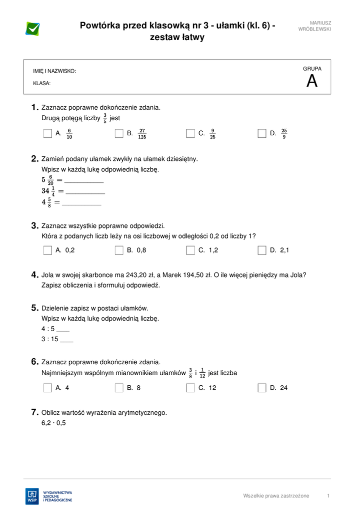 Powtórka przed klasowką nr 3 - ułamki (kl. 6) zestaw łatwy MARIUSZ WRÓBLEWSKI GRUPA IMIĘ I NAZWISKO: A KLASA: 1. Zaznacz poprawne dokończenie zdania. Drugą potęgą liczby A. 2. jest B. C. D. Zamień podany ułamek zwykły na ułamek dziesiętny. Wpisz w każdą lukę odpowiednią liczbę. ____________ ____________ ____________ 3. Zaznacz wszystkie poprawne odpowiedzi. Która z podanych liczb leży na osi liczbowej w odległości 0,2 od liczby 1? A. 0,2 4. B. 0,8 C. 1,2 D. 2,1 Jola w swojej skarbonce ma 243,20 zł, a Marek 194,50 zł. O ile więcej pieniędzy ma Jola? Zapisz obliczenia i sformułuj odpowiedź. 5. Dzielenie zapisz w postaci ułamków. Wpisz w każdą lukę odpowiednią liczbę. 4 : 5 ____ 3 : 15 ____ 6. Zaznacz poprawne dokończenie zdania. Najmniejszym wspólnym mianownikiem ułamków A. 4 7. B. 8 i jest liczba C. 12 D. 24 Oblicz wartość wyrażenia arytmetycznego. 6,2 · 0,5 Wszelkie prawa zastrzeżone 1 8. Dane są dwa wyrażenia arytmetyczne. I. 10,23 II. Zaznacz poprawne dokończenie zdania. Pomiędzy wyrażeniami I i II zachodzi zależność A. I > II B. I = II C. I < II 9. Oszacuj wyniki działań. Wpisz w każdą lukę odpowiednią liczbę. 1,5 · 21 = około ____ 2,5 · 62 = około ____ 100 · 5,3 = około ____ 10. Uporządkuj podane liczby od najmniejszej do największej. ; ; ; Zapisz rozwiązanie. 11. Oblicz wartość wyrażenia arytmetycznego. 2,3 + 13 · 0,1 12. Rodzice kupili w sklepie pralkę i lodówkę. Pralka ważyła 65,50 kg, a lodówka 82 kg 20 dag. Ile łącznie ważyły zakupy? Uzupełnij obliczenia i odpowiedź. Wpisz w każdą lukę odpowiednią liczbę. Masę lodówki wyraź w kilogramach. 82 kg 20 dag = ________ kg Oblicz łączną masę pralki i lodówki. ________ + ________ = ________ Odpowiedź: Zakupy ważyły łącznie ________ kg. 13. Zaznacz poprawną odpowiedź. W kinie Bajka są dwie sale: większa i mniejsza. W większej sali jest 90 miejsc co stanowi wszystkich miejsc w kinie. Ile jest wszystkich miejsc w tym kinie? A. 45 B. 120 C. 135 D. 270 Wszelkie prawa zastrzeżone 2 14. Skróć ułamki przez 6. Wpisz w każdą lukę odpowiedni ułamek. = ____ = ____ 15. Zaznacz poprawną odpowiedź. Rodzina pojechała na wycieczkę rowerową. Jechali przez 2 godziny ze średnią prędkością 10 km/h. Jaką drogę pokonali w tym czasie? A. 20 km B. 30 km C. 40 km D. ponad 40 km 16. 1 kg jabłek kosztuje 2,50 zł. Ile kosztuje 3 kg tych jabłek? Wpisz w każdą lukę odpowiednią liczbę. Koszt 3 kg jabłek: ________ cena 1 kg · ________ = ________ zł liczba kg 17. Zosia pokonała trasę długości 12 km w ciągu trzech dni. Pierwszego dnia pokonała długości trasy, drugiego dnia 0,3 długości trasy, a trzeciego dnia resztę. Ile kilometrów pokonywała Zosia każdego dnia? Uzupełnij rozwiązanie zadania. Wpisz w każdą lukę właściwe liczby. I dzień: · ____ km = ____ km II dzień: 0,3 · ____ km = ____ km III dzień: ____ km – (____ km + ____ km) = ____ km – ____ km = ____ km 18. Zaznacz poprawną odpowiedź. Uczniowie klasy VIa kupili 7 jednakowej wielkości pizz. Każda pizza została pokrojona przez kucharza na 8 kawałków. Chłopcy zjedli 31 kawałków pizzy. Ile spośród zakupionych pizz zjedli chłopcy? A. 3 pizze B. 4 pizze C. D. Wszelkie prawa zastrzeżone 3 19. Na diagramie przedstawiono wyniki ankiety przeprowadzonej wśród 288 uczniów. Uczniowie odpowiadali na pytanie: „Czy chcesz uczestniczyć w zajęciach sportowych, jeśli tak, to w których?”. Każdy uczeń udzielił tylko jednej odpowiedzi. Oblicz liczbę uczniów, którzy nie chcą uczestniczyć w zajęciach sportowych. Rozwiąż zadanie, wykonując kolejne polecenia. Wpisz w każdą lukę odpowiednią liczbę. Oblicz, jaka część uczniów chce uczestniczyć w zajęciach sportowych. Oblicz, jaka część uczniów nie chce uczestniczyć w zajęciach sportowych. Oblicz liczbę uczniów, którzy nie chcą uczestniczyć w zajęciach sportowych. Uzupełnij odpowiedź. Liczba uczniów, którzy nie chcą uczestniczyć w zajęciach sportowych, jest równa ________ . 20. Zamaluj koła. Wszelkie prawa zastrzeżone 4 21. Znajdź rozwinięcia dziesiętne podanych ułamków zwykłych. Wpisz w każdą lukę odpowiednią liczbę. ________ ________ 22. Połącz ułamek z zaokrągleniem do części setnych. Wpisz w każdą lukę odpowiednią literę. I. 0,135 A. 0,76 II. 0,134 B. 0,13 III. 0,765 C. 0,14 IV. 0,762 D. 0,77 I – ____, II – ____, III –____, IV – ____ 23. Oblicz. Wpisz w każdą lukę odpowiednią liczbę. = ________ 0,23 = ________ 24. W klasie Va jest 6 dziewczynek i 14 chłopców. Jaką część klasy stanowią dziewczynki? Wynik przedstaw w postaci ułamka dziesiętnego. Zapisz obliczenia i sformułuj odpowiedź. 25. Zaznacz na osi liczbowej liczbę 3,5. 26. Kanał Augustowski ma 101 km długości, a Kanał Bydgoski 24,7 km. O ile kilometrów dłuższy jest Kanał Augustowski od Kanału Bydgoskiego? Zapisz obliczenia i sformułuj odpowiedź. 27. Zaznacz poprawne dokończenie zdania. Trzy kilogramy jabłek podzielono po równo pomiędzy dziesięcioro dzieci. Każde dziecko dostanie A. kg jabłek. B. kg jabłek. C. kg jabłek. D. kg jabłek. Wszelkie prawa zastrzeżone 5 28. Zaznacz na prostokącie C łączną powierzchnię zamalowanych części prostokątów A i B. A B C 29. Zaznacz poprawną odpowiedź. Szerokość pokoju Kuby wynosi 2,7 m, a długość jest dwa razy większa od szerokości. Jaka jest długość tego pokoju? A. 1,35 m B. 4,14 m C. 4,7 m D. 5,4 m 30. Uzupełnij równości. Wpisz w każdą lukę odpowiednią liczbę. Wszelkie prawa zastrzeżone 6