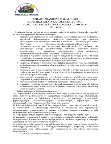SPRAWOZDANIE Z DZIAŁALNOŚCI STOWARZYSZENIA NA RZECZ INTEGRACJI DZIECI I MŁODZIEŻY „PRZYJACIELE Z OSIEDLA” 2011 ROK Działalność Stowarzyszenia na rzecz integracji dzieci i młodzieży „Przyjaciele z osiedla” w 2011 roku oparta była na celach statutowych: 1. organizowanie alternatywnych form spędzania czasu wolnego dzieciom i młodzieży zagrożonej niedostosowaniem społecznym (promowanie zajęć sportowo rekreacyjnych oraz działalności kulturalno i kulturalno – oświatowej jako formy efektywnego i twórczego sposobu spędzania wolnego czasu); 2. promowanie rodziny jako elementarnej komórki społecznej niezbędnej do prawidłowego rozwoju psychofizycznego człowieka, oferowanie pomocy specjalistycznej ze szczególnym uwzględnieniem rodzin zagrożonych niedostosowaniem społecznym, „eurosierot”, rodzin wielodzietnych; 3. działanie i wspieranie wszelkich inicjatyw mających na uwadze pomoc dzieciom i młodzieży, wspieranie szeroko pojętej pomocy pedagogicznej, psychologicznej tworzenie optymalnych warunków rozwoju dzieci i młodzieży; 4. inicjowanie programów prowadzących do redukcji czynników psycho-emocjonalnych, socjo-ekonomicznych sprzyjających marginalizacji i wykluczeniu społecznemu dzieci i młodzieży; 5. promocja wiedzy z zakresu szeroko pojętej profilaktyki w środowisku lokalnym przez realizowanie szkoleń, warsztatów, kursów dla rodziców i wychowawców oraz innych osób pracujących z młodzieżą; 6. aktywizowanie młodzieży na rzecz działań pozytywnych społecznie, inicjowanie programów wyłaniania liderów młodzieżowych w różnych sferach życia publicznego; 7. szeroko rozumiana działalność społeczna, artystyczna i edukacyjna; 8. tworzenie i rozwijanie nowych form placówek opiekuńczo-wychowawczych, świetlic socjoterapeutycznych i klubowych form pomocy dzieciom i młodzieży zagrożonej wykluczeniem społecznym. Realizowaliśmy cele Stowarzyszenia poprzez : a) organizowanie i prowadzenie wszelkich form zajęć pozalekcyjnych zaspokajających różne potrzeby podopiecznych ze szczególnym uwzględnieniem: zajęć edukacyjnych, promujących wiedzą o dziedzictwie kulturowym i przyrodniczym, artystycznych, psychologicznych, psychoedukacyjnych, wychowawczych, wspierających, oraz stymulujących rozwój fizyczny, umysłowy oraz emocjonalny; b) inicjowanie i rozwijanie wszelkich form integracji dzieci i młodzieży z różnych środowisk c) współdziałanie z administracją państwowa i samorządową oraz organizacjami pozarządowymi, wyznaniowymi, prywatnymi i środkami masowego przekazu w celu propagowania i realizacji celów stowarzyszenia; d) współpraca z innymi organizacjami wspierającymi i realizującymi podobne cele e) tworzenie, prowadzenie i udział w programach, warsztatach, szkoleniach, wykładach, uroczystościach i imprezach kulturalno-oświatowych na rzecz organizacji i inicjatyw działających na określonych w statucie obszarach; f) wydawanie w miarę potrzeby własnych broszur, ulotek oraz opracowywanie materiałów informacyjno-promocyjnych i edukacyjno-szkoleniowych, dotyczącej działalności stowarzyszenia oraz udostępnianie ich zainteresowanym placówkom, instytucjom i organizacjom. W 2011 roku współpracowaliśmy z: Departamentem Spraw Społecznych Urząd Miasta Białystok Departamentem Strategii i Rozwoju UM Biurem Sportu i Rekreacji UM Komendą Wojewódzką Policji w Białymstoku Komendą Miejską Policji w Białymstoku Fundacją „Pomóż im” Oddziałem Caritas Białystok Lokalnym programem pomocy społecznej „Wychowawca Podwórkowy” Jagiellonia - Białystok Sportową Spółką Akcyjną MOSIR Białystok Firmą Sportową „Kaja” Firmą Fastguad Centrum Przygód szkoły podstawowe, gimnazjalne i ponadgimnazjalne miasta Białegostoku organizacje pozarządowe i wolontariat 24 stycznia 2011r. na Placu Miejskim Stowarzyszenie wraz z lokalnym programem pomocy społecznej „Wychowawca Podwórkowy” zorganizowało imprezę otwierającą FERIE ZIMOWE 2011 w Białymstoku. Współorganizatorem imprezy była Komenda Wojewódzka Policji, której funkcjonariusze przeprowadzili konkursy, quizy dotyczące zasad bezpiecznych form wypoczynku w czasie zimy. W ramach imprezy odbył się także pokaz sprzętu Straży Granicznej oraz Oddziałów Prewencji. W czasie imprezy można było pojeździć na łyżwach na ślizgawce, rozegrać konkursy sportowe, mini mecze hokeja i unihokeja. Wychowawcy i członkowie Stowarzyszenia przygotowali też liczne niespodzianki, gry, zabawy i konkursy, w których mogli wziąć udział wszyscy chętni. Firma FASTQUAD zapewniła oprawę muzyczną towarzyszącą imprezie, jak również przygotowała wraz z wychowawcami różne konkursy tematyczne i zabawy integracyjne, 01.03.2011r. w Niepublicznej Szkole Podstawowej św.św. Cyryla i Metodego członkowie Stowarzyszenia zorganizowali uczniom tej szkoły Bal Karnawałowy. Impreza odbyła się pod hasłem „Bajki i bajeczki”. W czasie imprezy odbywały się liczne konkursy, zabawy, dzieci mogły wykonać prace plastyczne, biżuterię. Na ogromnych arkuszach dzieci rysowały postacie z bajek i bajeczek, opowiadały o swoim ulubionym bohaterze. 09.05.2011r. w Wojewódzkim Ośrodku Animacji Kultury „Spodki” odbyła się impreza „TOP EKO MODEL”, w której udział wzięły dzieci ze szkół podstawowych (ok. 100 osób). Imprezę współorganizowali członkowie Stowarzyszenia i wychowawcy podwórkowi. Zadaniem uczestników było przygotowanie ekologicznych strojów i dokonania prezentacji pod kierunkiem wychowawców. Podczas imprezy odbył się też quiz ekologiczny. Niezmiernie cieszy fakt udziału rodziców w naszym przedsięwzięciu, którzy dopingowali swoje pociechy oraz aktywnie uczestniczyli w imprezie. 14.06.2011r. w Kinie Forum odbyła się impreza „BEZPIECZNE WAKACJE” organizowana przez KMP oraz UM w Białymstoku, lokalny program pomocy społecznej „Wychowawca Podwórkowy” oraz Stowarzyszenie na rzecz integr