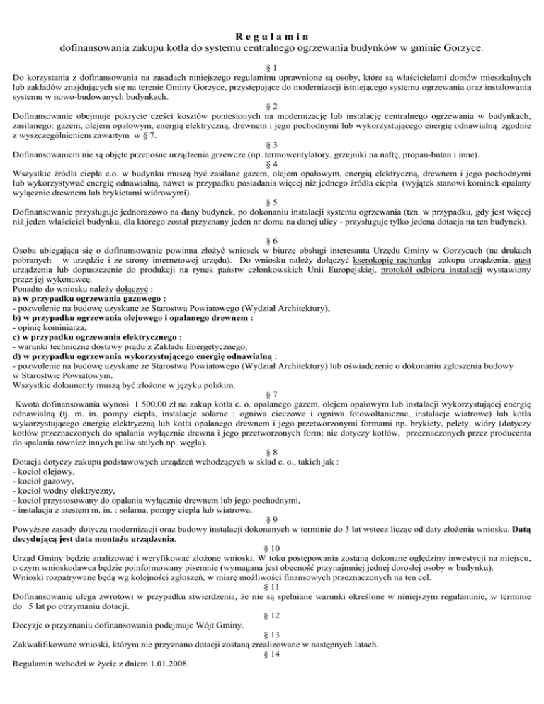 Regulamin dofinansowania zakupu kotła do systemu centralnego ogrzewania budynków w gminie Gorzyce. §1 Do korzystania z dofinansowania na zasadach niniejszego regulaminu uprawnione są osoby, które są właścicielami domów mieszkalnych lub zakładów znajdujących się na terenie Gminy Gorzyce, przystępujące do modernizacji istniejącego systemu ogrzewania oraz instalowania systemu w nowo-budowanych budynkach. §2 Dofinansowanie obejmuje pokrycie części kosztów poniesionych na modernizację lub instalację centralnego ogrzewania w budynkach, zasilanego: gazem, olejem opałowym, energią elektryczną, drewnem i jego pochodnymi lub wykorzystującego energię odnawialną zgodnie z wyszczególnieniem zawartym w § 7. §3 Dofinansowaniem nie są objęte przenośne urządzenia grzewcze (np. termowentylatory, grzejniki na naftę, propan-butan i inne). §4 Wszystkie źródła ciepła c.o. w budynku muszą być zasilane gazem, olejem opałowym, energią elektryczną, drewnem i jego pochodnymi lub wykorzystywać energię odnawialną, nawet w przypadku posiadania więcej niż jednego źródła ciepła (wyjątek stanowi kominek opalany wyłącznie drewnem lub brykietami wiórowymi). §5 Dofinansowanie przysługuje jednorazowo na dany budynek, po dokonaniu instalacji systemu ogrzewania (tzn. w przypadku, gdy jest więcej niż jeden właściciel budynku, dla którego został przyznany jeden nr domu na danej ulicy - przysługuje tylko jedena dotacja na ten budynek). §6 Osoba ubiegająca się o dofinansowanie powinna złożyć wniosek w biurze obsługi interesanta Urzędu Gminy w Gorzycach (na drukach pobranych w urzędzie i ze strony internetowej urzędu). Do wniosku należy dołączyć kserokopię rachunku zakupu urządzenia, atest urządzenia lub dopuszczenie do produkcji na rynek państw członkowskich Unii Europejskiej, protokół odbioru instalacji wystawiony przez jej wykonawcę. Ponadto do wniosku należy dołączyć : a) w przypadku ogrzewania gazowego : - pozwolenie na budowę uzyskane ze Starostwa Powiatowego (Wydział Architektury), b) w przypadku ogrzewania olejowego i opalanego drewnem : - opinię kominiarza, c) w przypadku ogrzewania elektrycznego : - warunki techniczne dostawy prądu z Zakładu Energetycznego, d) w przypadku ogrzewania wykorzystującego energię odnawialną : - pozwolenie na budowę uzyskane ze Starostwa Powiatowego (Wydział Architektury) lub oświadczenie o dokonaniu zgłoszenia budowy w Starostwie Powiatowym. Wszystkie dokumenty muszą być złożone w języku polskim. §7 Kwota dofinansowania wynosi 1 500,00 zł na zakup kotła c. o. opalanego gazem, olejem opałowym lub instalacji wykorzystującej energię odnawialną (tj. m. in. pompy ciepła, instalacje solarne : ogniwa cieczowe i ogniwa fotowoltaniczne, instalacje wiatrowe) lub kotła wykorzystującego energię elektryczną lub kotła opalanego drewnem i jego przetworzonymi formami np. brykiety, pelety, wióry (dotyczy kotłów przeznaczonych do spalania wyłącznie drewna i jego przetworzonych form; nie dotyczy kotłów, przeznaczonych przez producenta do spalania również innych paliw stałych np. węgla). §8 Dotacja dotyczy zakupu podstawowych urządzeń wchodzących w skład c. o., takich jak : - kocioł olejowy, - kocioł gazowy, - kocioł wodny elektryczny, - kocioł przystosowany do opalania wyłącznie drewnem lub jego pochodnymi, - instalacja z atestem m. in. : solarna, pompy ciepła lub wiatrowa. §9 Powyższe zasady dotyczą modernizacji oraz budowy instalacji dokonanych w terminie do 3 lat wstecz licząc od daty złożenia wniosku. Datą decydującą jest data montażu urządzenia. § 10 Urząd Gminy będzie analizować i weryfikować złożone wnioski. W toku postępowania zostaną dokonane oględziny inwestycji na miejscu, o czym wnioskodawca będzie poinformowany pisemnie (wymagana jest obecność przynajmniej jednej dorosłej osoby w budynku). Wnioski rozpatrywane będą wg kolejności zgłoszeń, w miarę możliwości finansowych przeznaczonych na ten cel. § 11 Dofinansowanie ulega zwrotowi w przypadku stwierdzenia, że nie są spełniane warunki określone w niniejszym regulaminie, w terminie do 5 lat po otrzymaniu dotacji. § 12 Decyzje o przyznaniu dofinansowania podejmuje Wójt Gminy. § 13 Zakwalifikowane wnioski, którym nie przyznano dotacji zostaną zrealizowane w następnych latach. § 14 Regulamin wchodzi w życie z dniem 1.01.2008.