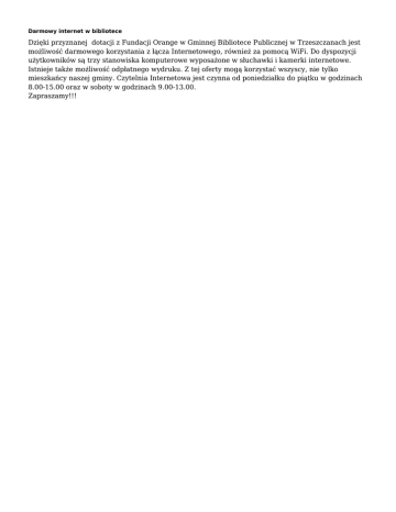 Darmowy internet w bibliotece Dzięki przyznanej dotacji z Fundacji Orange w Gminnej Bibliotece Publicznej w Trzeszczanach jest możliwość darmowego korzystania z łącza Internetowego, również za pomocą WiFi. Do dyspozycji użytkowników są trzy stanowiska komputerowe wyposażone w słuchawki i kamerki internetowe. Istnieje także możliwość odpłatnego wydruku. Z tej oferty mogą korzystać wszyscy, nie tylko mieszkańcy naszej gminy. Czytelnia Internetowa jest czynna od poniedziałku do piątku w godzinach 8.00-15.00 oraz w soboty w godzinach 9.00-13.00. Zapraszamy!!!