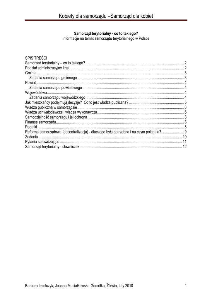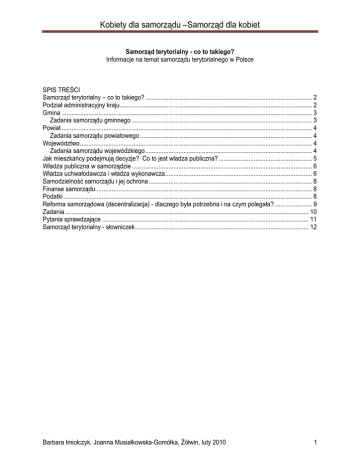 Kobiety dla samorządu –Samorząd dla kobiet Samorząd terytorialny - co to takiego? Informacje na temat samorządu terytorialnego w Polsce SPIS TREŚCI Samorząd terytorialny – co to takiego? .................................................................................................... 2 Podział administracyjny kraju................................................................................................................... 2 Gmina ...................................................................................................................................................... 3 Zadania samorządu gminnego ............................................................................................................ 3 Powiat ...................................................................................................................................................... 4 Zadania samorządu powiatowego ....................................................................................................... 4 Województwo........................................................................................................................................... 4 Zadania samorządu wojewódzkiego.................................................................................................... 4 Jak mieszkańcy podejmują decyzje? Co to jest władza publiczna? ........................................................ 5 Władza publiczna w samorządzie ............................................................................................................ 6 Władza uchwałodawcza i władza wykonawcza........................................................................................ 6 Samodzielność samorządu i jej ochrona.................................................................................................. 8 Finanse samorządu.................................................................................................................................. 8 Podatki..................................................................................................................................................... 8 Reforma samorządowa (decentralizacja) - dlaczego była potrzebna i na czym polegała?....................... 9 Zadania .................................................................................................................................................. 10 Pytania sprawdzające ............................................................................................................................ 11 Samorząd terytorialny - słowniczek........................................................................................................ 12 Barbara Imiołczyk, Joanna Musiałkowska-Gomółka, śółwin, luty 2010 1 Kobiety dla samorządu –Samorząd dla kobiet Samorząd terytorialny – co to takiego? Od dawien dawna ludzie łączyli się we wspólnoty. Razem łatwiej im było zdobywać poŜywienie, szukać dogodnego miejsca do zamieszkania, dbać o bezpieczeństwo, budować domy, wychowywać dzieci. W miarę, jak wspólnoty te stawały się coraz bardziej rozbudowane, ich potrzeby coraz większe, zaspokajanie wspólnych potrzeb coraz trudniejsze, wykształciły się bardziej skomplikowane formy współdziałania i współpracy. Dzisiaj we wszystkich miejscach naszego globu nazywa się samorządem terytorialnym (po angielsku: self-government) taką formę organizacji społeczności, która pozwala zaspokajać potrzeby mieszkańców określonego terytorium. Samorząd terytorialny to wspólnota mieszkańców zamieszkujących określone terytorium uczestnicząca z mocy prawa w sprawowaniu władzy publicznej w imieniu własnym i na własną odpowiedzialność. Terytorium wspólnoty samorządowej określa dziś prawo uwzględniając więzi społeczne, historyczne i kulturowe mieszkańców. Dzisiejsza wspólnota mieszkańców róŜni się znacznie od tej sprzed wieków. Tak jak róŜni się dzisiejszy człowiek, jego sposób Ŝycia i jego potrzeby od człowieka sprzed stuleci. Ale istota samorządu terytorialnego pozostaje ta sama. KaŜdy z mieszkańców jest członkiem wspólnoty samorządowej. Jesteśmy członkami tej wspólnoty samorządowej, na której terytorium mieszkamy. Jeśli zmieniamy miejsce zamieszkania, stajemy się członkiem innej wspólnoty samorządowej. Jesteśmy członkami takiej wspólnoty z mocy prawa. Nie moŜemy z niej zrezygnować ani być członkiem innej wspólnoty niŜ tej, z którą jesteśmy związani miejscem zamieszkania. Nie musimy jednak zapisywać się do niej – waŜne jest to, Ŝe mieszkamy na danym obszarze. Wspólnota ta, w swoim imieniu i na własną odpowiedzialność, zaspokaja swoje potrzeby, dba o podstawowe dla niej interesy, gospodaruje własnym majątkiem i finansami. Jest odpowiedzialna za ten obszar naszej planety, którą wspólnie zamieszkuje. Mówimy o wspólnocie lokalnej (w Polsce będzie to gmina i powiat), wspólnocie regionalnej (w Polsce będzie to województwo). Podział administracyjny kraju Wspólnoty gminne, powiatowe i wojewódzkie stanowią podstawę administracyjnego podziału kraju uchwalonego ustawą. W Polsce mamy 16 województw, 379 powiatów i 2478 gmin. Konstytucja RP stanowi, Ŝe ogół mieszkańców jednostek zasadniczego podziału terytorialnego stanowi z mocy prawa wspólnotę samorządową. Barbara Imiołczyk, Joanna Musiałkowska-Gomółka, śółwin, luty 2010 2 Kobiety dla samorządu –Samorząd dla kobiet Gminy, powiaty i województwa są niezaleŜne. Oznacza to, Ŝe gminy nie podlegają powiatom, a powiaty i gminy nie podlegają województwom. Wszyscy jesteśmy członkami trzech rodzajów wspólnot samorządowych: gmin, powiatów i województw. Gmina NajbliŜsza nam i najwaŜniejsza dla nas jest gmina. Tu toczy się nasze Ŝycie, z tą wspólnotą samorządową identyfikujemy się zwykle najsilniej i związani jesteśmy najmocniej w codziennym funkcjon