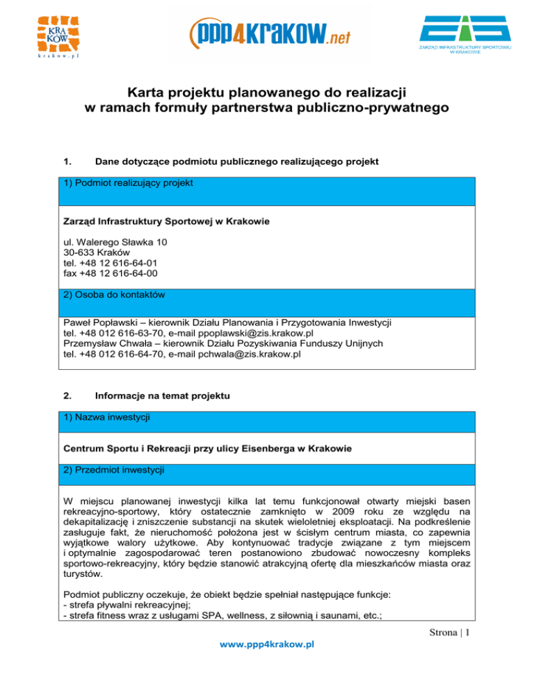 Karta projektu planowanego do realizacji w ramach formuły partnerstwa publiczno-prywatnego 1. Dane dotyczące podmiotu publicznego realizującego projekt 1) Podmiot realizujący projekt Zarząd Infrastruktury Sportowej w Krakowie ul. Walerego Sławka 10 30-633 Kraków tel. +48 12 616-64-01 fax +48 12 616-64-00 2) Osoba do kontaktów Paweł Popławski – kierownik Działu Planowania i Przygotowania Inwestycji tel. +48 012 616-63-70, e-mail [email protected] Przemysław Chwała – kierownik Działu Pozyskiwania Funduszy Unijnych tel. +48 012 616-64-70, e-mail [email protected] 2. Informacje na temat projektu 1) Nazwa inwestycji Centrum Sportu i Rekreacji przy ulicy Eisenberga w Krakowie 2) Przedmiot inwestycji W miejscu planowanej inwestycji kilka lat temu funkcjonował otwarty miejski basen rekreacyjno-sportowy, który ostatecznie zamknięto w 2009 roku ze względu na dekapitalizację i zniszczenie substancji na skutek wieloletniej eksploatacji. Na podkreślenie zasługuje fakt, Ŝe nieruchomość połoŜona jest w ścisłym centrum miasta, co zapewnia wyjątkowe walory uŜytkowe. Aby kontynuować tradycje związane z tym miejscem i optymalnie zagospodarować teren postanowiono zbudować nowoczesny kompleks sportowo-rekreacyjny, który będzie stanowić atrakcyjną ofertę dla mieszkańców miasta oraz turystów. Podmiot publiczny oczekuje, Ŝe obiekt będzie spełniał następujące funkcje: - strefa pływalni rekreacyjnej; - strefa fitness wraz z usługami SPA, wellness, z siłownią i saunami, etc.; Strona | 1 www.ppp4krakow.pl - strefa komercyjna (preferowane usługi: gastronomia, hotel i centrum konferencyjne) wraz z zapleczem biurowym; - strefa parkingu oraz infrastruktury towarzyszącej. Powierzchnia terenu przeznaczona na przedmiotową inwestycję wynosi ok. 1,8 ha (tj. ok. 18.000 m2), jest zlokalizowana w centrum Krakowa w pobliŜu głównych ciągów komunikacyjnych miasta. Mając na względzie optymalizację rentowności przedsięwzięcia strona publiczna nie określa jej szczegółowego zakresu, ograniczając się do przedstawienia najistotniejszych funkcji, wskazania podstawowych kryteriów i standardów jakie powinna spełniać inwestycja oraz do sformułowania warunków brzegowych współpracy z partnerem prywatnym. Na partnerze prywatnym będzie spoczywał obowiązek zaprojektowania i dopracowania szczegółów związanych z zagospodarowaniem terenu i ustaleniem funkcji komercyjnych obiektu, tak aby z punktu widzenia biznesowego przedsięwzięcie było opłacalne. W ramach swych obowiązków partner prywatny dostosuje takŜe projekt do załoŜeń i potrzeb określonych przez stronę publiczną w zakresie obiektu sportowo-rekreacyjnego, natomiast pozostałą część inwestycji będzie mógł zrealizować zgodnie ze swoimi celami przy zachowaniu zgodności z określonymi zasadami współpracy oraz przepisami prawa, w tym z aktami prawnymi lub dokumentami dotyczącymi sposobu i moŜliwości zabudowy tej części miasta. Istotnymi atutami niniejszej oferty są stosunkowo szeroki zakres moŜliwości komercyjnych, jakie mogą być zrealizowane w ramach inwestycji oraz obszerne pole negocjacji z podmiotem publicznym. Nie bez znaczenia jest takŜe moŜliwość uczestniczenia przy przygotowywaniu dokumentacji projektowej, dzięki czemu partner prywatny będzie mógł lepiej dostosować obiekt do realizacji załoŜonych celów. 3) Miejsce realizacji inwestycji Województwo Małopolskie, Miasto Kraków, Dzielnica II Grzegórzki, ulica Filipa Eisenberga 2. Inwestycja zlokalizowana jest w centrum Krakowa, pomiędzy ulicami: Eisenberga, Grunwaldzką i Supniewskiego, z bezpośrednim dojazdem od strony ul. Eisenberga. W pobliŜu znajdują się główne ciągi komunikacyjne, centra handlowe i obwodnica północna miasta Krakowa. Ponadto w najbliŜszym otoczeniu występuje zabudowa jednorodzinna, a w nieznacznym oddaleniu – wielorodzinna, strefa usług hotelowych, komercyjnych i biurowych (klasa „A”). Obiekt usytuowany w pobliŜu Ronda Mogilskiego (jeden z głównych węzłów komunikacyjnych miasta), dogodny dostęp do sieci dróg publicznych, bliskość dworca autobusowego i kolejowego. Alternatywne formy komunikacji: ścieŜka rowerowa. 4) Etap realizacji projektu a) pomysł; b) wybrana firma doradcza; c) analizy przedrealizacyjne; d) wszczęte postępowanie; e) wybrany partner prywatny; f) budowa obiektu; g) eksploatacja obiektu. Strona | 2 www.ppp4krakow.pl 5) Planowany podział zadań pomiędzy stroną publiczną a partnerem prywatnym Zobowiązania partnera prywatnego: - wniesienie wiedzy i doświadczenia (know-how) w zakresie projektowania, budowy oraz zarządzania duŜymi obiektami sportowymi i komercyjnymi; - przygotowanie dokumentacji projektowej w uzgodnieniu ze stroną publiczną; - wkład finansowy w budowę i wyposaŜenie obiektu; - promocja, marketing oraz zarządzanie obiektem. Zobowiązania Gminy Miejskiej Kraków: - wniesienie pod inwestycję gruntów o znacznej wartości; - wsparcie podczas opracowywania planów budowlanych i uzyskiwania stosownych pozwoleń; - współpraca przy promocji obiektu (części sportowo-rekreacyjnej) oraz organizacji imprez, mających na celu animację kompleksu. 6) Preferowana forma współpracy pomiędzy stroną publiczną i prywatną Inwestycja planowana jest do realizacji w formule Partnerstwa Publiczno-Prywatnego lub Koncesji. Preferowany model współpracy w ramach PPP to BOT (buduj, zarządzaj, przekaŜ). 3. Finansowanie i szacunkowa wartość inwestycji 1) Szacunkowy koszt projektu brutto (w złotych) Oszacowano wstępnie koszt części sportowo-rekreacyjnej inwestycji na kwotę ok. 45,1 mln PLN (szacunkowa wartość inwestycji bez gruntów). Ostateczny koszt zostanie określony na podstawie koncepcji architektonicznej opracowanej podczas negocjacji z partnerem prywatnym. 2) Finansowanie projektu - partner publiczny: do negocjacji - partner prywatny: do negocjacji 3) Planowany wkład rzeczowy strony publicznej i szacunkowa war