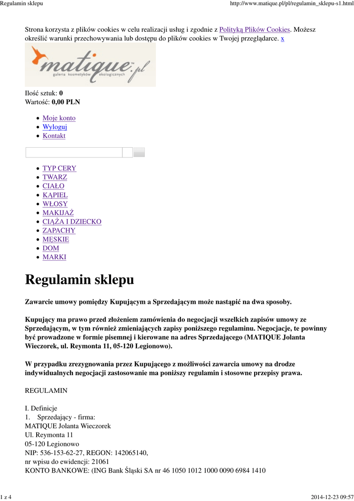 Regulamin sklepu 1z4 http://www.matique.pl/pl/regulamin_sklepu-s1.html Strona korzysta z plików cookies w celu realizacji usług i zgodnie z Polityką Plików Cookies. Możesz określić warunki przechowywania lub dostępu do plików cookies w Twojej przeglądarce. x Ilość sztuk: 0 Wartość: 0,00 PLN Moje konto Wyloguj Kontakt TYP CERY TWARZ CIAŁO KĄPIEL WŁOSY MAKIJAŻ CIĄŻA I DZIECKO ZAPACHY MĘSKIE DOM MARKI Regulamin sklepu Zawarcie umowy pomiędzy Kupującym a Sprzedającym może nastąpić na dwa sposoby. Kupujący ma prawo przed złożeniem zamówienia do negocjacji wszelkich zapisów umowy ze Sprzedającym, w tym również zmieniających zapisy poniższego regulaminu. Negocjacje, te powinny być prowadzone w formie pisemnej i kierowane na adres Sprzedającego (MATIQUE Jolanta Wieczorek, ul. Reymonta 11, 05-120 Legionowo). W przypadku zrezygnowania przez Kupującego z możliwości zawarcia umowy na drodze indywidualnych negocjacji zastosowanie ma poniższy regulamin i stosowne przepisy prawa. REGULAMIN I. Definicje 1. Sprzedający - firma: MATIQUE Jolanta Wieczorek Ul. Reymonta 11 05-120 Legionowo NIP: 536-153-62-27, REGON: 142065140, nr wpisu do ewidencji: 21061 KONTO BANKOWE: (ING Bank Śląski SA nr 46 1050 1012 1000 0090 6984 1410 2014-12-23 09:57 Regulamin sklepu 2z4 http://www.matique.pl/pl/regulamin_sklepu-s1.html 2. Konsument - osoba fizyczna dokonująca zakupu na potrzeby własne. 3. Klient - pełnoletnia osoba fizyczna dokonująca zakupu na potrzeby prowadzonej działalności gospodarczej, osoba prawna lub jednostka organizacyjna nie posiadająca osobowości prawnej. 4. Kupujący - zarówno Konsument, jak i Klient. II. Zawarcie umowy i realizacja 5. Zamówienia można składać 24 godziny na dobę. 6. Wszystkie ceny podawane przez Sprzedającego wyrażone są w polskiej walucie i są cenami brutto (zawierają podatek VAT). Ceny towarów nie zawierają kosztu dostawy, który określony jest w cenniku dostaw. 7. Zawarcie umowy z Konsumentem następuje z chwilą złożenia zamówienia. 8. Realizacja zamówienia Konsumenta płatnego za pobraniem następuje niezwłocznie, a zamówienia płatnego przelewem lub za pośrednictwem systemu płatności elektronicznych po zaksięgowaniu wpłaty Konsumenta na koncie Sprzedającego. 9. Zawarcie umowy z Klientem następuje z chwilą przyjęcia zamówienia przez Sprzedającego, o czym informuje on Klienta w terminie do 48 godzin od złożenia zamówienia. 10. Realizacja zamówienia Klienta następuje w terminie podanym w opisie produktu, a w przypadku zamówień składających się z wielu produktów w najdłuższym terminie spośród terminów podanych na kartach wszystkich produktów. 11. Realizacja zamówienia Klienta może być uzależniona od dokonania wpłaty całości lub części wartości zamówienia lub uzyskania limitu kredytu kupieckiego co najmniej wartości zamówienia lub zgody Sprzedającego na wysłanie zamówienia za pobraniem (płatnego przy odbiorze). 12. Zakupiony towar wraz z wybranym przez Kupującego dokumentem sprzedaży jest wysyłany wybranym przez Kupującego przewoźnikiem na podany przez Kupującego w formularzu zamówienia adres. 13. Składając zamówienie w Matique, Kupujący wyraża zgodę na umieszczenie swoich danych osobowych w bazie Matique oraz na ich przetwarzanie dla celów realizacji umowy. Podanie danych osobowych przez Klienta jest dobrowolne, jednak brak zgody na ich przetwarzanie uniemożliwia zrealizowanie zamówienia przez Matique. 14. Dane osobowe są chronione zgodnie z Ustawą z dnia 29.08.1997 r. o ochronie danych osobowych (t.j. Dz.U. Nr 101 z 2002 r., poz. 926 z późn. zm.) w sposób uniemożliwiający dostęp do nich osób trzecich. III. Odpowiedzialność Sprzedającego 15. Sprzedający ponosi wobec Konsumenta odpowiedzialność przez dwa lata od daty zakupu w przypadku niezgodności towaru z umową zgodnie z art. 10 Ustawy o szczególnych warunkach sprzedaży konsumenckiej z 27 lipca 2002 roku i pozostałymi stosownymi przepisami prawa. 16. W przypadku niezgodności towaru z umową, pismo określające niezgodność oraz oczekiwania dotyczące sposobu realizacji zobowiązania, Konsument powinien przesłać na adres Sprzedającego. 17. W okresie trzydziestu dni od odebrania zamówionego towaru, Konsument ma prawo do odstąpienia od umowy bez podania przyczyn, według ogólnych zasad wynikających z przepisów dotyczących zawierania umów na odległość. 18. Sprzedający ponosi odpowiedzialność wobec Klienta wyłącznie na zasadach rękojmi. 19. Sprzedający zobowiązuje się do ochrony danych osobowych zgodnie z ustawą o ochronie danych osobowych z 29.08.1997 r (Dz. U. Nr 133, poz. 883) oraz Ustawą o świadczeniu usług drogą elektroniczną (Dz. U. Nr 133, poz. 1204). Kupujący podając przy składaniu zamówienia swoje dane osobowe Sprzedającemu wyraża zgodę na ich przetwarzanie przez Sprzedającego w celu realizacji złożonego zamówienia. Kupujący ma w każdej chwili możliwość wglądu, poprawiania, aktualizacji oraz usuwania swoich danych osobowych. 2014-12-23 09:57 Regulamin sklepu 3z4 http://www.matique.pl/pl/regulamin_sklepu-s1.html IV. Postanowienia końcowe 20. Żadne z postanowień niniejszego regulaminu nie ma na celu naruszenia praw Kupującego. Nie może być również w ten sposób interpretowane, gdyż w przypadku niezgodności jakiejkolwiek części regulaminu z obowiązującym prawem Sprzedający deklaruje bezwzględne podporządkowanie się i stosowanie tego prawa w miejsce zakwestionowanego przepisu regulaminu. 21. O zmianach regulaminu i ich zakresie zarejestrowani Kupujący będą powiadomieni drogą elektroniczną (na wskazany przy rejestracji lub zamówieniu e-mail). Powiadomienie zostanie wysłane co najmniej na 30 dni przed wejściem w życie nowego regulaminu. Zmiany wprowadzane będą w celu dostosowania regulaminu do obowiązującego stanu prawnego. 22. Aktualna wersja regulaminu jest zawsze dostępna dla Kupującego w zakładce re