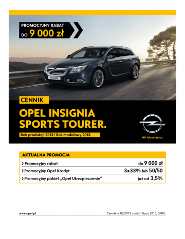 PROMOCYJNY RABAT DO 9 000 zł Cennik OPEL INSIGNIA SPORTS TOURER. Rok produkcji 2013 / Rok modelowy 2013. AKTUALNA PROMOCJA Promocyjny rabat Promocyjny Opel Kredyt Promocyjny pakiet „Opel Ubezpieczenie” www.opel.pl do 9 000 zł 3x33% lub 50/50 już od 3,5% Cennik nr 03/2013 z dnia 1 lipca 2013, GMPL Cennik – Opel Insignia Sports Tourer Rok produkcji 2013, rok modelowy 2013 Ceny promocyjne* Insignia Edition Cosmo Sport 1.8 Twinport Ecotec (140 KM) M6 86 550 93 150 ― ― 1.4 Turbo Ecotec (140 KM) Start/Stop M6 89 550 96 150 104 450 ― 1.4 Turbo LPG Ecotec (140 KM) M6 96 150 102 750 111 050 ― 1.6 Turbo Ecotec (180 KM) M6 ― 99 650 107 950 109 900 2.0 Turbo Ecotec (220 KM) M6 ― 108 150 116 450 118 400 2.0 Turbo Ecotec (220 KM) A6 ― 114 650 122 950 124 900 2.0 Turbo Ecotec (250 KM) 4x4 M6 ― ― 131 050 129 500 2.0 Turbo Ecotec (250 KM) 4x4 A6 ― ― 137 550 136 000 2.8 Turbo Ecotec (260 KM) 4x4 A6 ― ― 169 450 168 900 2.0 CDTI Ecotec (110 KM) M6 94 550 ― ― ― 2.0 CDTI Ecotec (130 KM) M6 95 550 102 150 110 450 ― 2.0 CDTI Ecotec (130 KM) Start/Stop M6 96 950 103 550 111 850 ― 2.0 CDTI Ecotec (130 KM) A6 ― 108 650 116 950 ― 2.0 CDTI Ecotec (160 KM) M6 ― 104 150 112 450 114 400 2.0 CDTI Ecotec (160 KM) A6 ― 110 650 118 950 120 900 2.0 CDTI Ecotec (160 KM) 4x4 M6 ― 117 150 125 450 123 900 2.0 CDTI Ecotec (160 KM) 4x4 A6 ― 123 650 131 950 130 400 2.0 CDTI EcoFLEX (160 KM) Start/Stop M6 ― 107 500 115 350 ― 2.0 CDTI BiTurbo Ecotec (195 KM) Start/Stop M6 ― ― 123 350 125 300 2.0 CDTI BiTurbo Ecotec (195 KM) A6 ― ― 128 450 130 400 2.0 CDTI BiTurbo Ecotec (195 KM) 4x4 Start/Stop M6 ― ― 136 350 134 800 2.0 CDTI BiTurbo Ecotec (195 KM) 4x4 A6 ― ― 141 450 139 900 * Liczba modeli w promocji ograniczona. Promocja dostępna do wyczerpania zapasów. Dokładny opis całej oferty promocyjnej znajduje się na stronie www.opel.pl w sekcji promocje lub dostępny jest u Autoryzowanego Dystrybutora marki Opel. Ceny promocyjne dotyczą klientów indywidualnych. Klientów flotowych w sprawie zapytań ofertowych prosimy o kontakt z wybranym Autoryzowanym Dystrybutorem marki Opel. Ceny katalogowe Insignia Edition Cosmo Sport 95 550 102 150 ― ― ― 1.8 Twinport Ecotec (140 KM) M6 1.4 Turbo Ecotec (140 KM) Start/Stop M6 98 550 105 150 113 450 1.4 Turbo LPG Ecotec (140 KM) M6 105 150 111 750 120 050 ― 1.6 Turbo Ecotec (180 KM) M6 ― 108 650 116 950 118 900 2.0 Turbo Ecotec (220 KM) M6 ― 117 150 125 450 127 400 2.0 Turbo Ecotec (220 KM) A6 ― 123 650 131 950 133 900 2.0 Turbo Ecotec (250 KM) 4x4 M6 ― ― 140 050 138 500 2.0 Turbo Ecotec (250 KM) 4x4 A6 ― ― 146 550 145 000 2.8 Turbo Ecotec (260 KM) 4x4 A6 ― ― 178 450 177 900 2.0 CDTI Ecotec (110 KM) M6 103 550 ― ― ― 2.0 CDTI Ecotec (130 KM) M6 104 550 111 150 119 450 ― 2.0 CDTI Ecotec (130 KM) Start/Stop M6 105 950 112 550 120 850 ― 2.0 CDTI Ecotec (130 KM) A6 ― 117 650 125 950 ― 2.0 CDTI Ecotec (160 KM) M6 ― 113 150 121 450 123 400 2.0 CDTI Ecotec (160 KM) A6 ― 119 650 127 950 129 900 2.0 CDTI Ecotec (160 KM) 4x4 M6 ― 126 150 134 450 132 900 2.0 CDTI Ecotec (160 KM) 4x4 A6 ― 132 650 140 950 139 400 2.0 CDTI EcoFLEX (160 KM) Start/Stop M6 ― 116 050 124 350 ― 2.0 CDTI BiTurbo Ecotec (195 KM) Start/Stop M6 ― ― 132 350 134 300 2.0 CDTI BiTurbo Ecotec (195 KM) A6 ― ― 137 450 139 400 2.0 CDTI BiTurbo Ecotec (195 KM) 4x4 Start/Stop M6 ― ― 145 350 143 800 2.0 CDTI BiTurbo Ecotec (195 KM) 4x4 A6 ― ― 150 450 148 900 Cennik Opla Insignii Sports Tourer, rok produkcji 2013, rok modelowy 2013, nr 03/2012 z dnia 1 lipca 2013 1/4 Wyposażenie standardowe Tapicerka materiałowa czarna Labirynth. Zawiera: komfortowe fotele przednie. System stabilizacji toru jazdy ESP® Poduszki powietrzne przednie, boczne i kurtynowe Klimatyzacja jednostrefowa sterowana manualnie Radioodtwarzacz CD/MP3 300 Zdalnie sterowany zamek centralny Elektrycznie sterowane szyby z przodu Stalowe obręcze kół 6,5Jx16" z oponami 215/60 R16 95V (w zależności od wersji silnikowej) Stalowe obręcze kół 7,0Jx17" z oponami 225/55 R17 97W (w zależności od wersji silnikowej) Elektryczna regulacja wysokości fotela kierowcy Elektrycznie sterowane i podgrzewane lusterka zewnętrzne Relingi dachowe, czarne Tapicerka materiałowa czarna lub beżowa Dune. Zawiera: komfortowe fotele przednie. Klimatyzacja jednostrefowa sterowana elektronicznie Strukturalne obręcze kół 7Jx17", z oponami 225/55 R17 97W (w wersji Insignia opony całoroczne, w wersji Edition w zależności od wersji silnikowej) Elektrycznie sterowane szyby z tyłu Kierownica trójramienna pokryta skórą Elektryczna regulacja podparcia lędźwiowego fotela kierowcy Podłokietnik tylny z otworem na długie przedmioty Gniazdko 12V w konsoli centralnej / z tyłu konsoli środkowej Czujnik deszczu Tempomat Zestaw „Dobrej Widoczności”. Zawiera: automatyczne sterowanie światłami z czujnikiem oświetlenia, czujnik deszczu, światłoczułe lusterko wewnętrzne. Relingi dachowe, srebrne Pakiet Bezpieczeństwa. Zawiera: aktywne zagłówki foteli przednich, system przypominania o zapięciu pasów bezpieczeństwa z przodu. Tapicerka materiałowa czarna lub beżowa z elementami ze skóry ekologicznej Morrocana-Ribbon. Zawiera: komfortowe fotele przednie. Elektryczna regulacja wysokości i podparcia lędźwiowego fotela kierowcy Podgrzewane fotele przednie Klimatyzacja dwustrefowa sterowana elektronicznie Radioodtwarzacz CD/MP3 400 Złącze USB dla urządzeń zewnętrznych Obręcze kół ze stopów lekkich 8,0Jx18", z oponami 245/45 R18 96W Insignia Edition Cosmo Sport C68 S S S S S S S S/― S/― S S S ― 1 900 ― S S ― S S S P/― S/P/― S S ― S S ― S S ― ― S S ― ― S S ― ― ― ― S S ― ― S S ― ― S S ― ― ― QR8/QJF 1 750 S/― ― ― AER K34 ― ― P ― ―/S ― 1 200/P S S S S P/S S S S S S S S S S S ― S S P/S S S TSQ ― S S S V3E ― S S S OCY 400 S S S TAEJ/TAEK ― ― S ― A6B P P ― 800 200 P 80