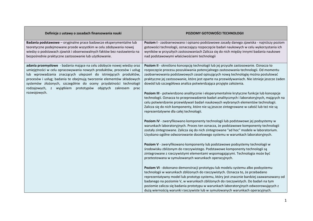 Definicje z ustawy o zasadach finansowania nauki POZIOMY GOTOWOŚCI TECHNOLOGII Badania podstawowe – oryginalne prace badawcze eksperymentalne lub teoretyczne podejmowane przede wszystkim w celu zdobywania nowej wiedzy o podstawach zjawisk i obserwowalnych faktów bez nastawienia na bezpośrednie praktyczne zastosowanie lub użytkowanie. Poziom I - zaobserwowano i opisano podstawowe zasady danego zjawiska - najniższy poziom gotowości technologii, oznaczający rozpoczęcie badań naukowych w celu wykorzystania ich wyników w przyszłych zastosowaniach Zalicza się do nich między innymi badania naukowe nad podstawowymi właściwościami technologii adania przemysłowe - badania mające na celu zdobycie nowej wiedzy oraz umiejętności w celu opracowywania nowych produktów, procesów i usług lub wprowadzania znaczących ulepszeń do istniejących produktów, procesów i usług; badania te obejmują tworzenie elementów składowych systemów złożonych, szczególnie do oceny przydatności technologii rodzajowych, z wyjątkiem prototypów objętych zakresem prac rozwojowych. Poziom II - określono koncepcję technologii lub jej przyszłe zastosowanie. Oznacza to rozpoczęcie procesu poszukiwania potencjalnego zastosowania technologii. Od momentu zaobserwowania podstawowych zasad opisujących nową technologię można postulować praktyczne jej zastosowanie, które jest oparte na przewidywaniach. Nie istnieje jeszcze żaden dowód lub szczegółowa analiza potwierdzająca przyjęte założenia. Poziom III - potwierdzono analitycznie i eksperymentalnie krytyczne funkcje lub koncepcje technologii. Oznacza to przeprowadzenie badań analitycznych i laboratoryjnych, mających na celu potwierdzenie przewidywań badań naukowych wybranych elementów technologii. Zalicza się do nich komponenty, które nie są jeszcze zintegrowane w całość lub też nie są reprezentatywne dla całej technologii. Poziom IV - zweryfikowano komponenty technologii lub podstawowe jej podsystemy w warunkach laboratoryjnych. Proces ten oznacza, że podstawowe komponenty technologii zostały zintegrowane. Zalicza się do nich zintegrowane "ad hoc" modele w laboratorium. Uzyskano ogólne odwzorowanie docelowego systemu w warunkach laboratoryjnych. Poziom V - zweryfikowano komponenty lub podstawowe podsystemy technologii w środowisku zbliżonym do rzeczywistego. Podstawowe komponenty technologii są zintegrowane z rzeczywistymi elementami wspomagającymi. Technologia może być przetestowana w symulowanych warunkach operacyjnych. Poziom VI - dokonano demonstracji prototypu lub modelu systemu albo podsystemu technologii w warunkach zbliżonych do rzeczywistych. Oznacza to, że przebadano reprezentatywny model lub prototyp systemu, który jest znacznie bardziej zaawansowany od badanego na poziomie V, w warunkach zbliżonych do rzeczywistych. Do badań na tym poziomie zalicza się badania prototypu w warunkach laboratoryjnych odwzorowujących z dużą wiernością warunki rzeczywiste lub w symulowanych warunkach operacyjnych. 1 Prace rozwojowe – nabywanie, łączenie, kształtowanie i wykorzystywanie dostępnej aktualnie wiedzy i umiejętności z dziedziny nauki, technologii i działalności gospodarczej oraz innej wiedzy i umiejętności do planowania produkcji oraz tworzenia i projektowania nowych, zmienionych lub ulepszonych produktów, procesów i usług, w szczególności: a. tworzenie projektów, rysunków, planów oraz innej dokumentacji do tworzenia nowych produktów, procesów i usług, pod warunkiem że nie są one przeznaczone do celów komercyjnych; b. opracowywanie prototypów o potencjalnym wykorzystaniu komercyjnym oraz projektów pilotażowych, w przypadkach gdy prototyp stanowi końcowy produkt komercyjny, a jego produkcja wyłącznie do celów demonstracyjnych i walidacyjnych jest zbyt kosztowna. W przypadku gdy prototypy mają być następnie wykorzystywane do celów komercyjnych, wszelkie dochody w okresie 3 lat od zakończenia projektu uzyskane z tego tytułu należy odjąć od kwoty kosztów kwalifikowanych pomocy publicznej (do limitu kwoty dofinansowania przeznaczonej na prototyp o potencjalnym wykorzystaniu komercyjnym); Poziom VII - dokonano demonstracji prototypu technologii w warunkach operacyjnych. Prototyp jest już prawie na poziomie systemu operacyjnego. Poziom ten reprezentuje znaczący postęp w odniesieniu do poziomu VI i wymaga zademonstrowania, że rozwijana technologia jest możliwa do zastosowania w warunkach operacyjnych. Do badań na tym poziomie zalicza się badania prototypów na tzw. platformach badawczych. Poziom VIII - zakończono badania i demonstrację ostatecznej formy technologii. Oznacza to, że potwierdzono, że docelowy poziom technologii został osiągnięty i technologia może być zastosowana w przewidywanych dla niej warunkach. Praktycznie poziom ten reprezentuje koniec demonstracji. Przykłady obejmują badania i ocenę systemów w celu potwierdzenia spełnienia założeń projektowych, włączając w to założenia odnoszące się do zabezpieczenia logistycznego i szkolenia. Poziom IX - sprawdzenie technologii w warunkach rzeczywistych odniosło zamierzony efekt. Wskazuje to, że demonstrowana technologia jest już w ostatecznej formie i może zostać zaimplementowana w docelowym systemie. Między innymi dotyczy to wykorzystania opracowanych systemów w warunkach rzeczywistych c. działalność związana z produkcją eksperymentalną oraz testowaniem produktów, procesów i usług, pod warunkiem że nie są one wykorzystywane komercyjnie. 2