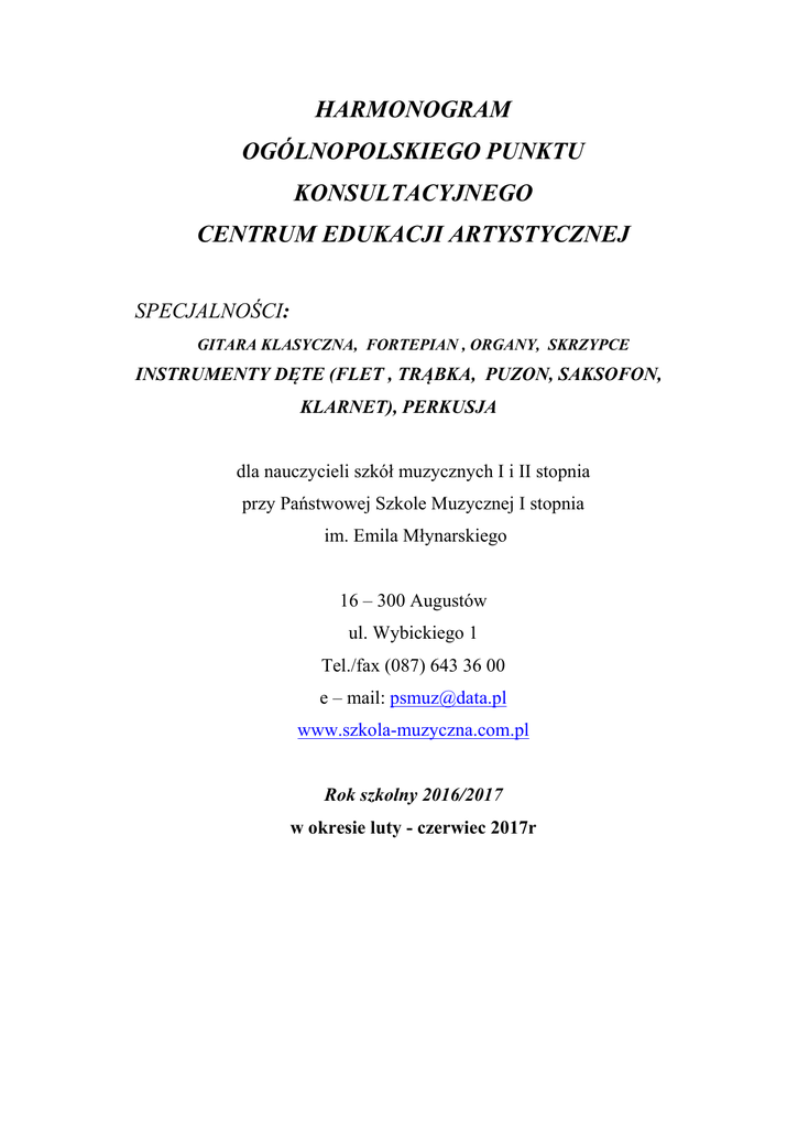HARMONOGRAM OGÓLNOPOLSKIEGO PUNKTU KONSULTACYJNEGO CENTRUM EDUKACJI ARTYSTYCZNEJ SPECJALNOŚCI: GITARA KLASYCZNA, FORTEPIAN , ORGANY, SKRZYPCE INSTRUMENTY DĘTE (FLET , TRĄBKA, PUZON, SAKSOFON, KLARNET), PERKUSJA dla nauczycieli szkół muzycznych I i II stopnia przy Państwowej Szkole Muzycznej I stopnia im. Emila Młynarskiego 16 – 300 Augustów ul. Wybickiego 1 Tel./fax (087) 643 36 00 e – mail: [email protected] www.szkola-muzyczna.com.pl Rok szkolny 2016/2017 w okresie luty - czerwiec 2017r Terminarz seminariów, konsultacji i lekcji otwartych Fortepian – Augustów Termin 17-18 marca 2017 17-18 marca 2017 Prowadzący Temat prof. Alicja Paleta – Bugaj „Rozwój wyobraźni muzycznej na przykładzie utworów klasycznych i romantycznych” „Rady dla kształcącej się młodzieży w mgr Anna Borkowska oparciu o wskazówki Roberta Szumana” 07-08 kwietnia 2017 prof. Grzegorz Kurzyński 07-08 kwietnia 2017 mgr Anna Borkowska 23-24 kwietnia 2017 prof. Zbigniew Raubo „Stylowość wykonań utworów okresu klasycznego” „ Tonacje ich cechy” „ Problemy z budową ekspresyjności w XIX wiecznej literaturze fortepianowej” Fortepian – Inowrocław Termin Prowadzący 08-09 maja 2017 mgr Anna Borkowska „Rady dla kształcącej się młodzieży w oparciu o wskazówki Roberta Szumana” 12-13 maja 2017 prof. Waldemar Wojtal „Problemy artykulacyjne w literaturze fortepianowej różnych epok”. 20-21 maja 2017 prof. Andrzej Tatarski „Problemy interpretacyjne współczesnej literatury fortepianowej” Temat Fortepian – Stalowa Wola Termin Prowadzący 24 - 25 lutego 2017r. dr hab. Mariusz Drzewicki "Ekspresja muzyczna w kontekście stylowej interpretacji utworów fortepianowych XIX wieku". 21-22 kwietnia 2017 prof. Robert Marat „Sposób prowadzenia kantyleny w utworach od baroku do współczesności”. Temat Fortepian – Kielce Termin Prowadzący Temat 13-14 marca 2017r prof. Bogumiła GizbertStudnicka prof. Wojciech Świtała „Ornamentacja w muzyce epoki baroku”. „Problemy wykonawcze w utworach fortepianowych C. Debussy’ego.” 28 marca 2017r Fortepian – Elbląg Termin Prowadzący Temat 3-4 marca 2017 mgr Anna Borkowska „Rady dla kształcącej się młodzieży w oparciu o wskazówki Roberta Szumana” Gitara – Augustów Prowadzący Termin 31 marca – 01 kwietnia 2017r 31 marca – 01 kwietnia 2017r mgr Jarosław Kocoń prof. Piotr Zaleski 23-24 kwietnia 2017 r. st.wykł Ryszard Bałauszko 23-24 kwietnia 2017 r dr. hab. Marek Nosal 23-24 kwietnia 2017 r mgr Dariusz Michałowski Temat „Prawidłowy aparat gry podstawą do rozwoju swobodnej techniki gitarowej oraz jakości barwy dźwięku”. „Forma wariacyjna na przestrzeni wieków”. „Artykulacja i dynamika w budowaniu ekspresyjności gry". „Bogactwo brzmieniowe gitary w aspekcie interpretacyjnym i wykonawczym”. „Budowa własnej wypowiedzi muzycznej ucznia w trakcie pracy nad utworami” Gitara – Ostrów Wielkopolski Termin Prowadzący Temat 11-12 kwietnia 2017 dr Łukasz Kuropaczewski 11-12 kwietnia 2017 mgr Jarosław Kocoń „ Podstawy ćwiczenia na gitarze. Ćwiczenia techniczne i plan pracy” „Prawidłowy aparat gry podstawą do rozwoju swobodnej techniki gitarowej oraz jakości barwy dźwięku”. 26-27 maja 2017 mgr Dariusz Michałowski „Czynniki warunkujące właściwy rozwój ucznia. Problemy warsztatowe w świetle Przesłuchań CEA”. mgr Jarosław Kocoń „Właściwa praca nad utworem oraz jej wpływ na wypowiedź muzyczną ucznia". 26-27 maja 2017 Gitara – Inowrocław Termin Prowadzący Temat 8-9 maja 2017 st.wykł Ryszard Bałauszko „Rozwój wybranych technik gitarowych w oparciu o realizowaną literaturę”. 8-9 maja 2017 mgr Dariusz Michałowski „Rozwój artystyczny ucznia na poszczególnych etapach nauczania”. Gitara – Kielce Termin 17 – 18 marca 2017r Prowadzący Temat dr Anna Pietrzak „Technika w służbie ekspresji wykonawczej”. „Gra w zespole kameralnym jako sposób na rozwinięcie muzykalności oraz zbudowanie większej odporności psychicznej uczniów podczas występów”. „Zastosowanie odpowiednich metod pracy przy rozwiązywaniu problemów wykonawczych.” 19 -20 maja 2017r mgr Witold Kozakowski 26 – 27 maja 2017r dr hab. Ewa Jabłczyńska 26 – 27 maja 2017r mgr Dariusz Kupiński „Umiejętność stosowania techniki przygotowawczej prawej i lewej ręki.” Gitara – Elbląg Termin Prowadzący Temat 03-04 marca 2017 dr Tomasz Kandulski 03-04 marca 2017 mgr Kosmowski Piotr „Technika przygotowawcza królową technik”. „Rozwiazywanie problemów wykonawczych w grze na gitarze klasycznej”. 03-04 marca 2017 mgr Dariusz Michałowski „Czynniki warunkujące właściwy rozwój ucznia. Problemy warsztatowe w świetle Przesłuchań CEA” Gitara –Leżajsk Termin Prowadzący 23-24 marca 2017 dr hab. Marek Nosal 23-24 marca 2017 mgr Dariusz Michałowski 3-4 kwietnia 2017 09-10 maja 2017 Temat „Bogactwo brzmieniowe gitary w aspekcie interpretacyjnym i wykonawczym”. „ Rozwój artystyczny ucznia na poszczególnych etapach nauczania” st. wykł. Ryszard Bałauszko „ Rozwój wybranych technik gitarowych w oparciu o realizowaną literaturę” prof. Wanda Palacz „Wykorzystanie umiejętności słuchania w pracy nad pokonywaniem trudności wykonawczych”. Instrumenty Dęte – flet poprzeczny – Olsztyn Termin 25 marca 2017 Prowadzący dr Anna Jundziłł Temat „ Problemy techniczno – interpretacyjne w repertuarze fletowym” Instrumenty Dęte – klarnet – Olsztyn Prowadzący Termin mgr Mirosława Nowak Dobrychłop 25 marca 2017 r Temat „Praca warsztatowa nad technika. Analiza i interpretacja utworów klarnetowych.” Instrumenty Dęte – trąbka – Olsztyn Prowadzący Termin prof. Roman Gryń 24-25 marca 2017 Temat „Współczesne metody nauczania w grze na trąbce” Instrumenty Dęte – puzon – Olsztyn Termin Prowadzący 09 – 10 kwietnia 2017r mgr Jacek Kasprzyk Temat „Jak śpiewać na instrumencie dętym blas